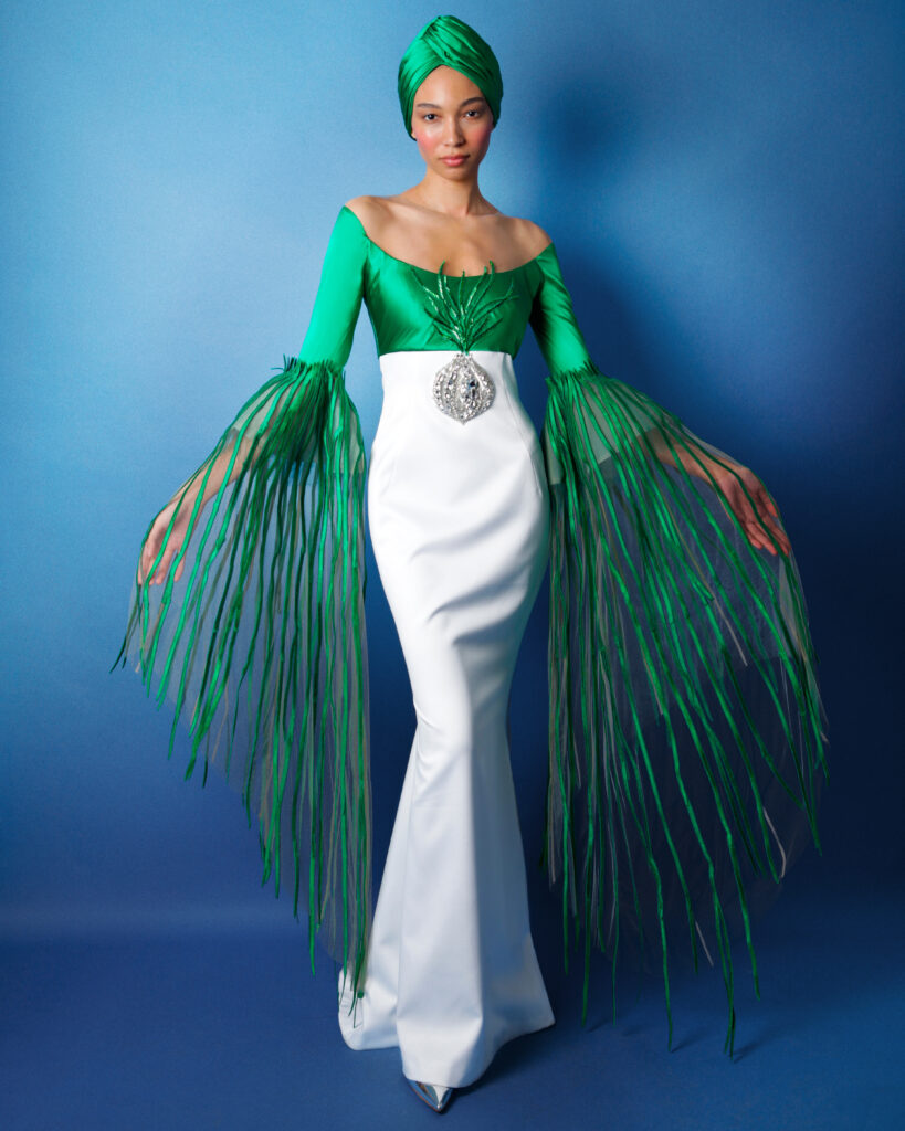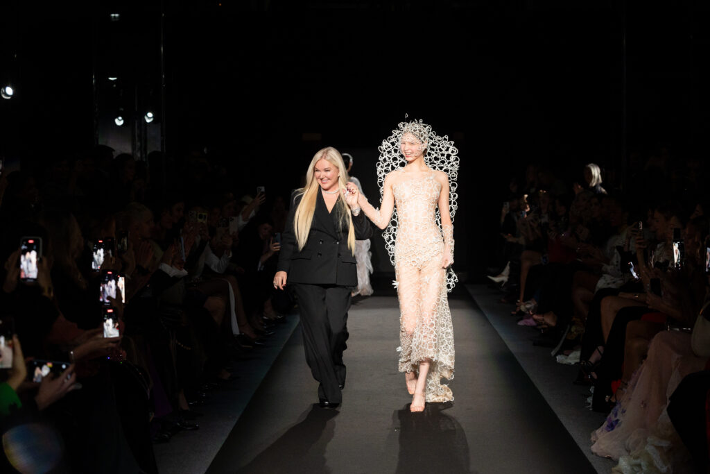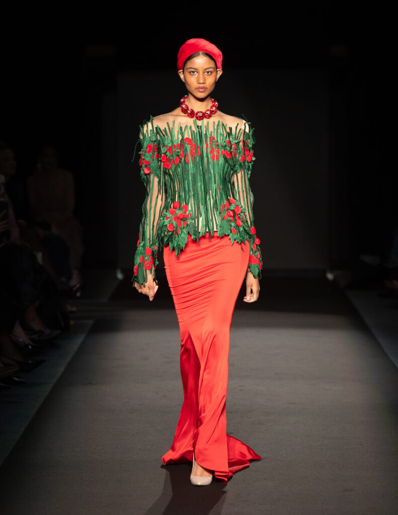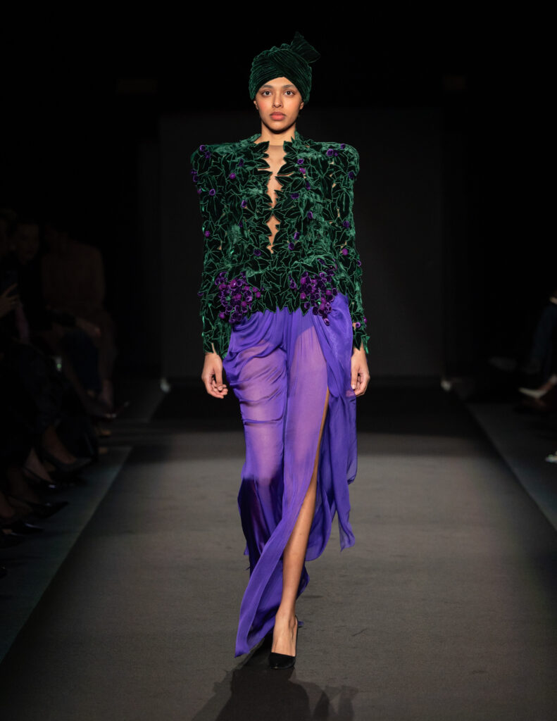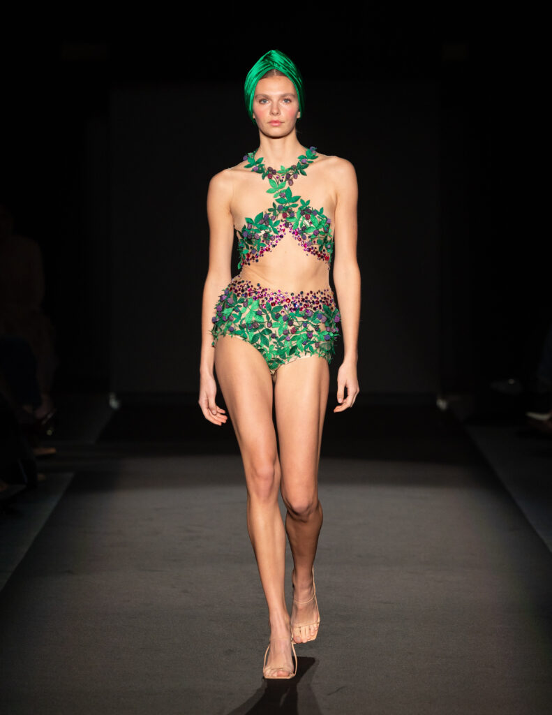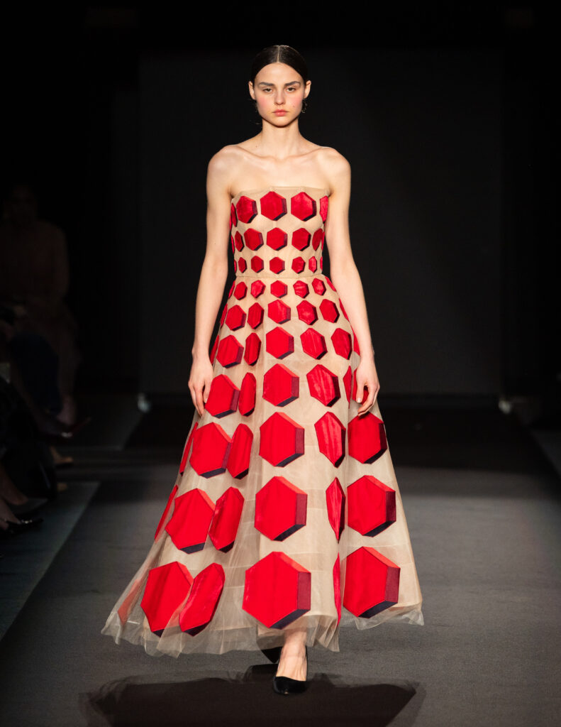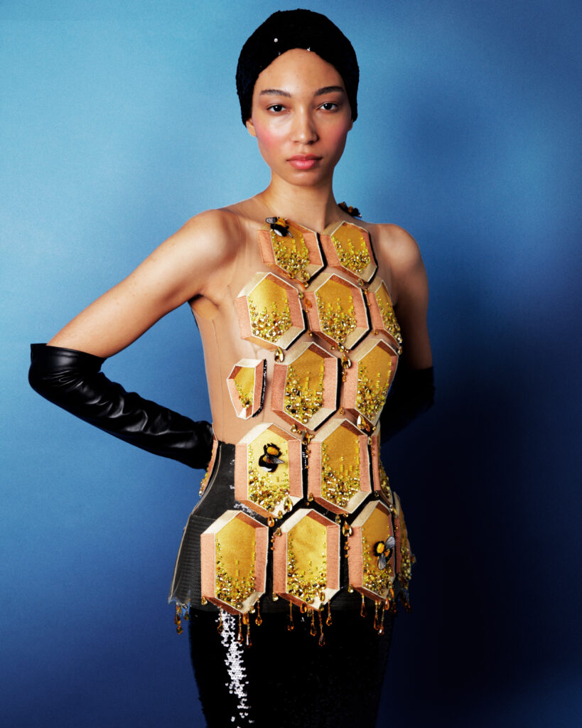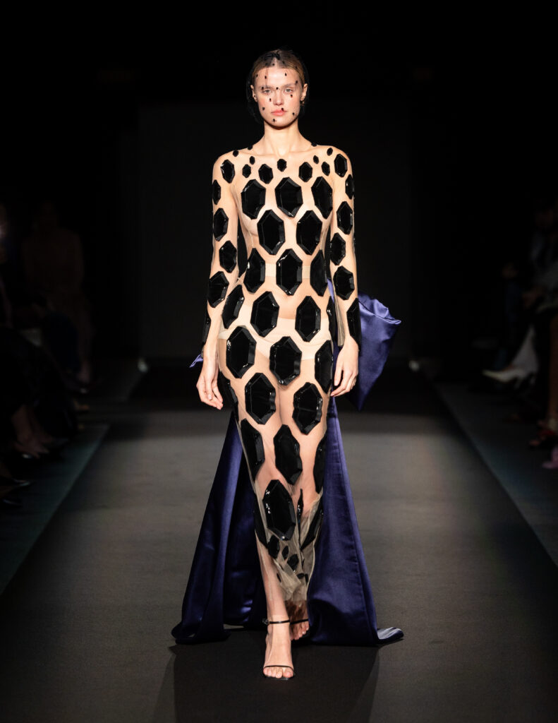 Les broderies exclusives transforment les tissus en jardins enchantés : motifs floraux en relief, grappes de baies et abeilles en trois dimensions évoquent un monde onirique. La minutie des appliqués et des décors en volume fait de chaque tenue une œuvre d’art, entre sophistication et poésie.