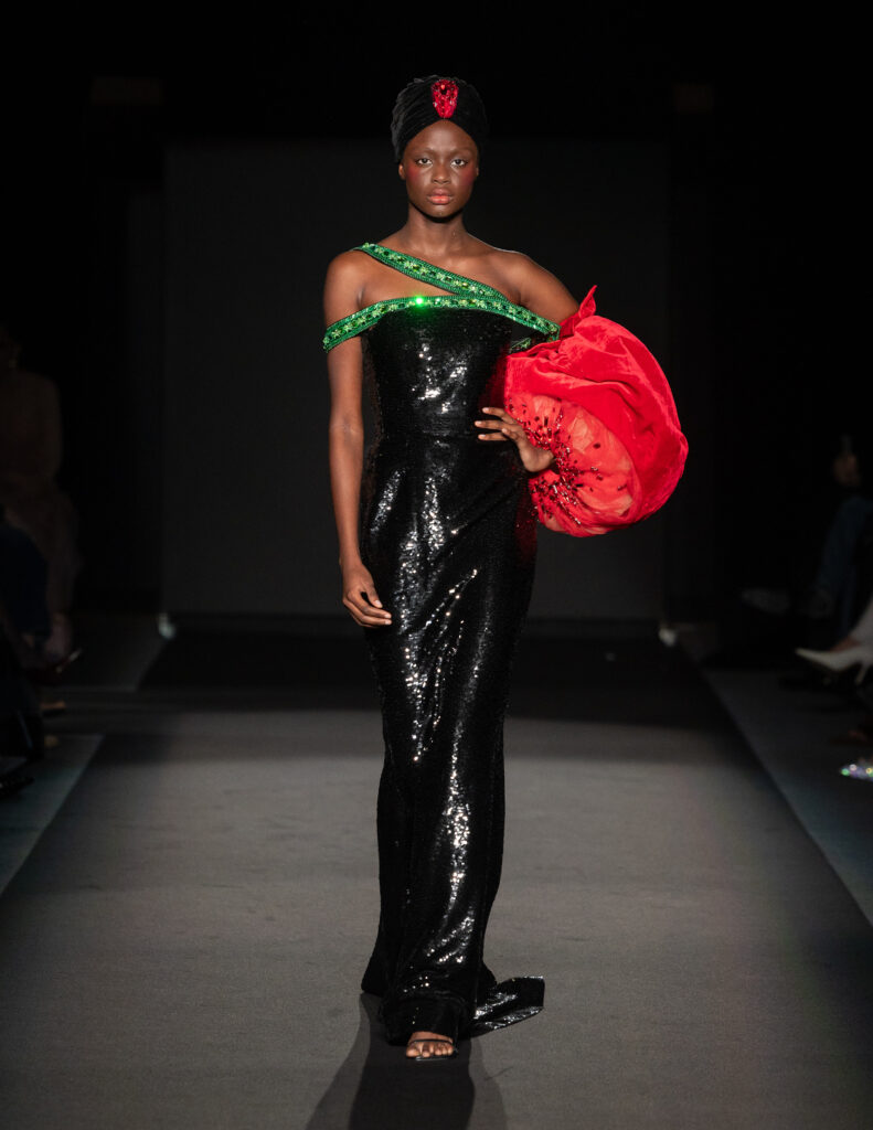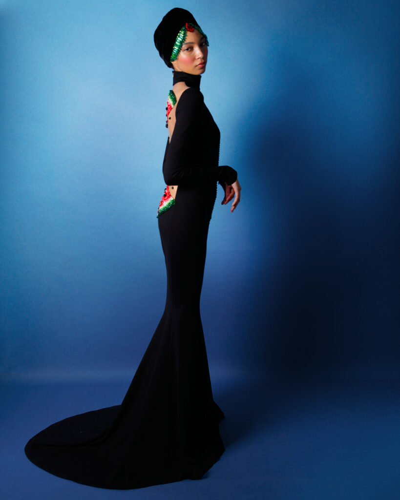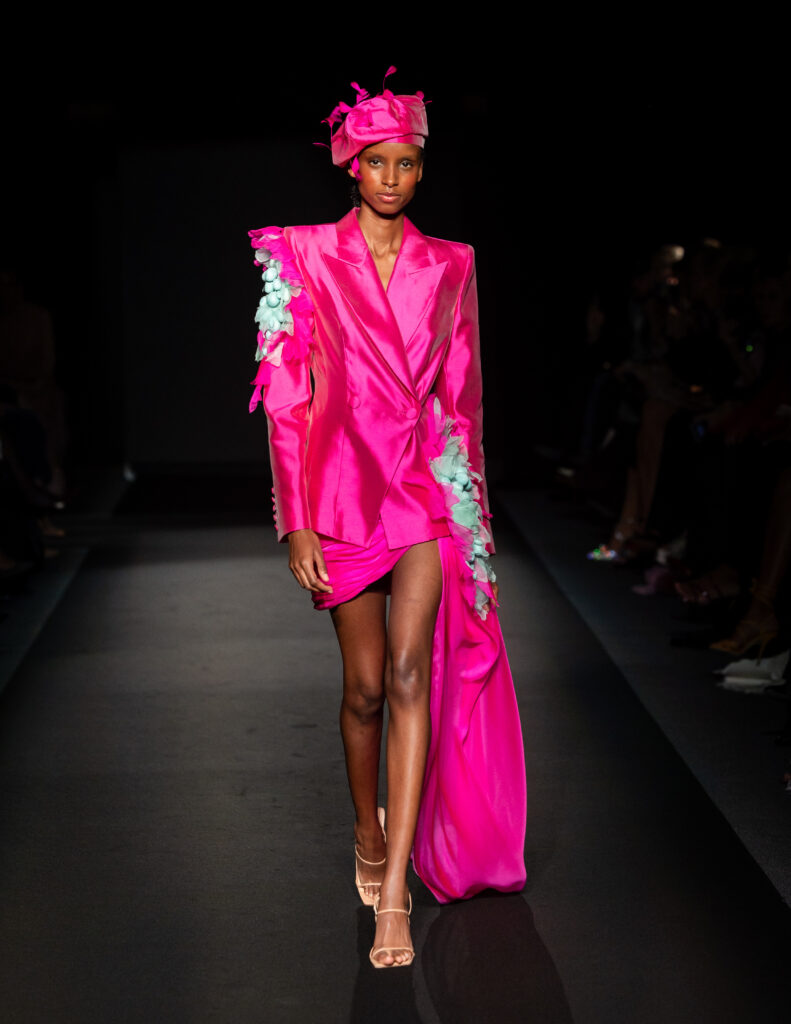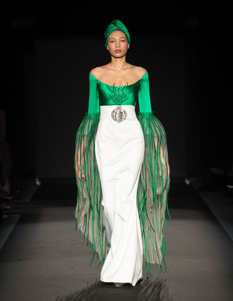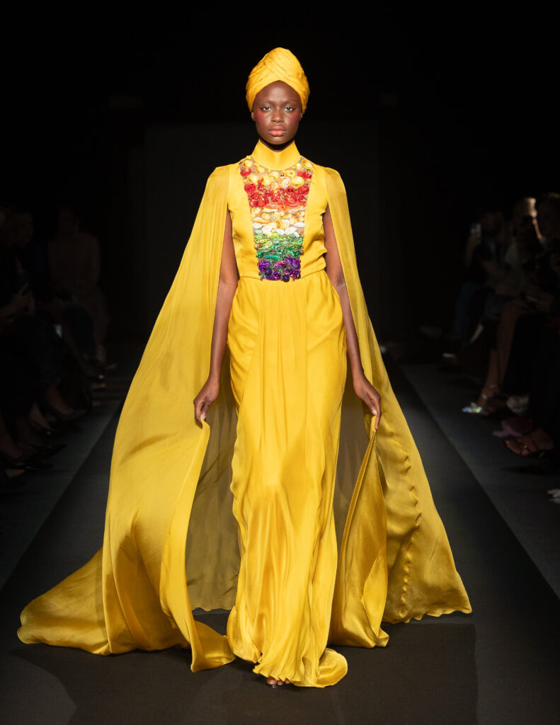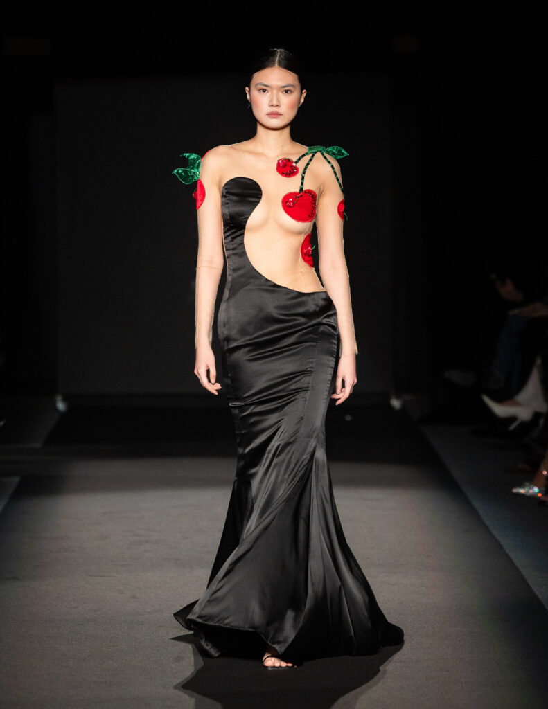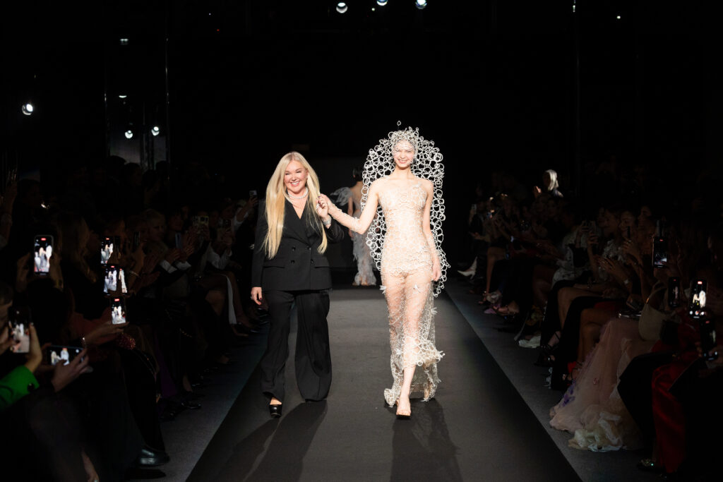 Les broderies exclusives transforment les tissus en jardins enchantés : motifs floraux en relief, grappes de baies et abeilles en trois dimensions évoquent un monde onirique. La minutie des appliqués et des décors en volume fait de chaque tenue une œuvre d’art, entre sophistication et poésie.