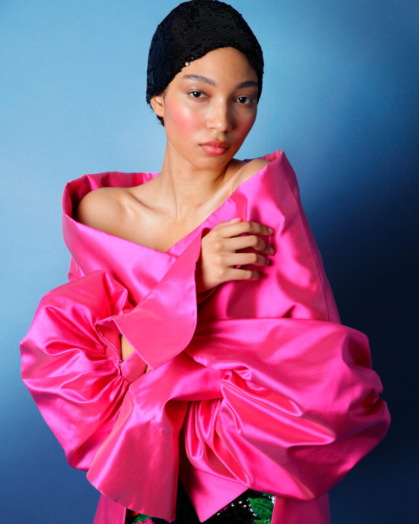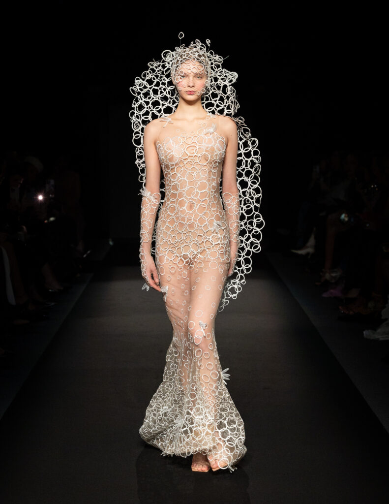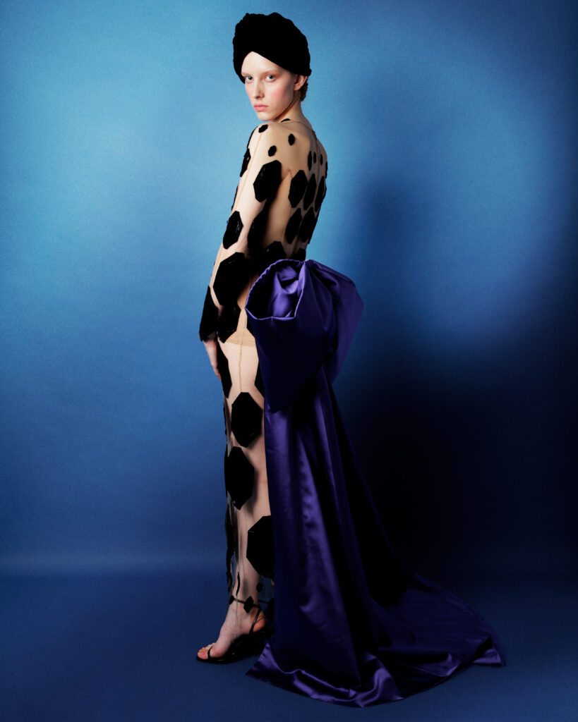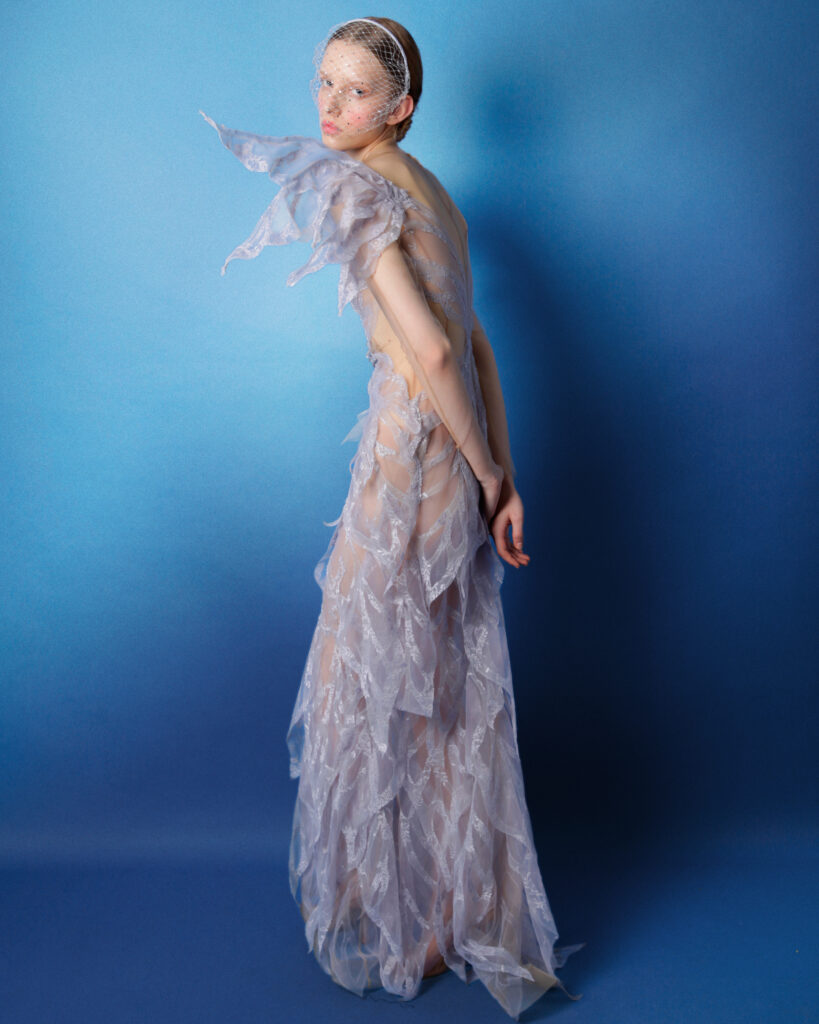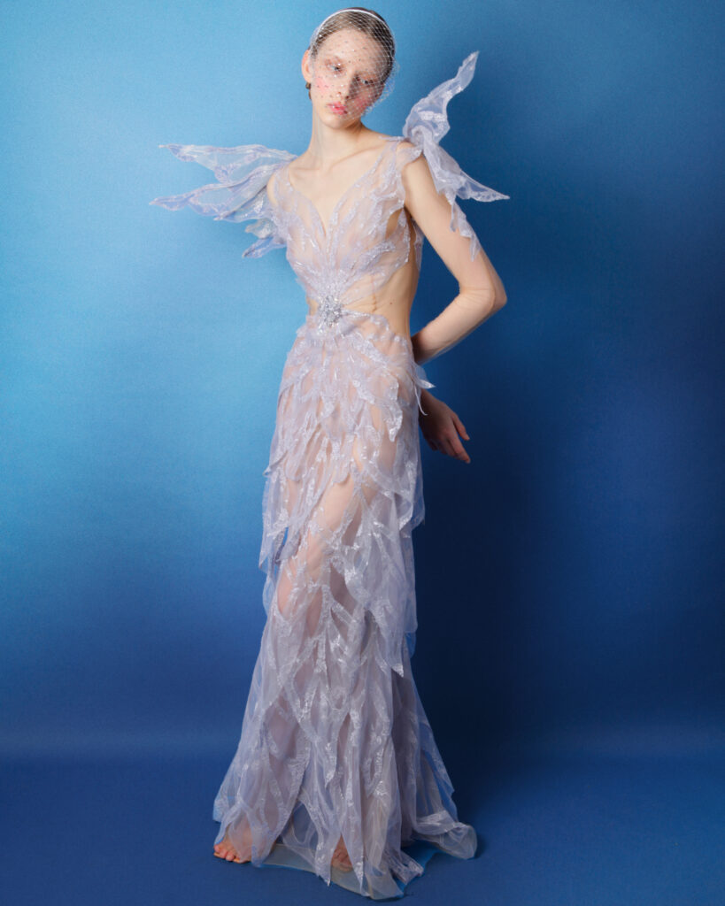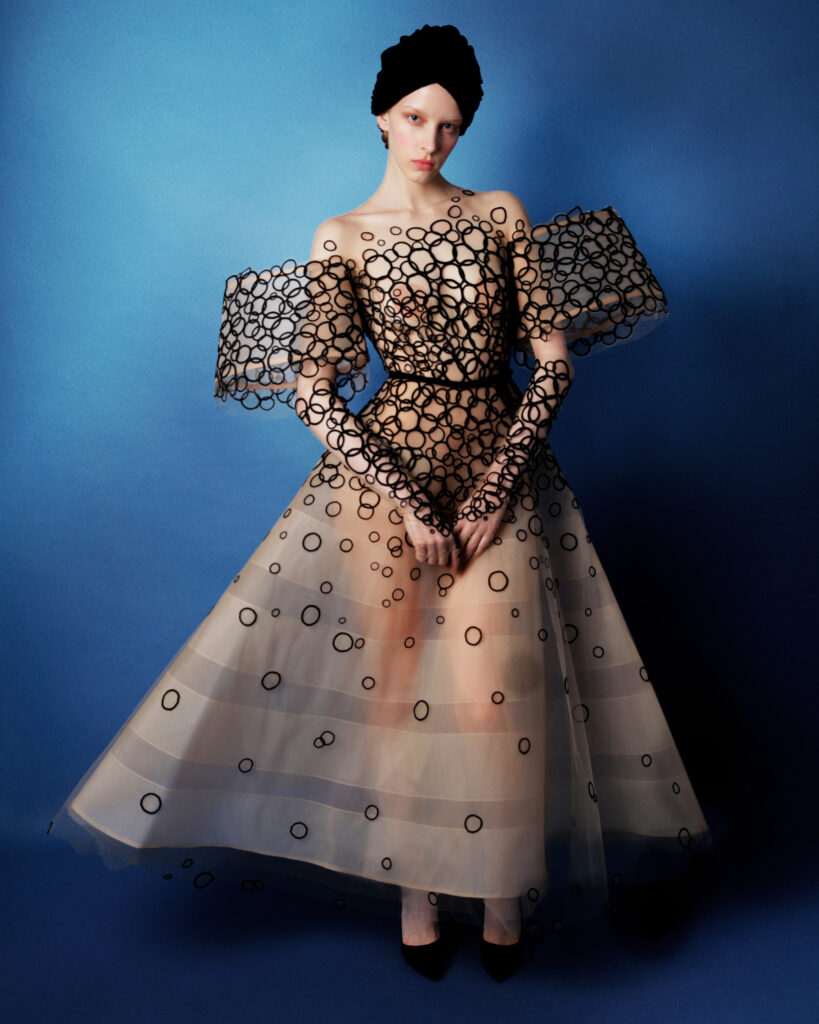 Dans cette collection, chaque pièce devient un talisman de douceur et de nostalgie. Le dernier look, vaporeux et éthéré, s’offre comme une interprétation ouverte : un rêve d’enfance, un nuage protecteur ou des bulles irisées capturant la lumière.