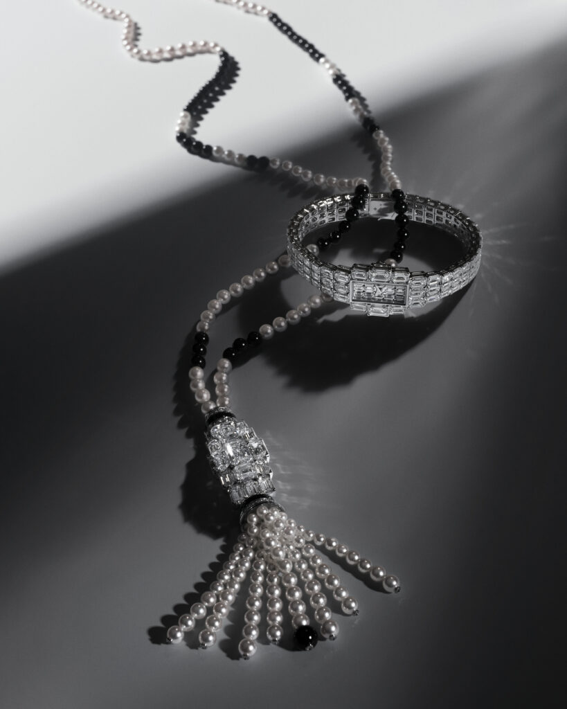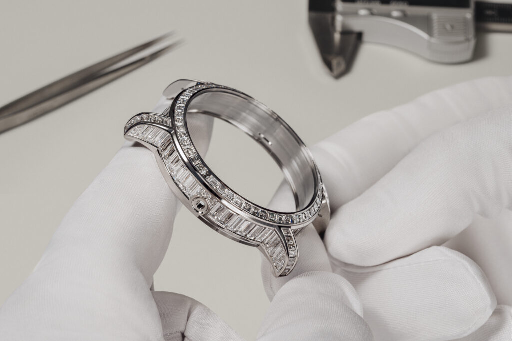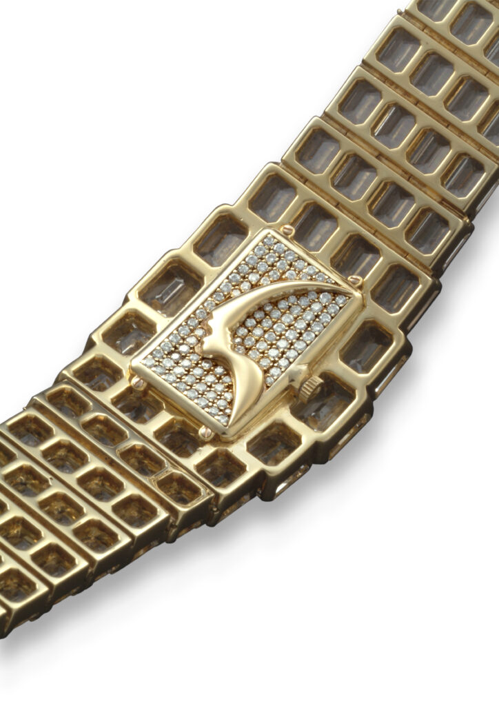 Design éblouissant : Chaque élément – des cornes au cadran en passant par la couronne – est serti de diamants taille baguette. Le cadran rayonnant évoque une corolle scintillante grâce au sertissage invisible, où les griffes métalliques disparaissent au profit d’un pavage fluide.