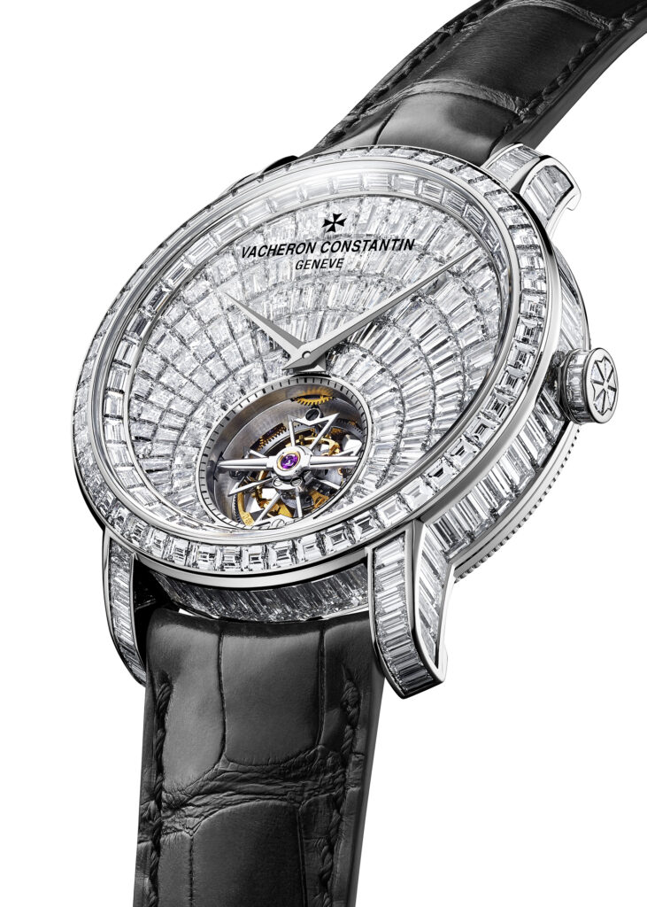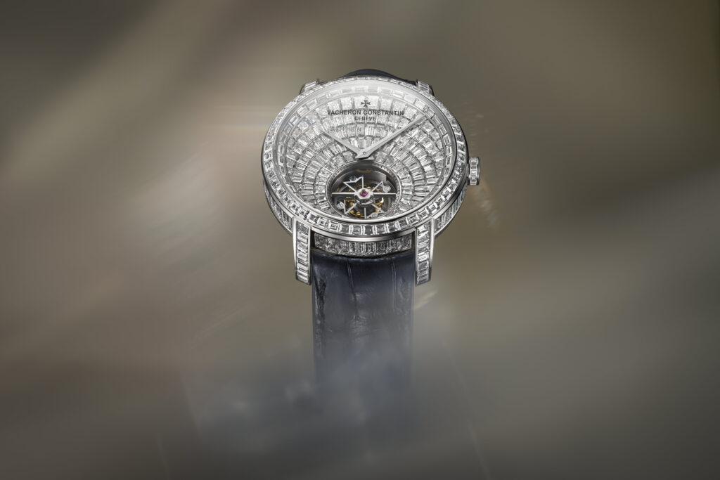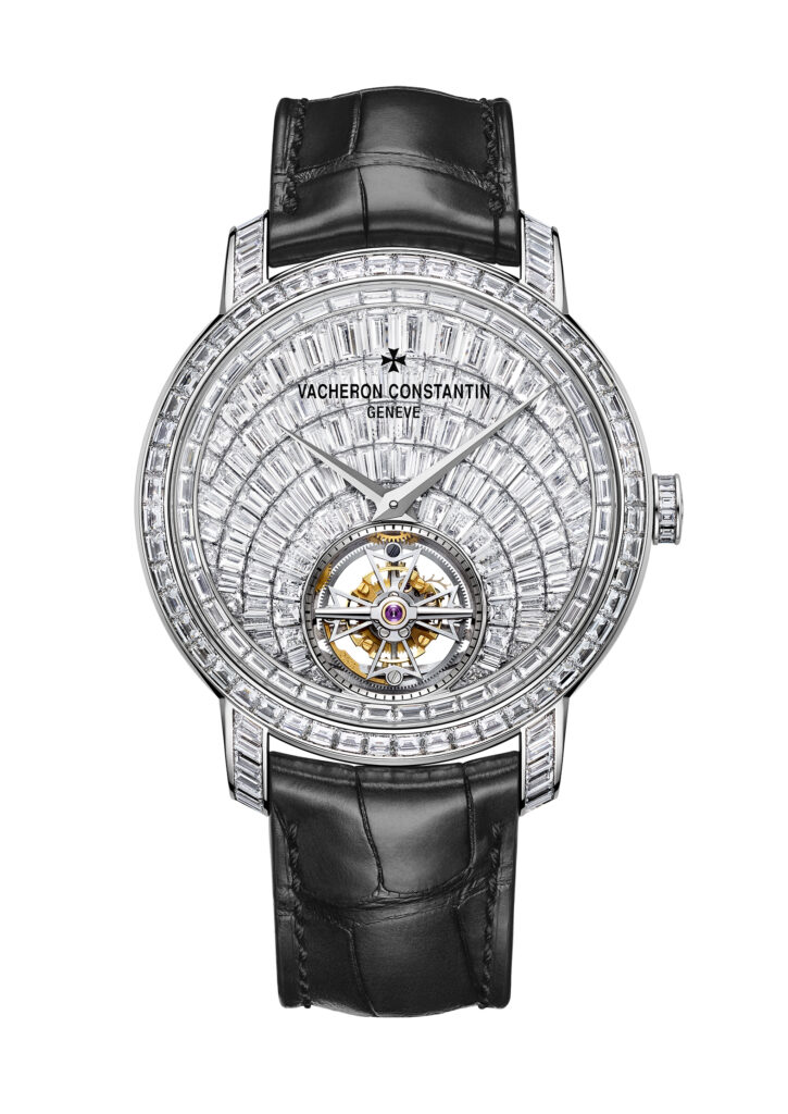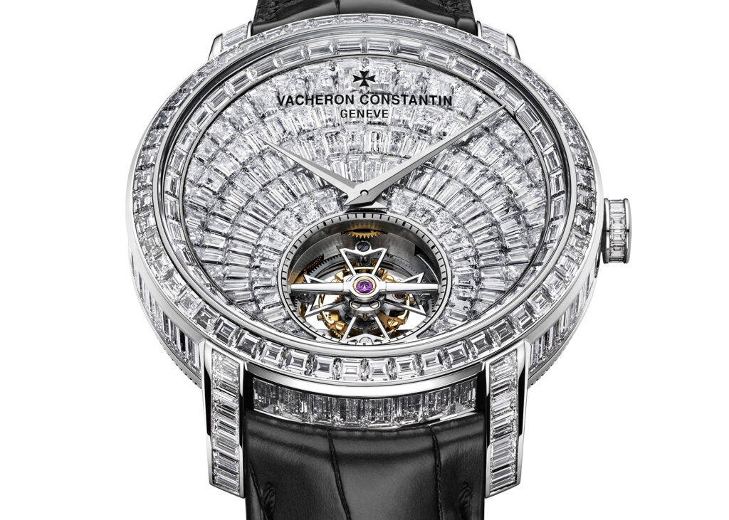Avec la Traditionnelle Tourbillon Haute Joaillerie, Vacheron Constantin marie l’excellence horlogère et le savoir-faire joaillier. Cette pièce exceptionnelle, entièrement pavée de plus de 300 diamants taille baguette (~27.11 carats), illustre la maîtrise artistique et technique de la maison genevoise, tout en étant animée par un mouvement à tourbillon ultra-plat.