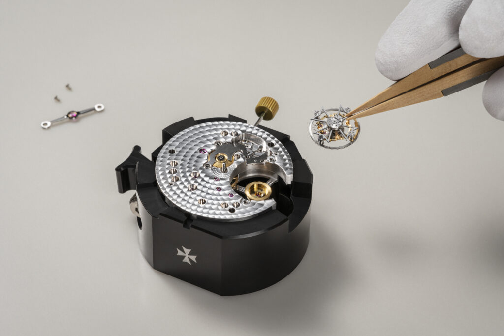 Détails artisanaux : Ponts anglés à la main, platine perlée, roues cerclées et vis polies témoignent de la quête de perfection de la Maison.