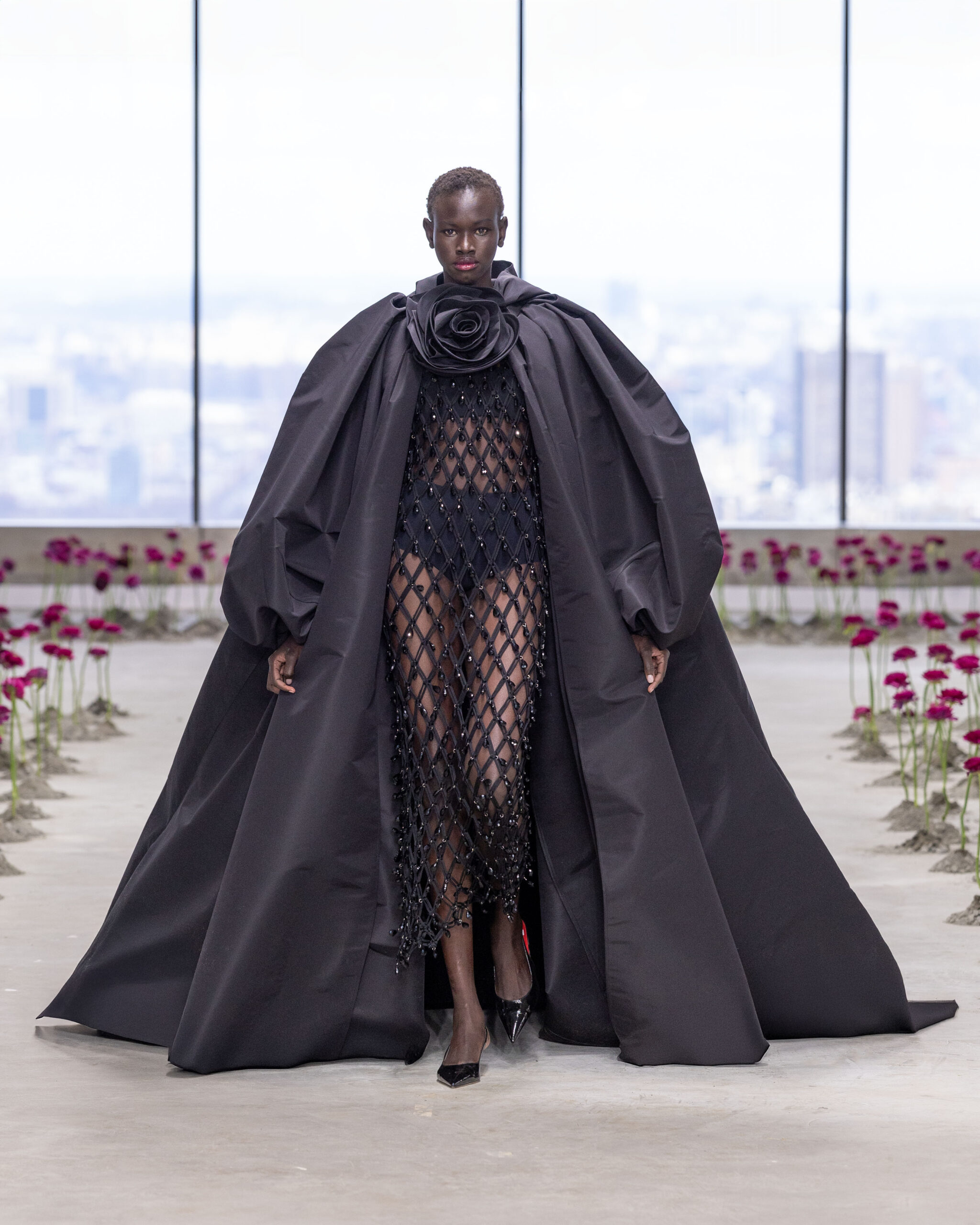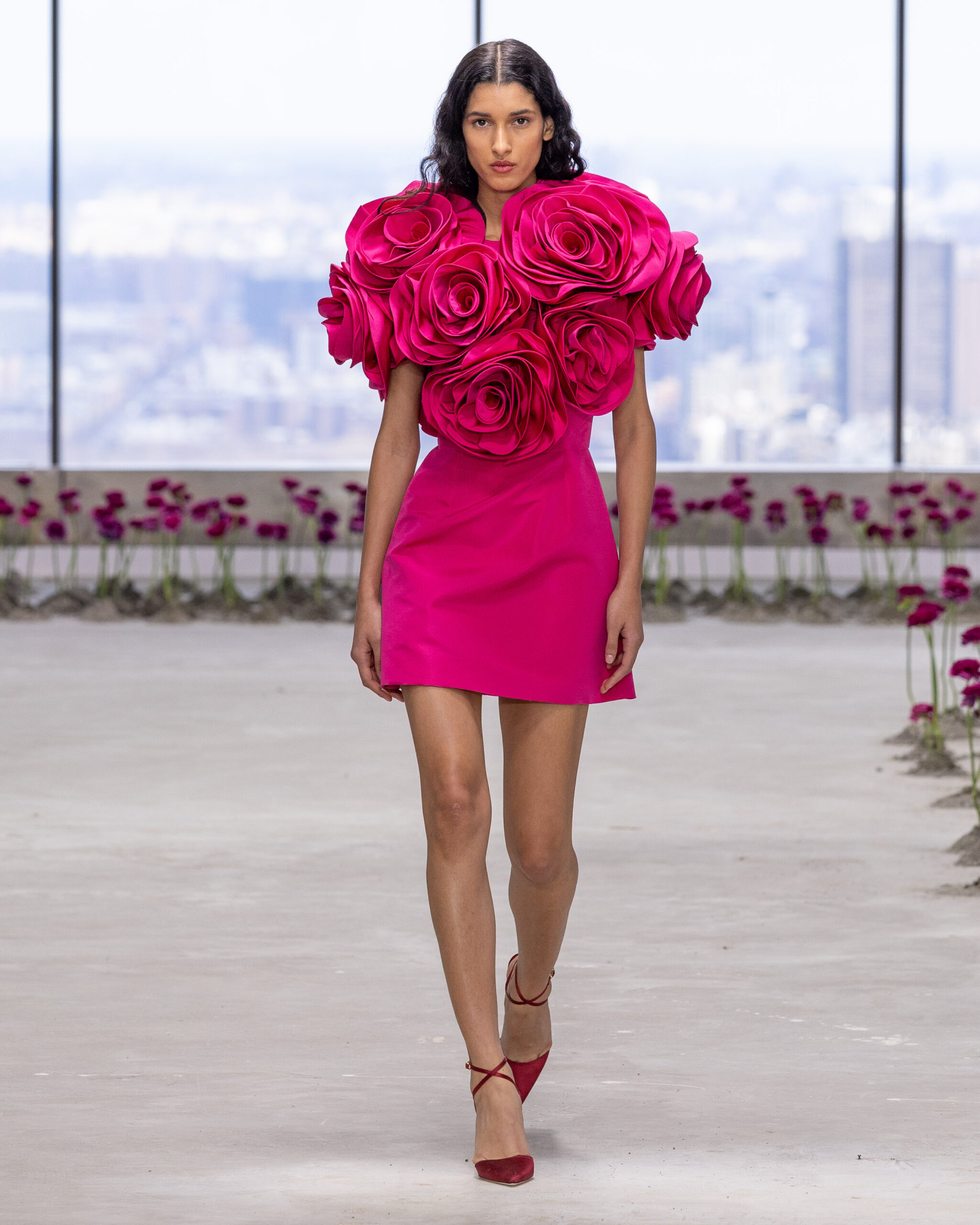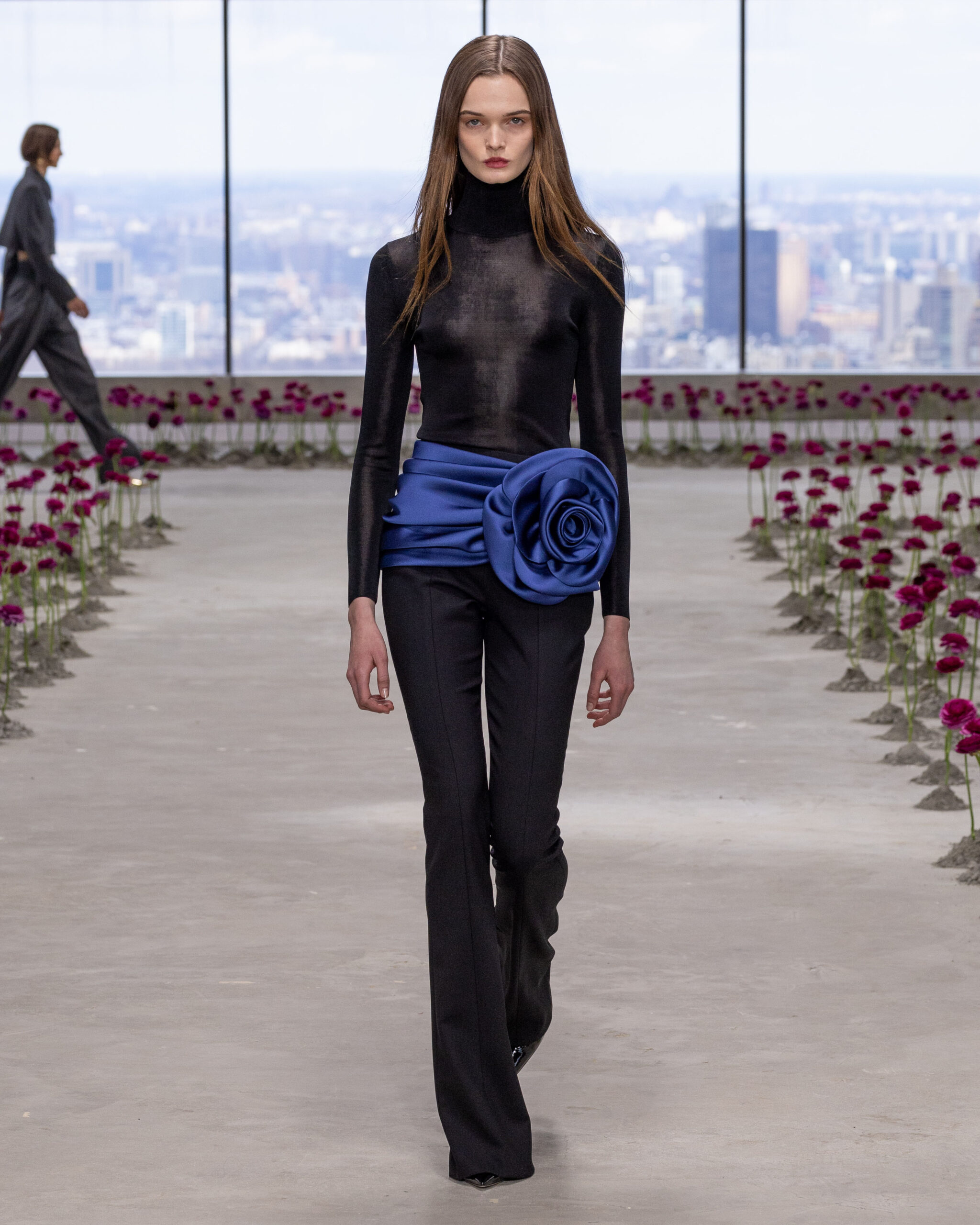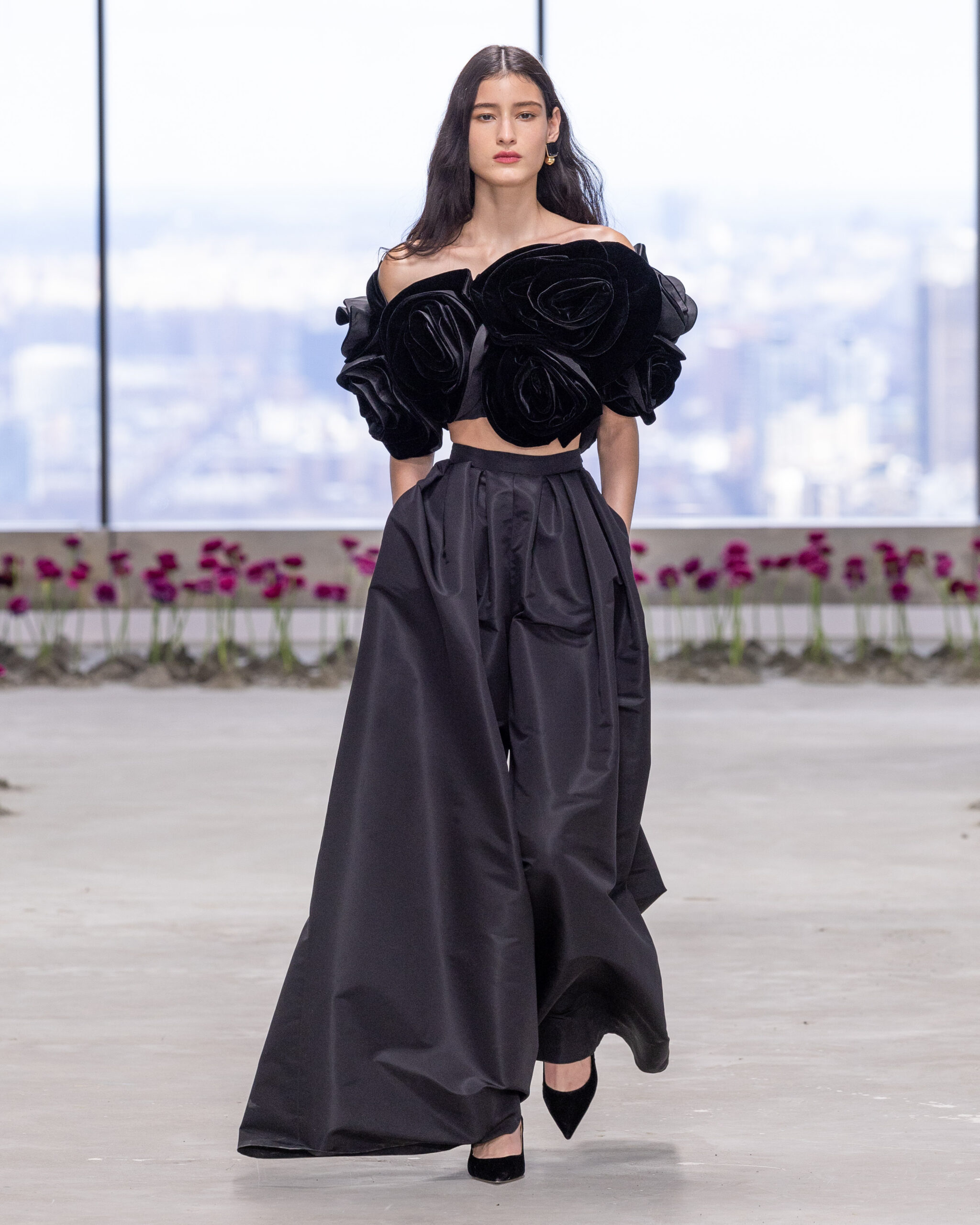 - Rosettes de soie sculpturales : façonnées à la main, elles apparaissent sur les hanches des robes, sur des jupes volumineuses ou encore en bustier dramatique, en hommage aux pétales éphémères d’une fleur qui s’ouvre.