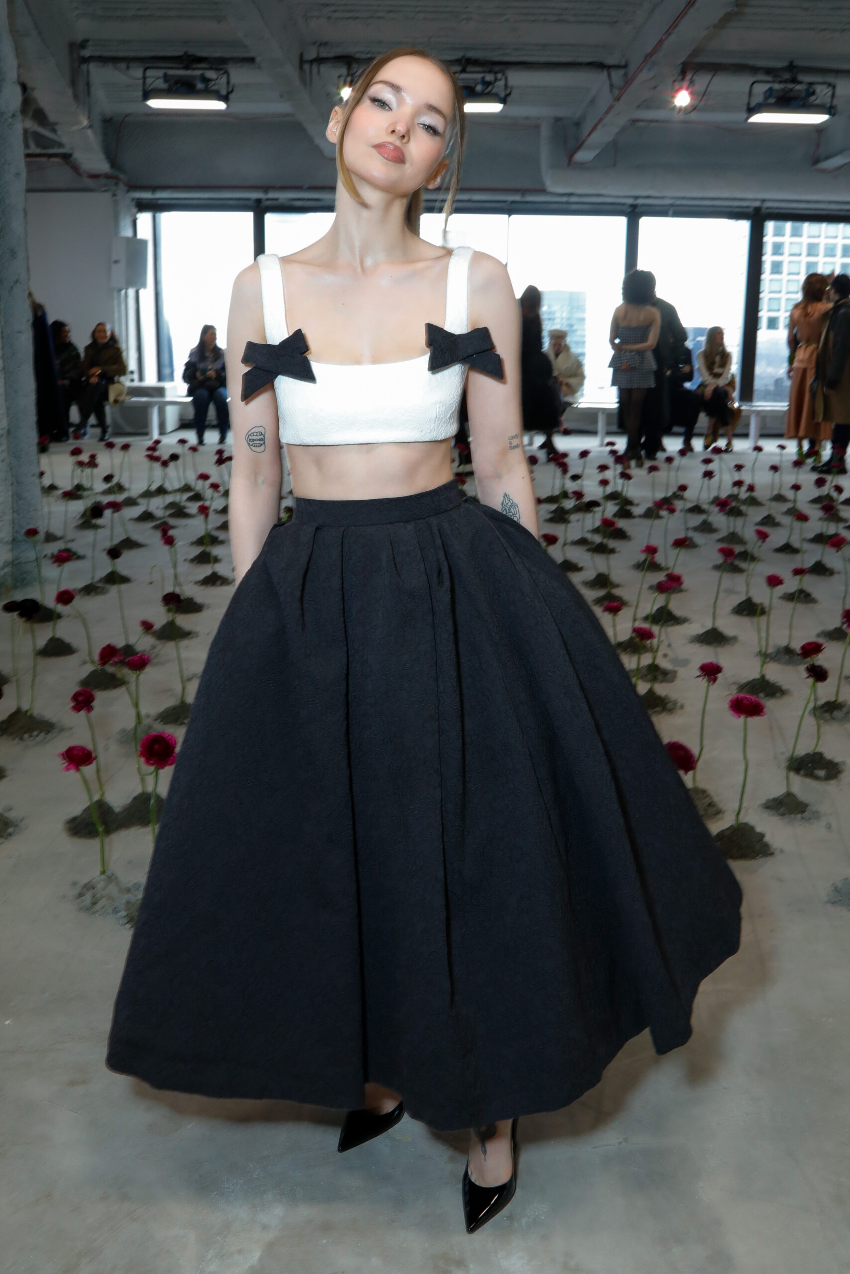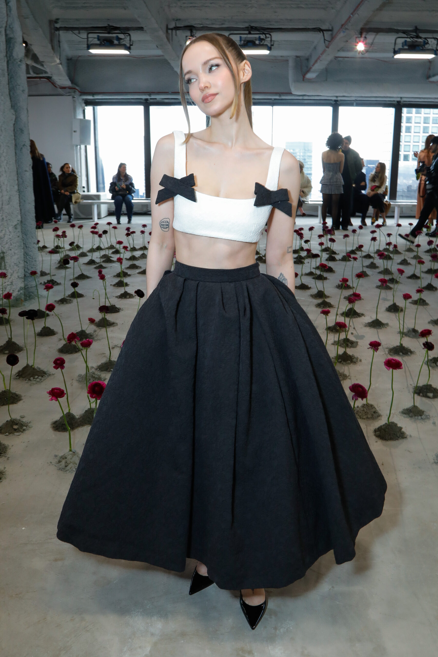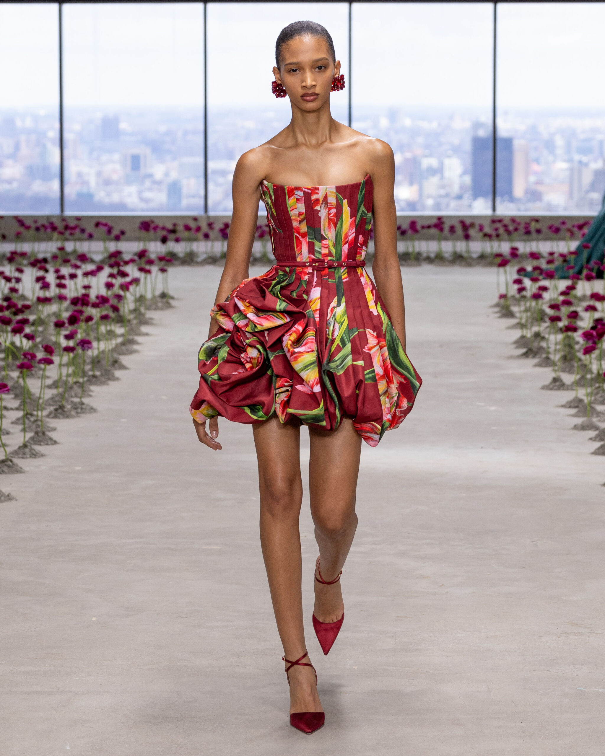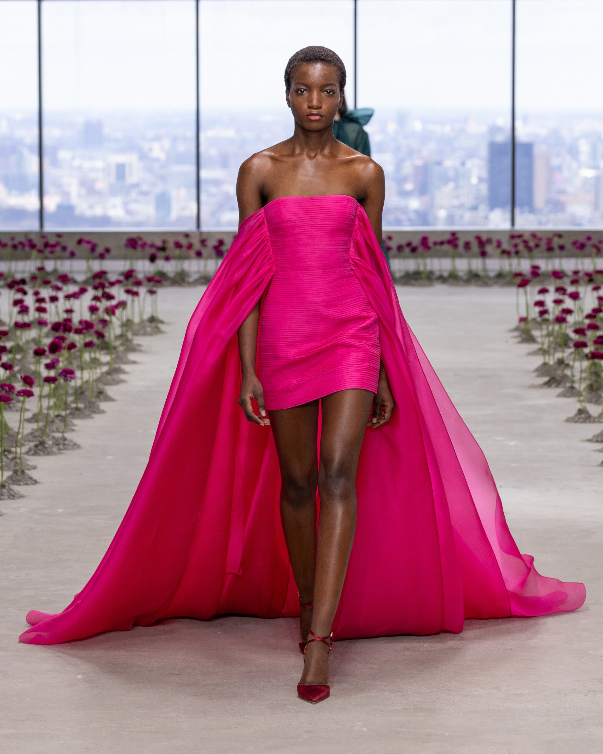 - Rosettes de soie sculpturales : façonnées à la main, elles apparaissent sur les hanches des robes, sur des jupes volumineuses ou encore en bustier dramatique, en hommage aux pétales éphémères d’une fleur qui s’ouvre.