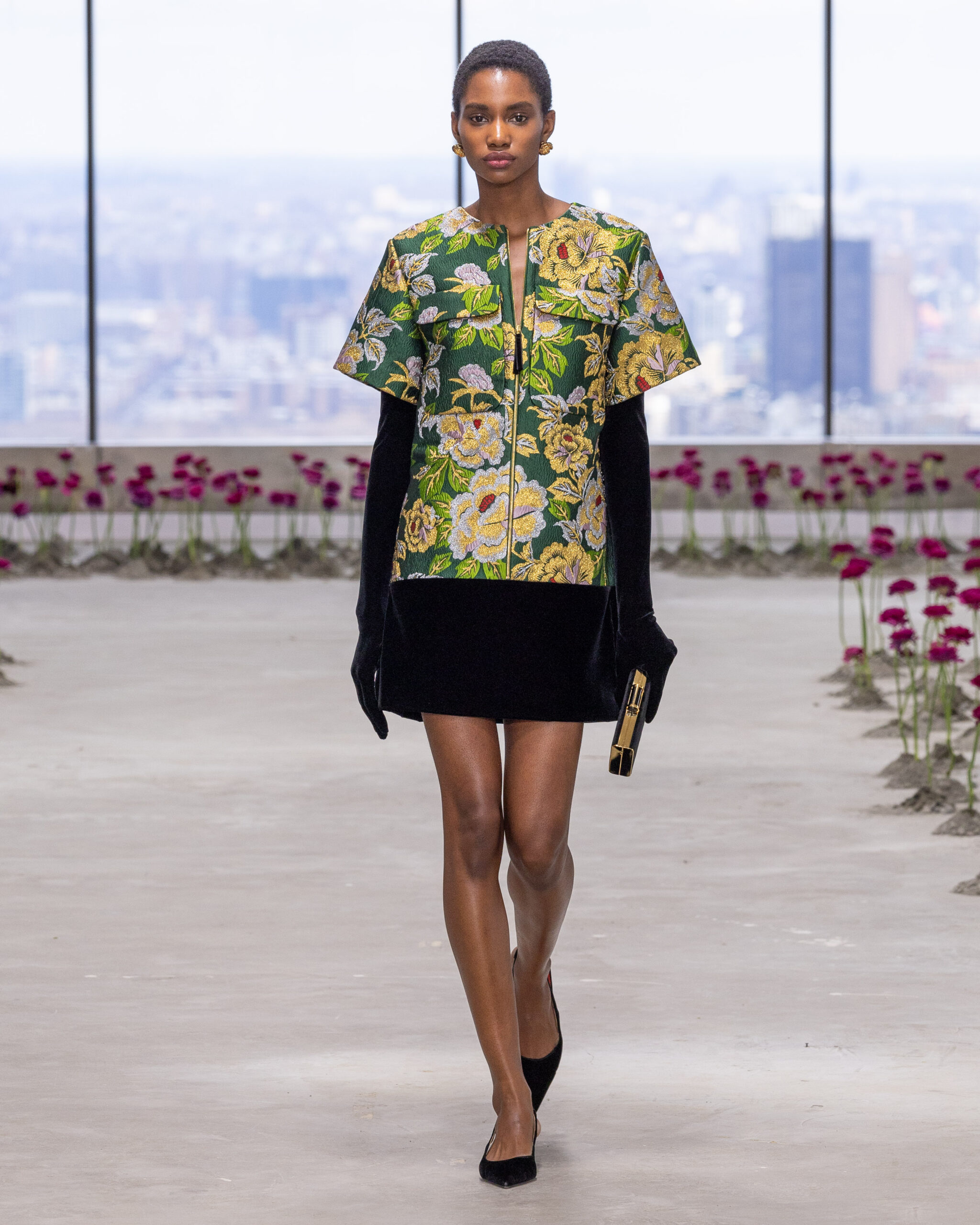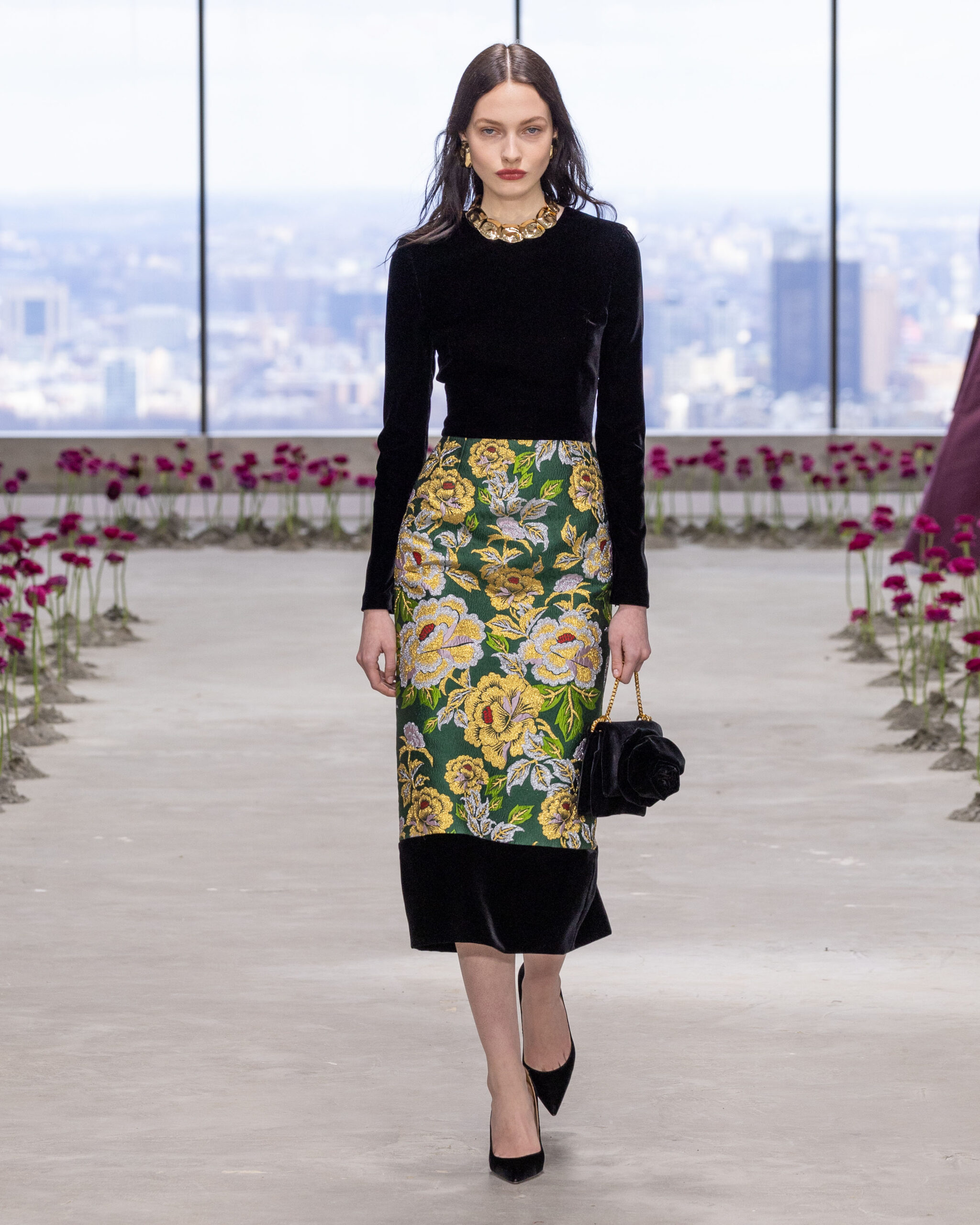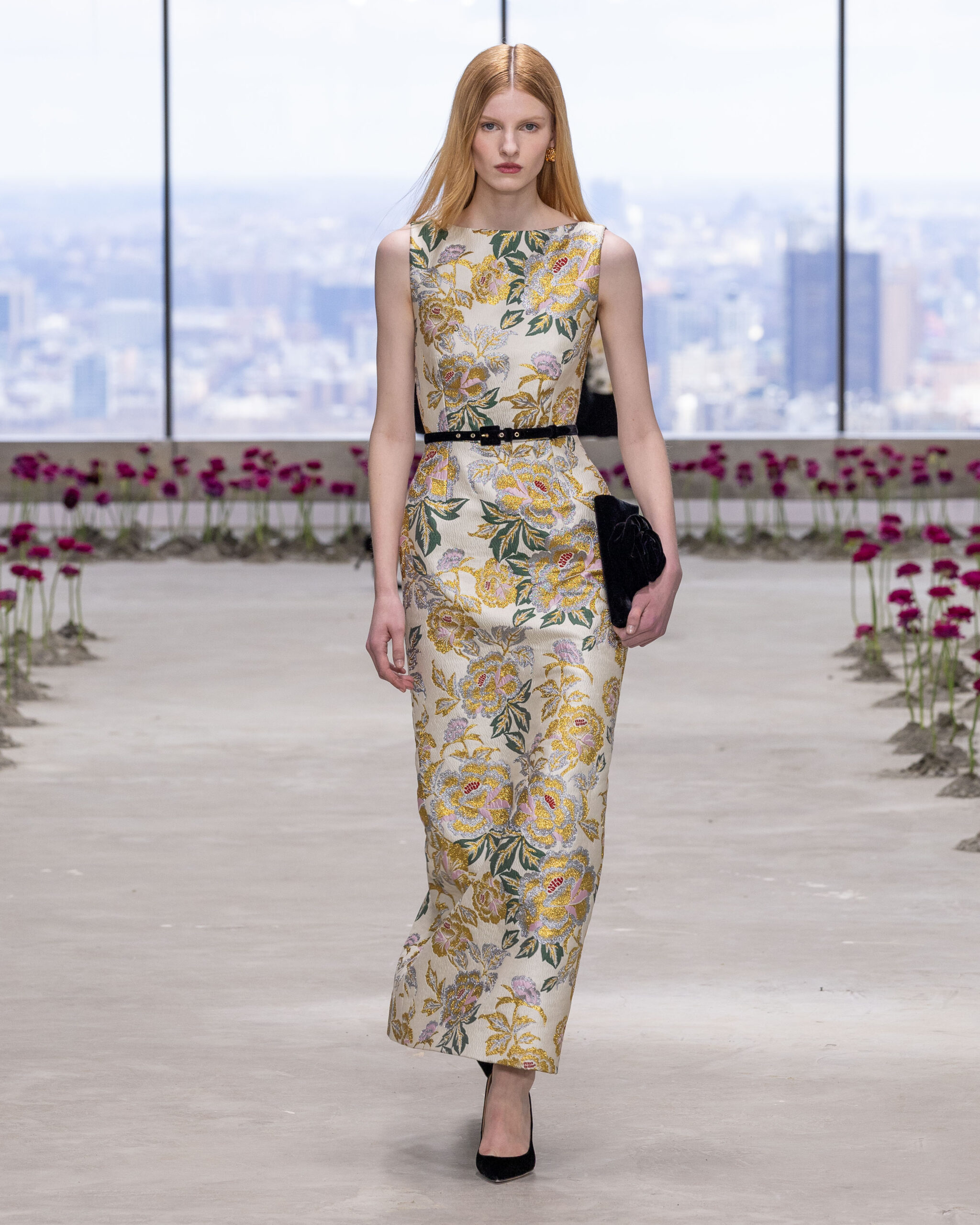 - Jacquard en lurex fleuri : il éclot sous forme de robes colonnes sculpturales et de jupes crayons impeccablement coupées, capturant la lumière avec un éclat subtil.