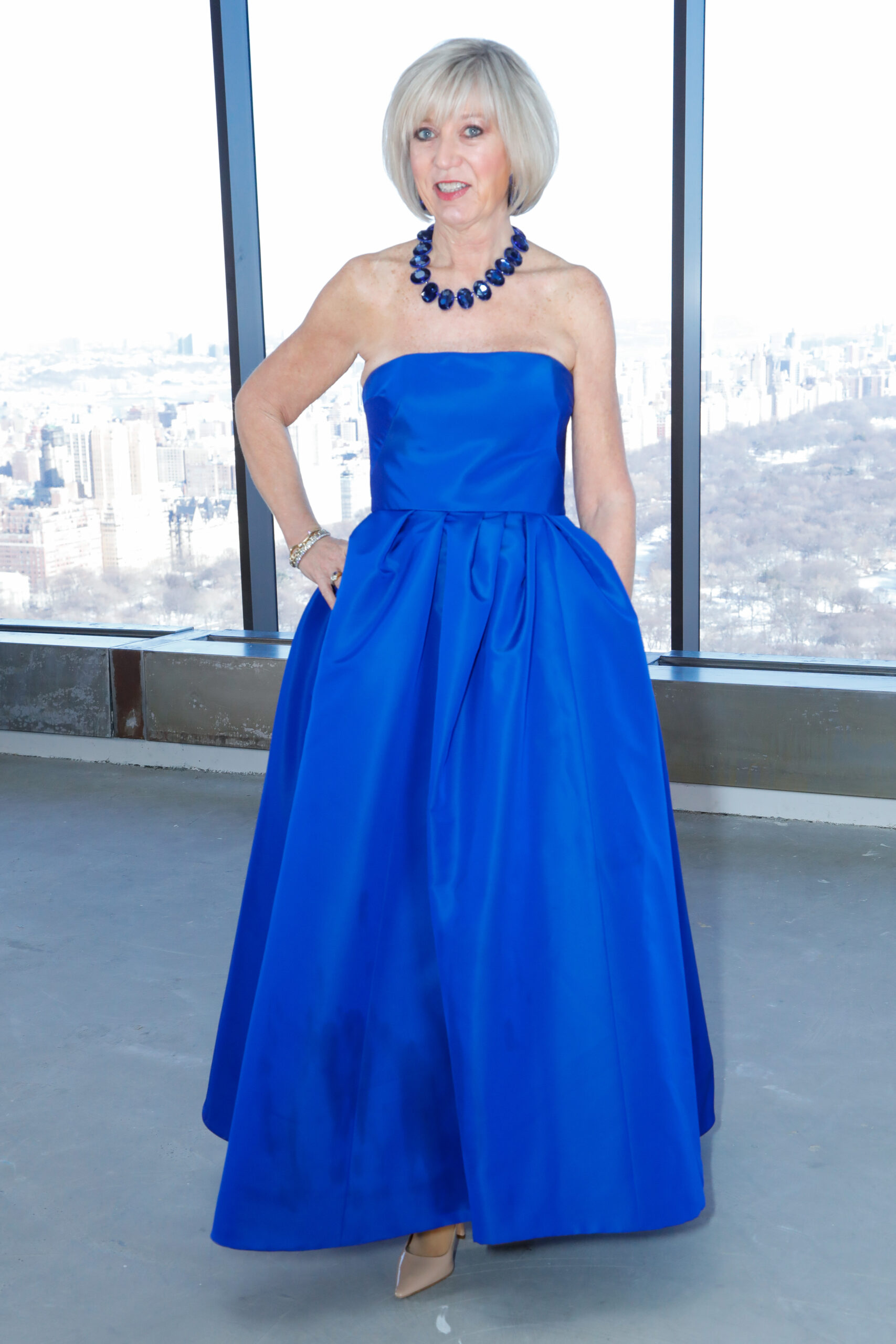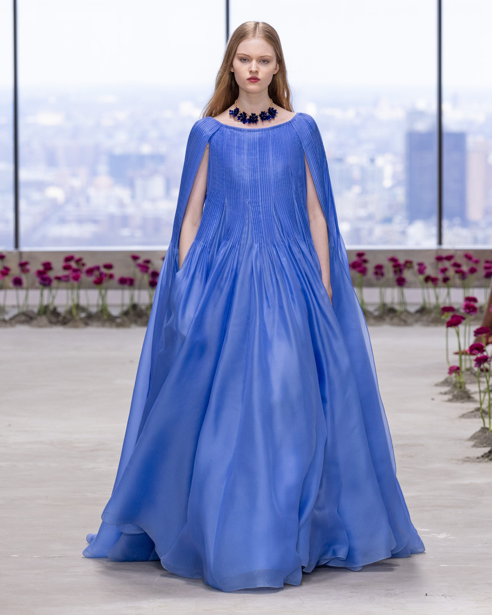 - Bleu bleuet en majesté : couleur phare de la saison, il s’exprime dans une robe colonne plissée à l’infini ou dans des dentelles délicates, évoquant un ciel d’été à l’aube.