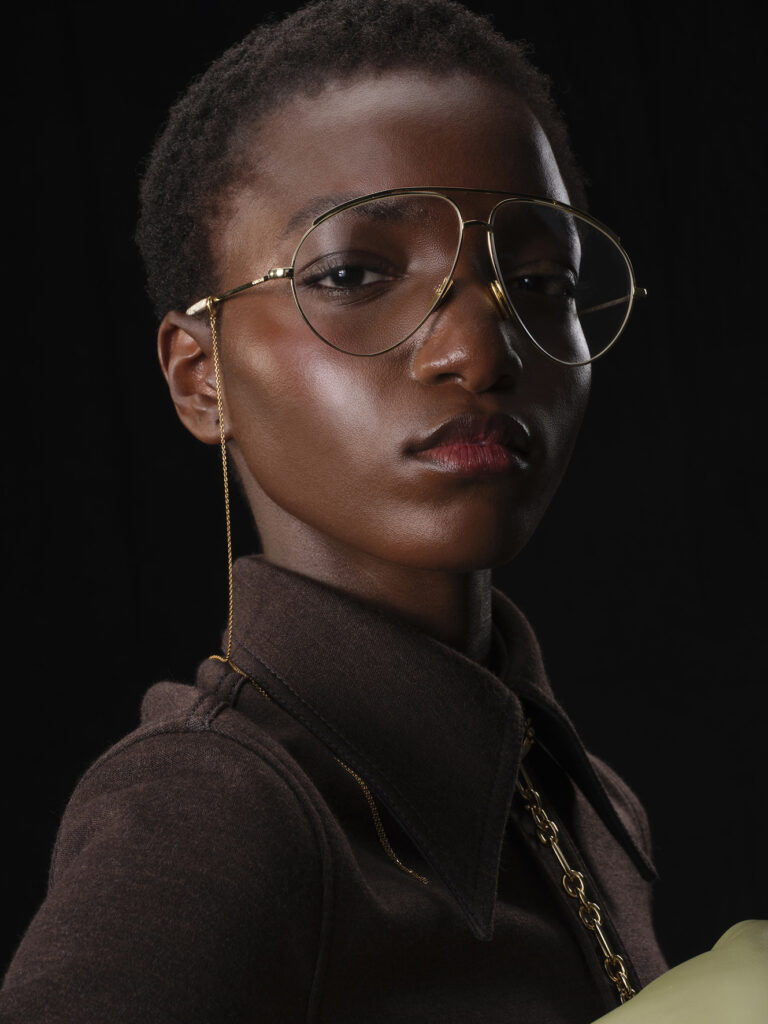 Le maquillage des yeux joue sur une sophistication discrète, évoquant une élégance intemporelle :