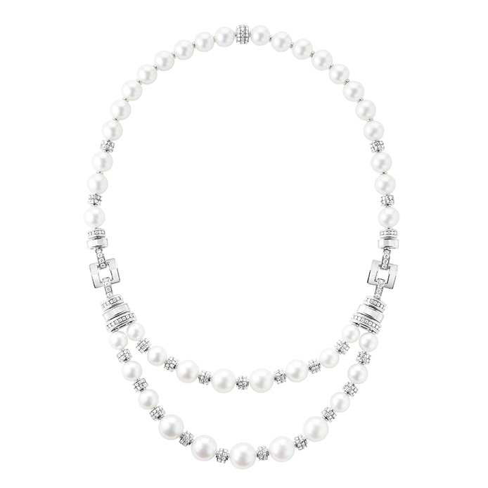- Le collier Rivière Art Déco, chef-d’œuvre de géométrie et d’harmonie, alliant perles de culture South Sea et nacre, où chaque perle semble flotter dans un éclat de lumière.