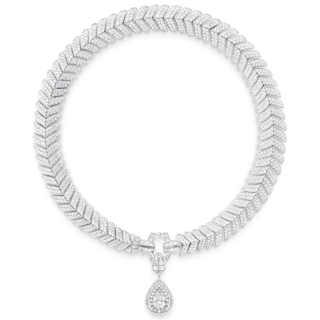 - Le collier Architecture, sublimé d’un diamant poire, véritable hommage à l’esthétique moderniste de la Maison.