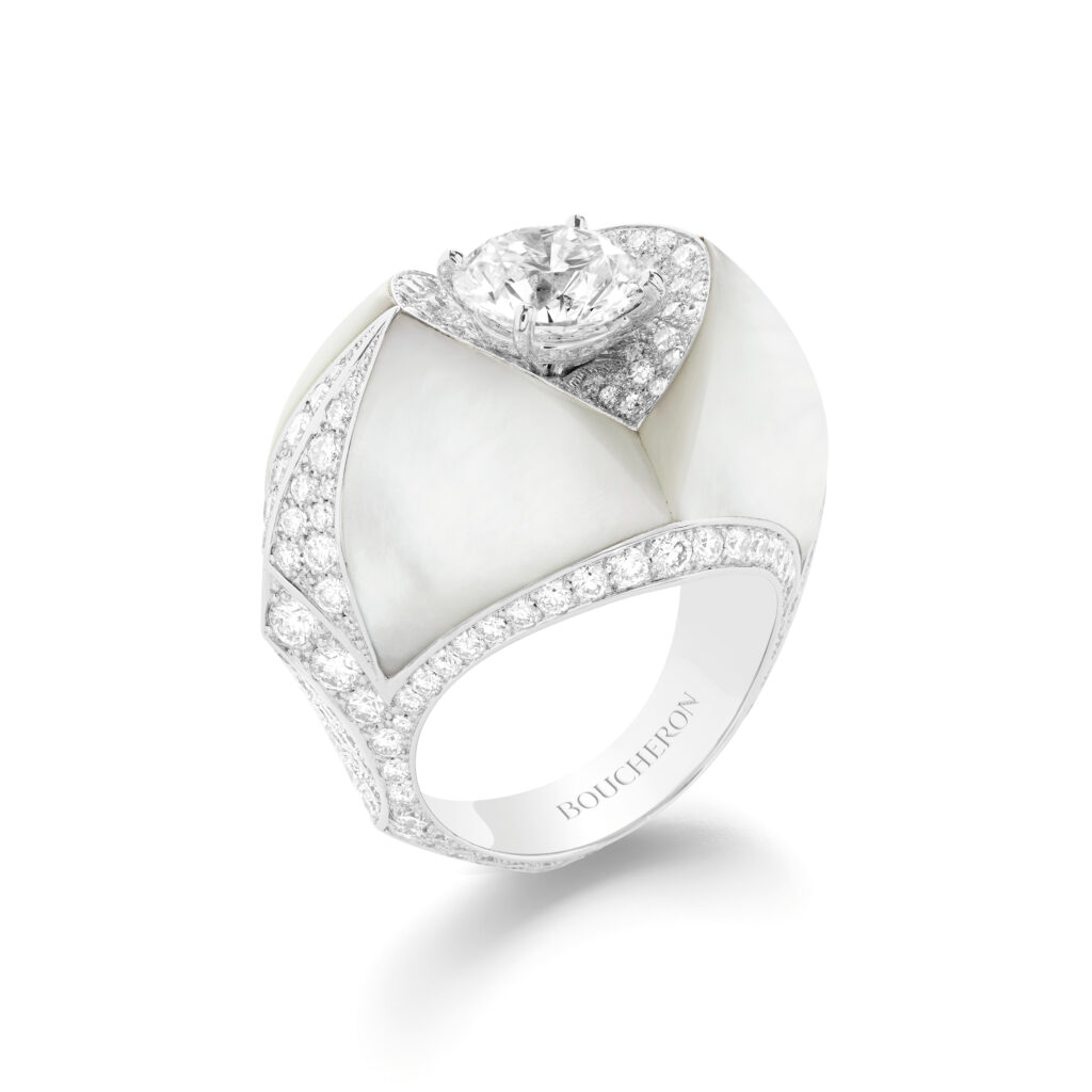 - La bague Hiver Imperial, sertie d’un diamant rond de 2,55 carats, sublimé par de la nacre et un pavage de diamants, évoquant un hiver éternel figé dans la lumière.