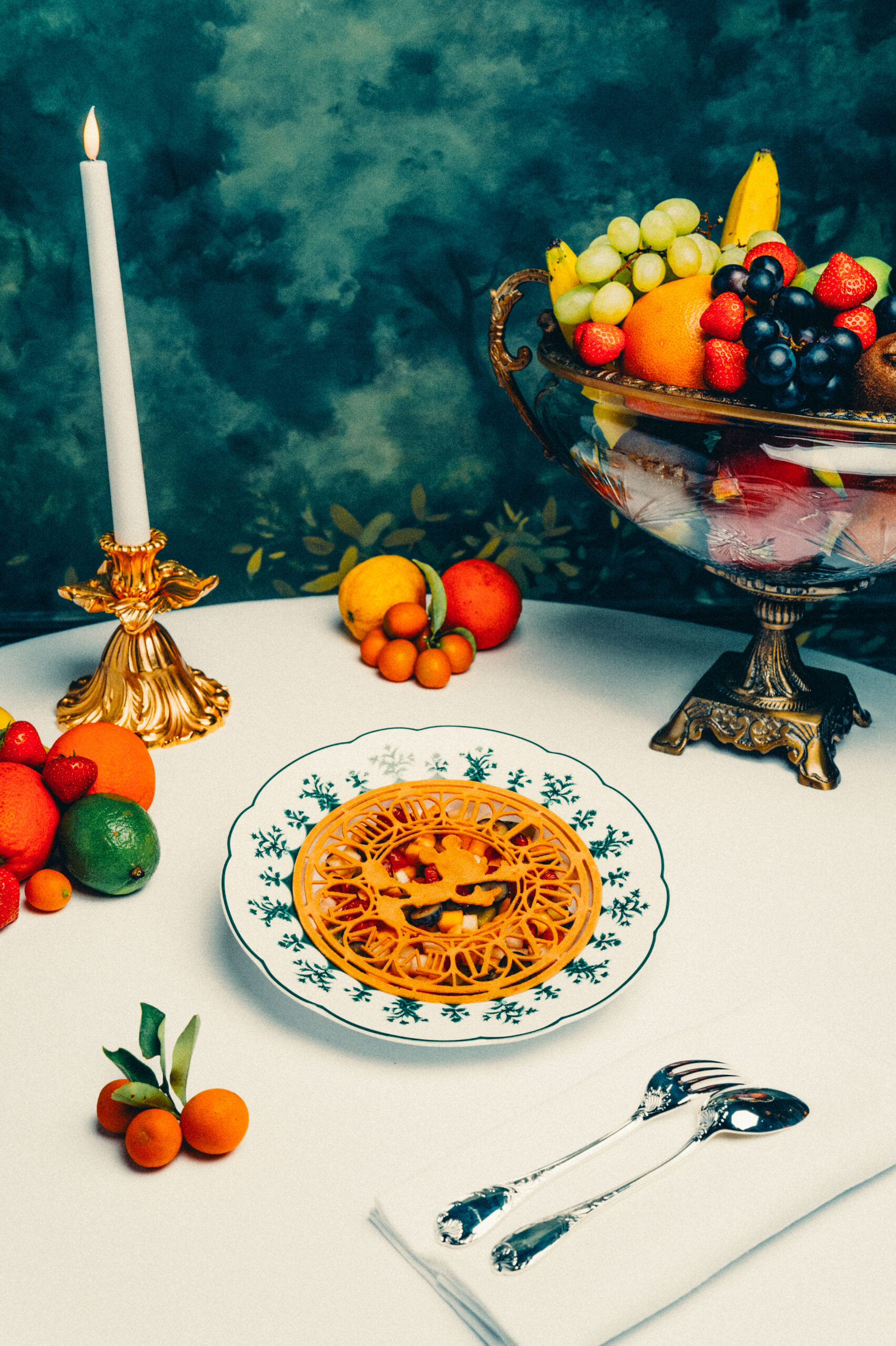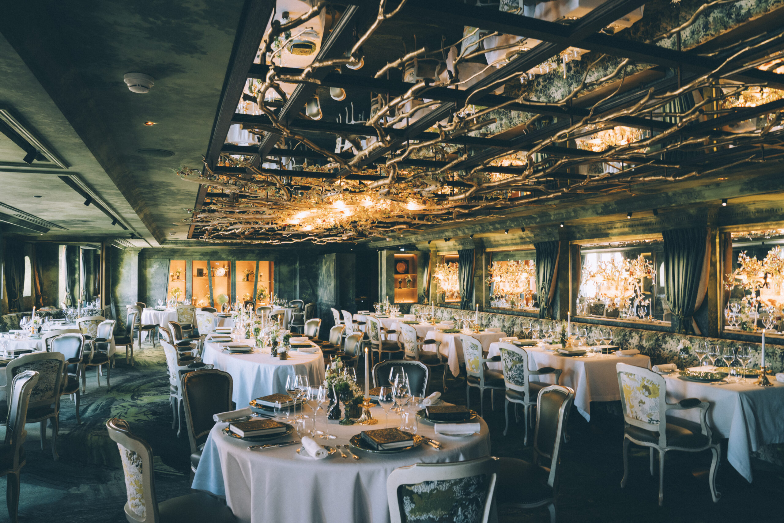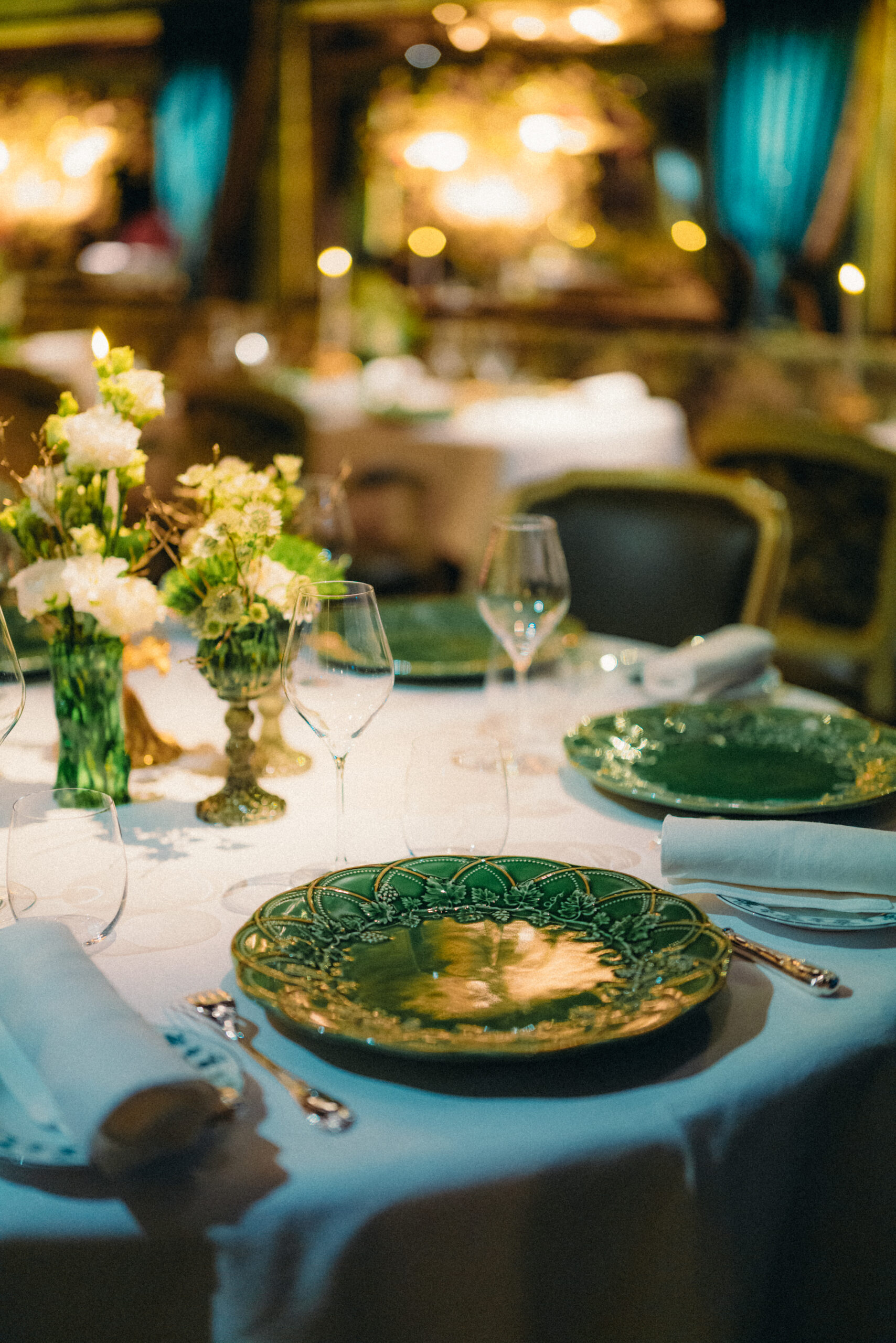 « La Forêt Secrète » brille par sa scénographie immersive : un lustre Murano majestueux, orné de feuillages délicats et d’oiseaux stylisés, éclaire doucement la table centrale. La fresque murale réalisée à la main plonge les convives dans une forêt onirique aux multiples nuances de vert, complétée par une vaisselle végétale signée Bernardaud et une argenterie raffinée issue des ateliers Christofle.