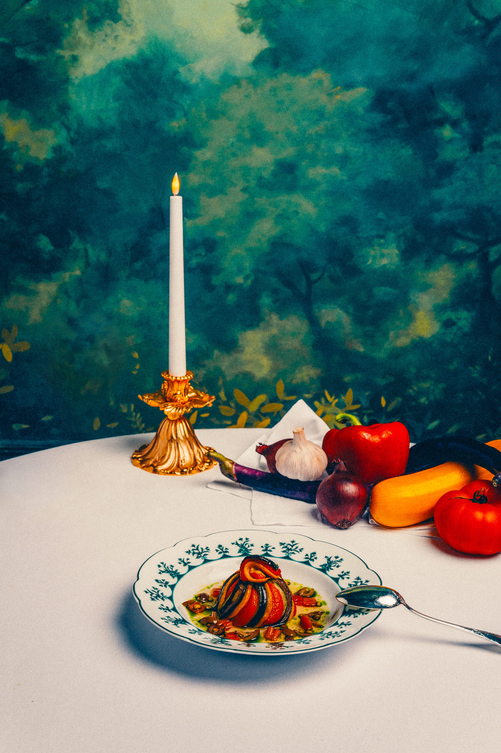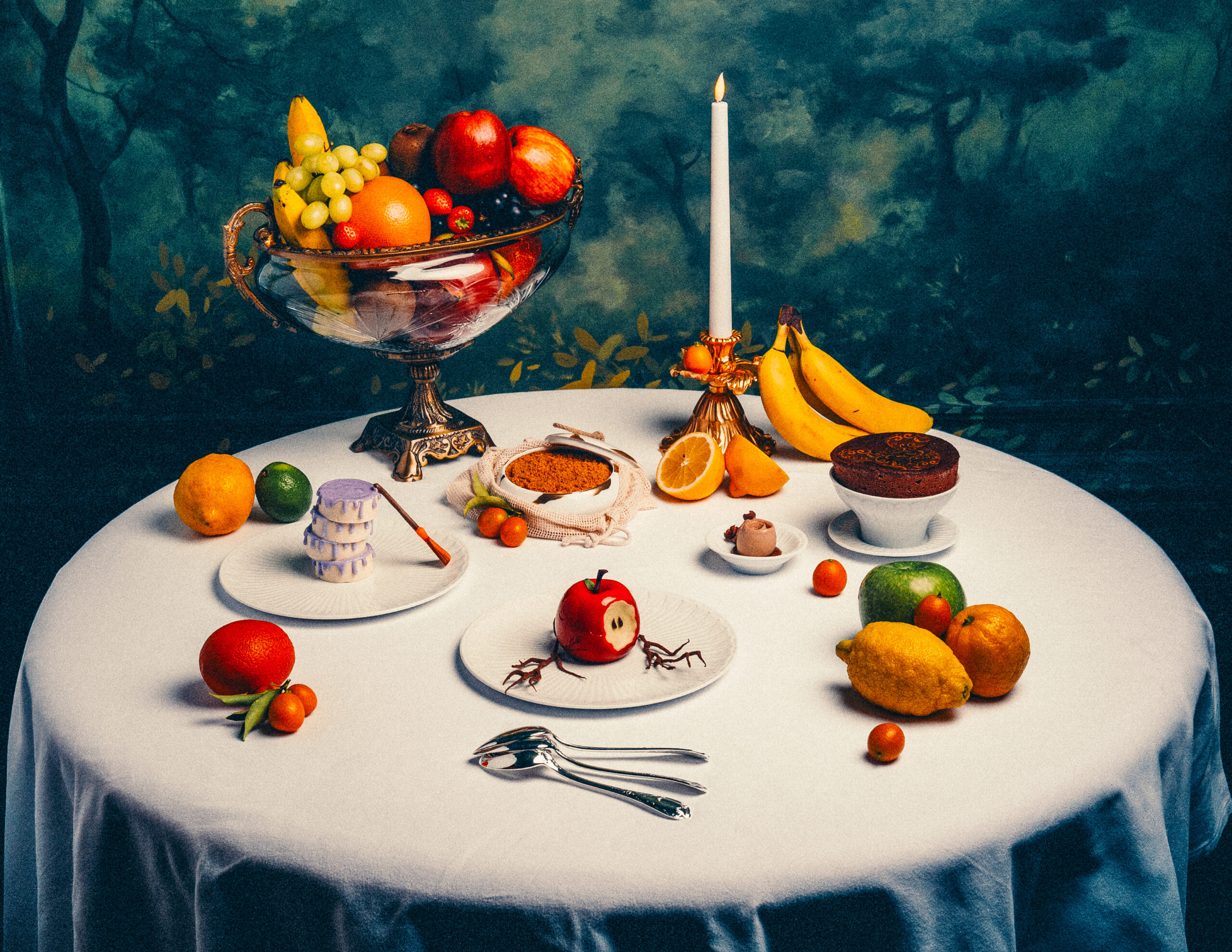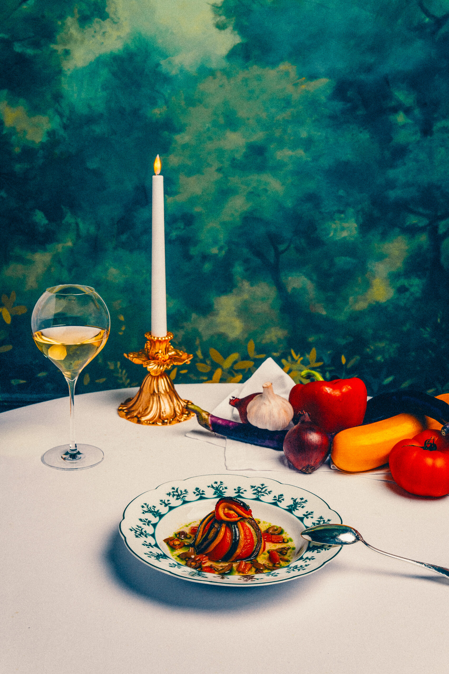 « La Forêt Secrète » brille par sa scénographie immersive : un lustre Murano majestueux, orné de feuillages délicats et d’oiseaux stylisés, éclaire doucement la table centrale. La fresque murale réalisée à la main plonge les convives dans une forêt onirique aux multiples nuances de vert, complétée par une vaisselle végétale signée Bernardaud et une argenterie raffinée issue des ateliers Christofle.