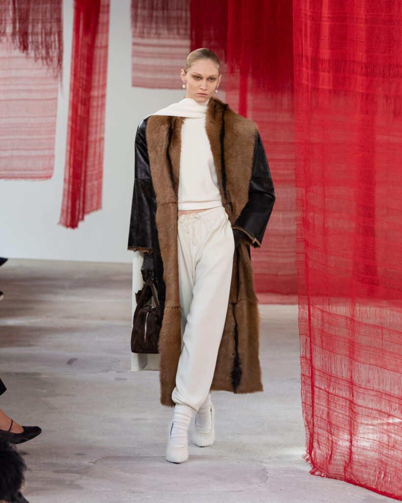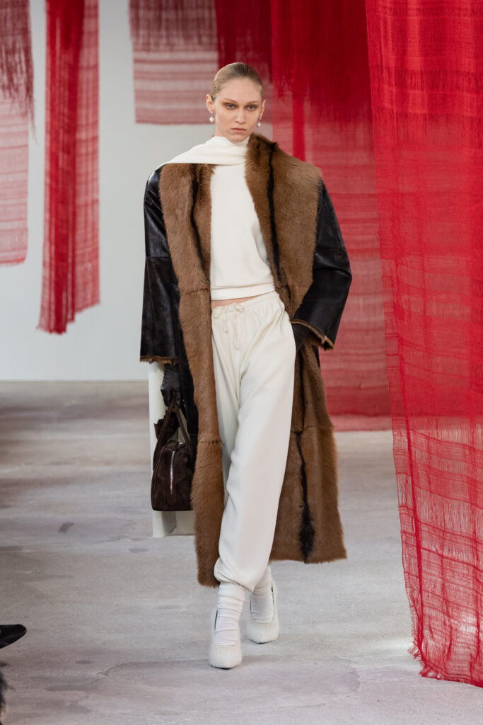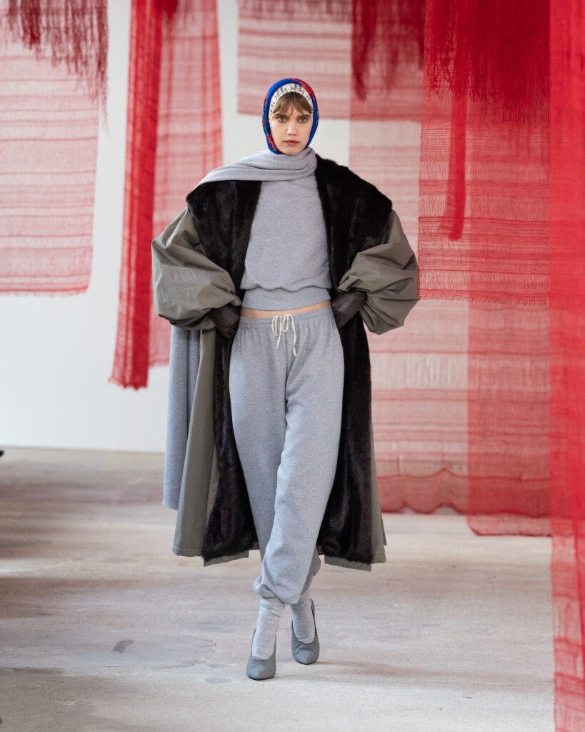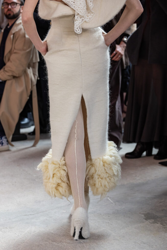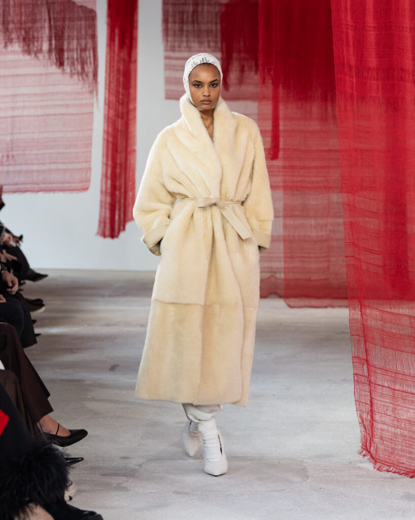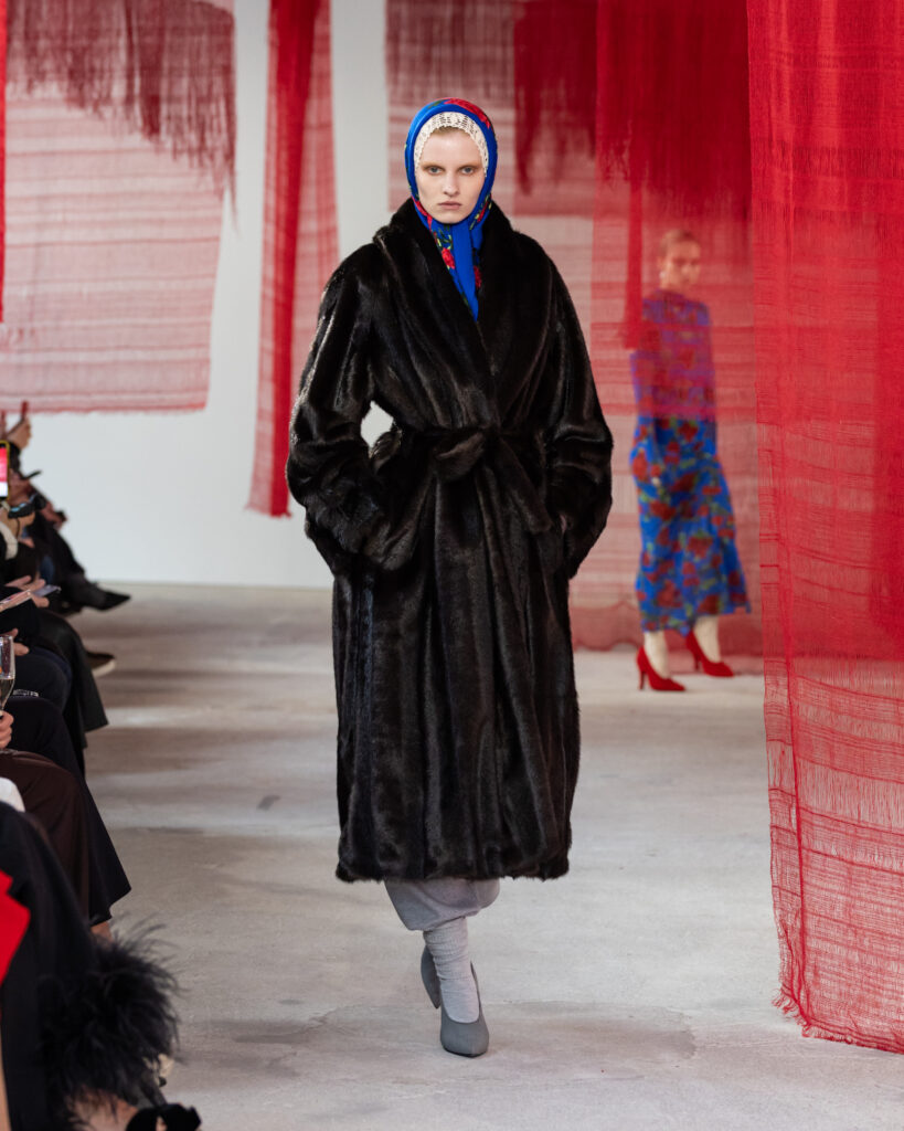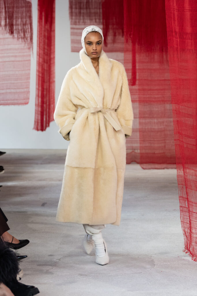 Si l’artisanat et la féminité romantique sont au cœur du projet, Magda Butrym intègre également une dimension pragmatique, inspirée de son style personnel. Ainsi, des manteaux en shearling sont jetés négligemment sur des survêtements en soie, des châles en fourrure s’associent à des vestes matelassées façon couette, traduisant une quête de confort et de sensualité assumée.