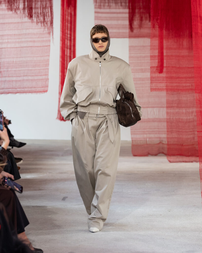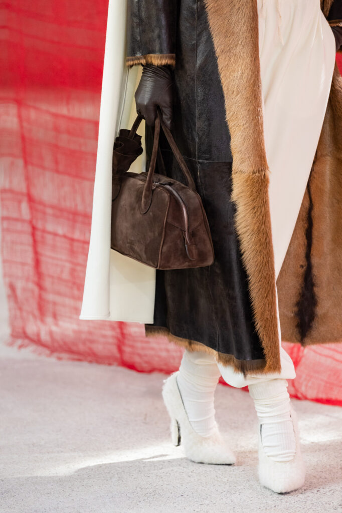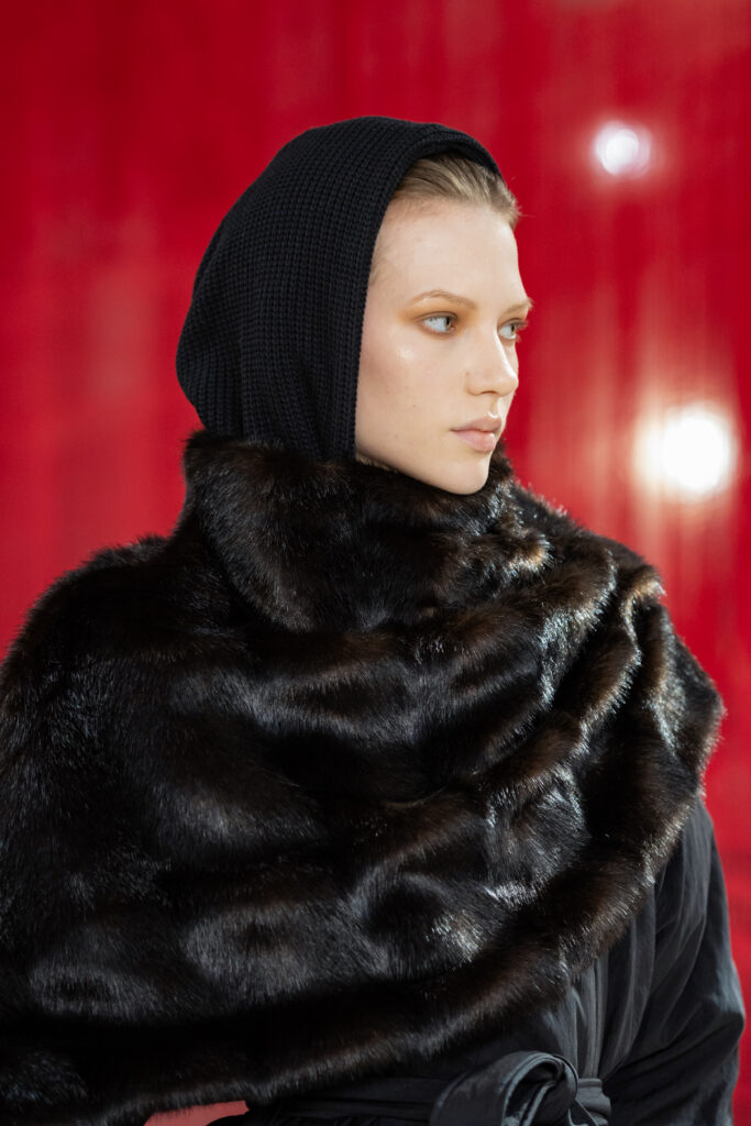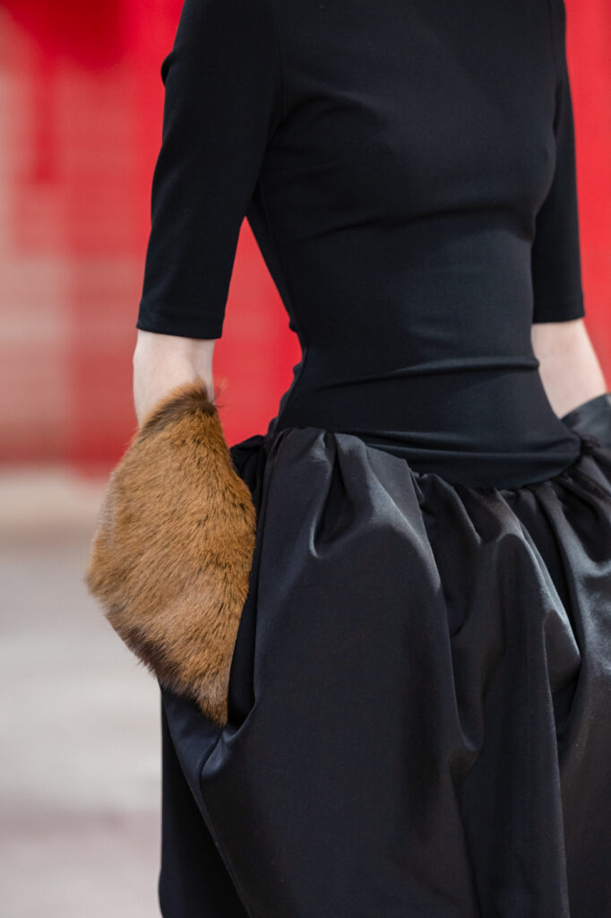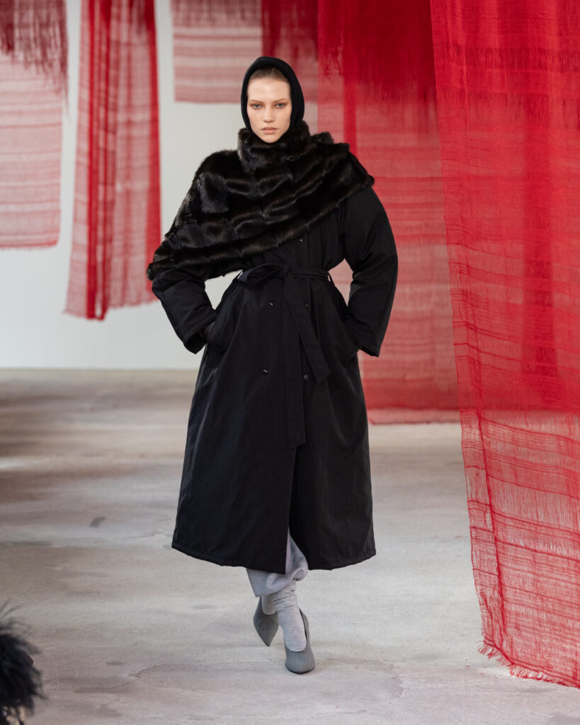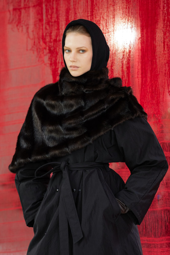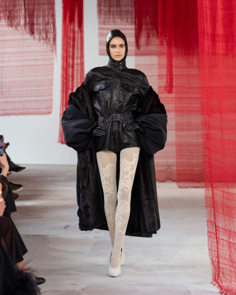 Si l’artisanat et la féminité romantique sont au cœur du projet, Magda Butrym intègre également une dimension pragmatique, inspirée de son style personnel. Ainsi, des manteaux en shearling sont jetés négligemment sur des survêtements en soie, des châles en fourrure s’associent à des vestes matelassées façon couette, traduisant une quête de confort et de sensualité assumée.