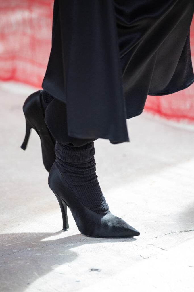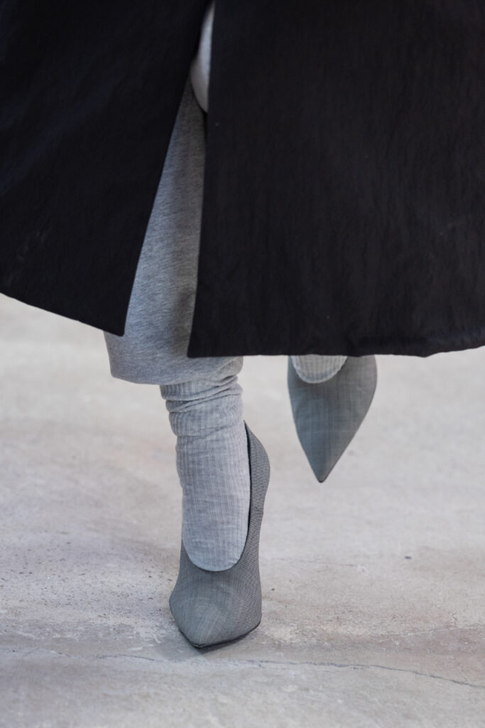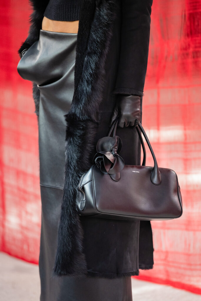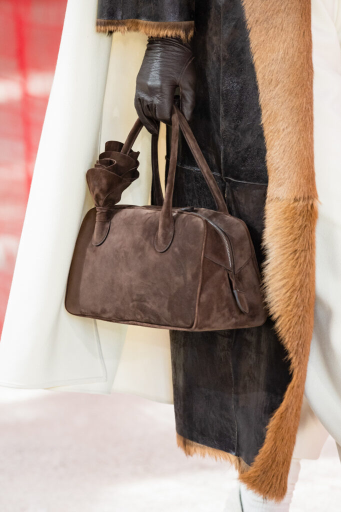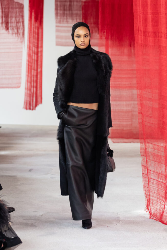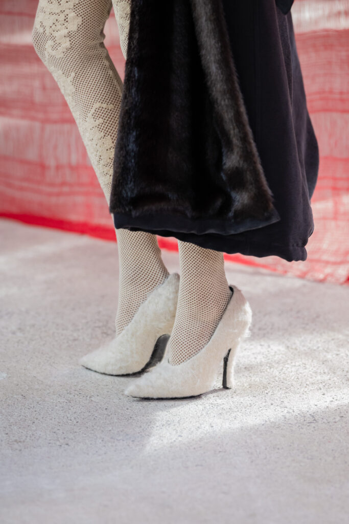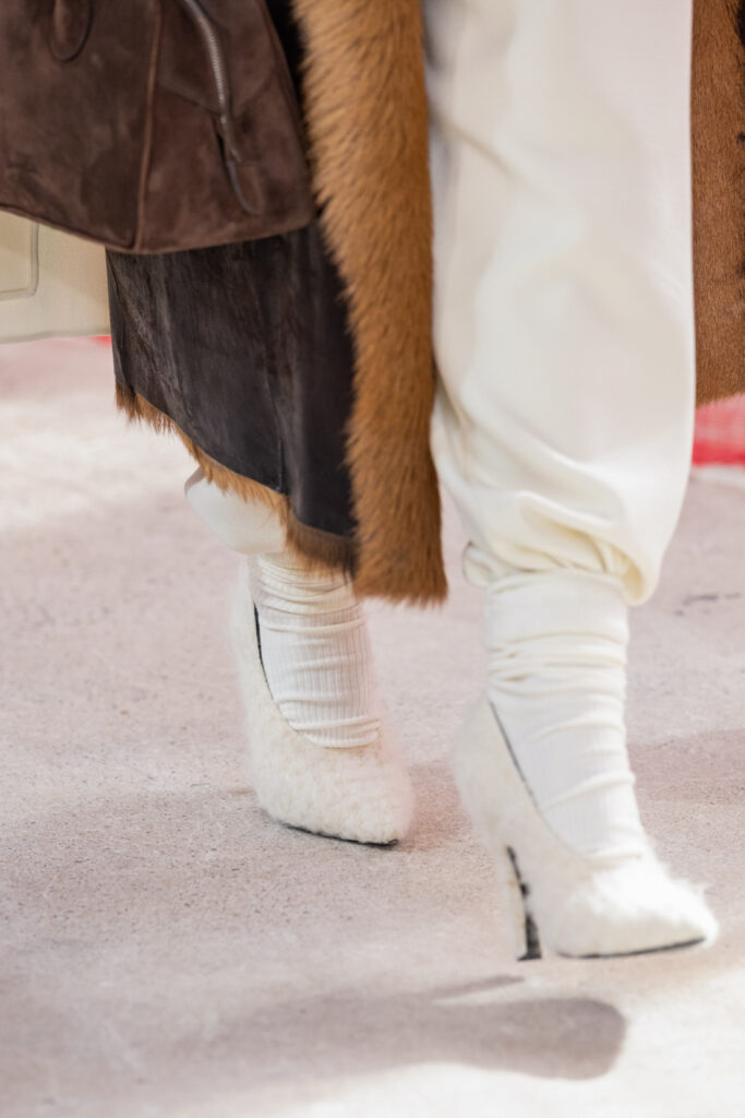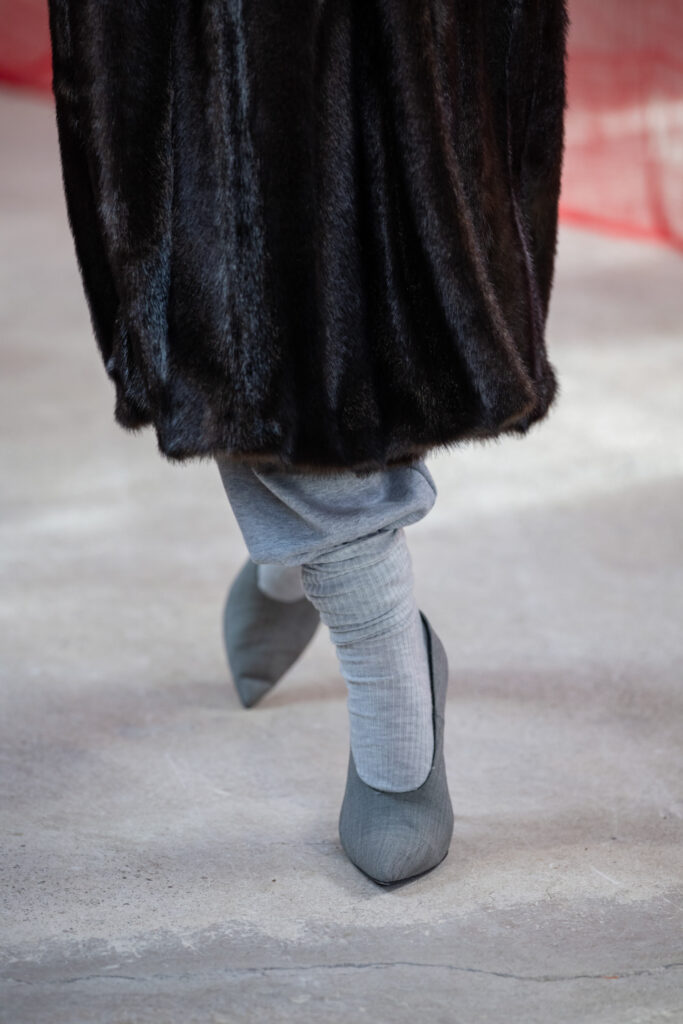 Si l’artisanat et la féminité romantique sont au cœur du projet, Magda Butrym intègre également une dimension pragmatique, inspirée de son style personnel. Ainsi, des manteaux en shearling sont jetés négligemment sur des survêtements en soie, des châles en fourrure s’associent à des vestes matelassées façon couette, traduisant une quête de confort et de sensualité assumée.