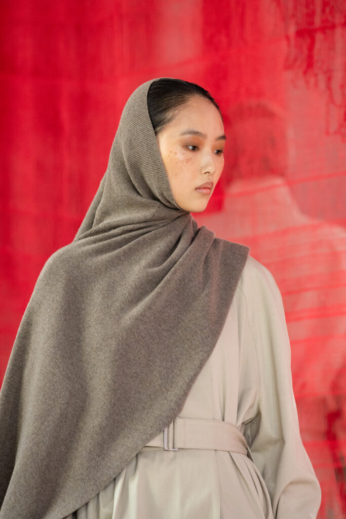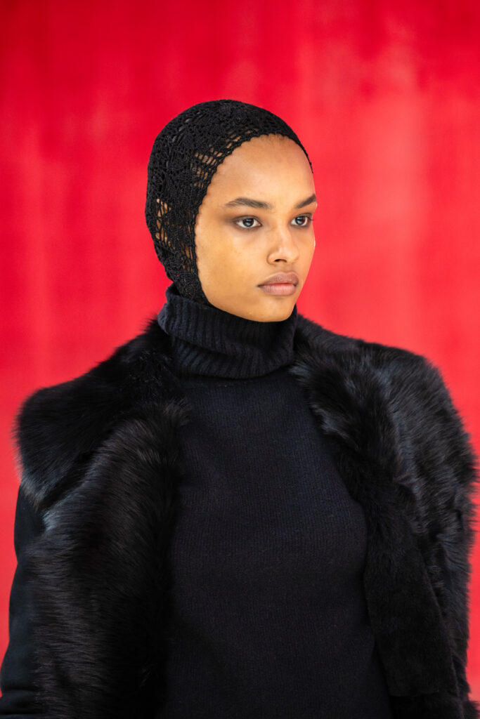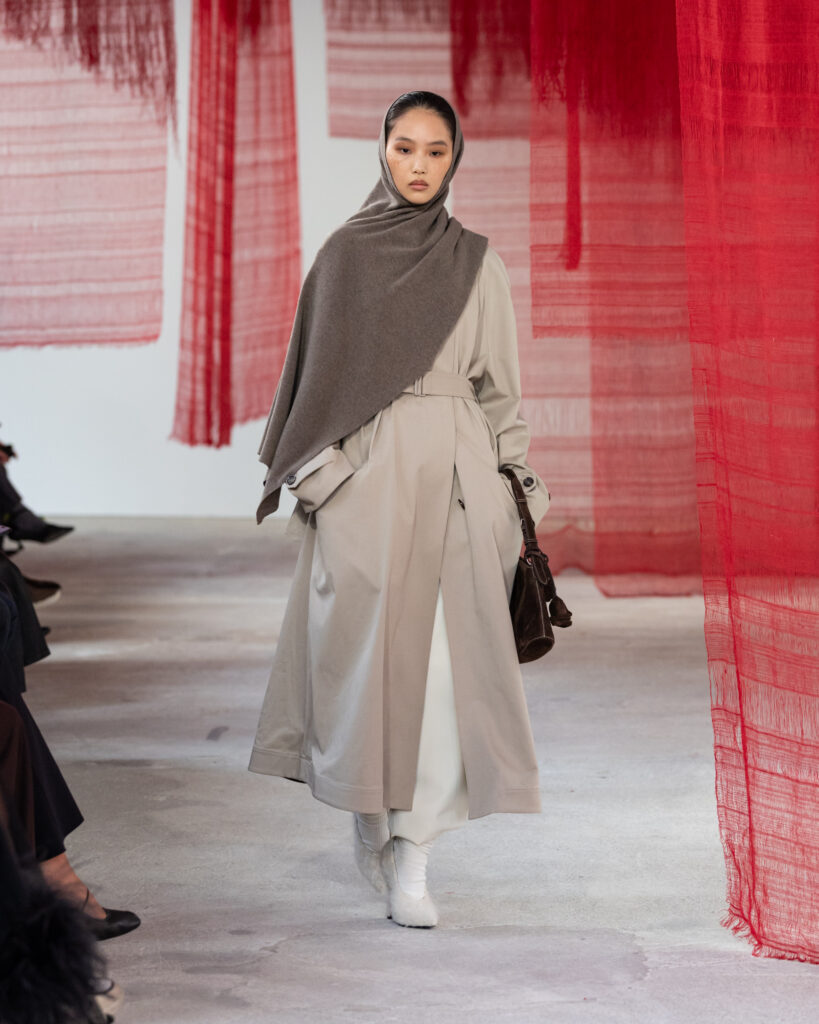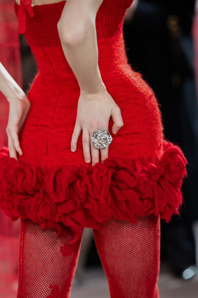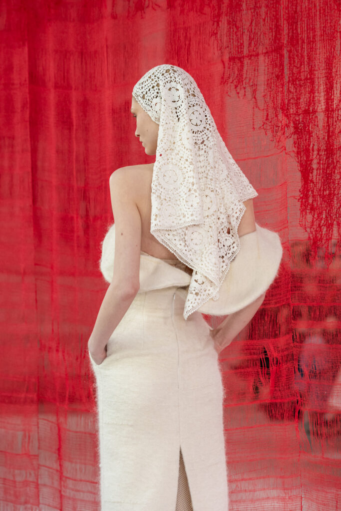 L’expérience ne s’arrête pas aux vêtements : le décor du défilé est une œuvre en soi. Environ 200 mètres de tissu tissé à la main, nécessitant plus de 150 heures de travail artisanal, ont été suspendus pour créer un environnement brumeux et vaporeux, dans une nuance rouge profond. Ce rideau de fils entrelacés, inspiré des installations de Magdalena Abakanowicz, devient un écrin mouvant où les modèles évoluent librement, incarnant l’âme même de la collection.
