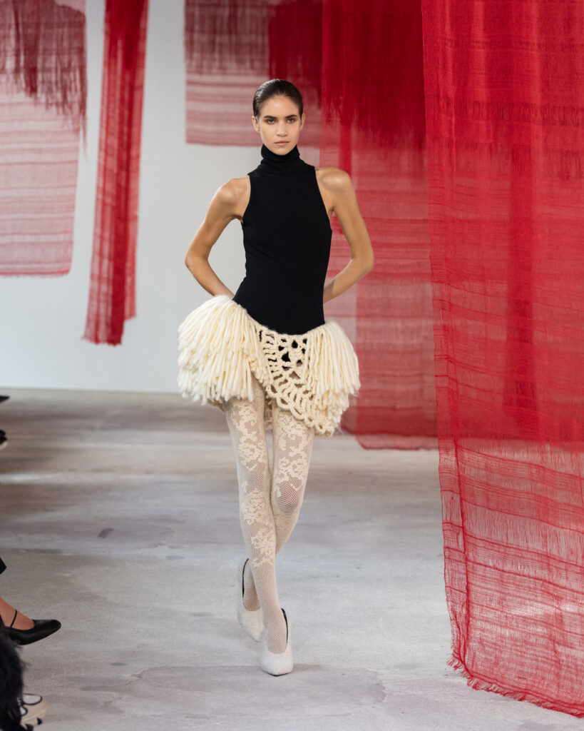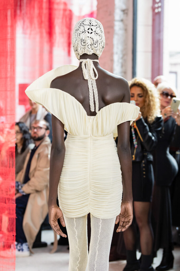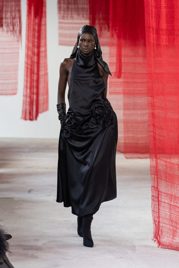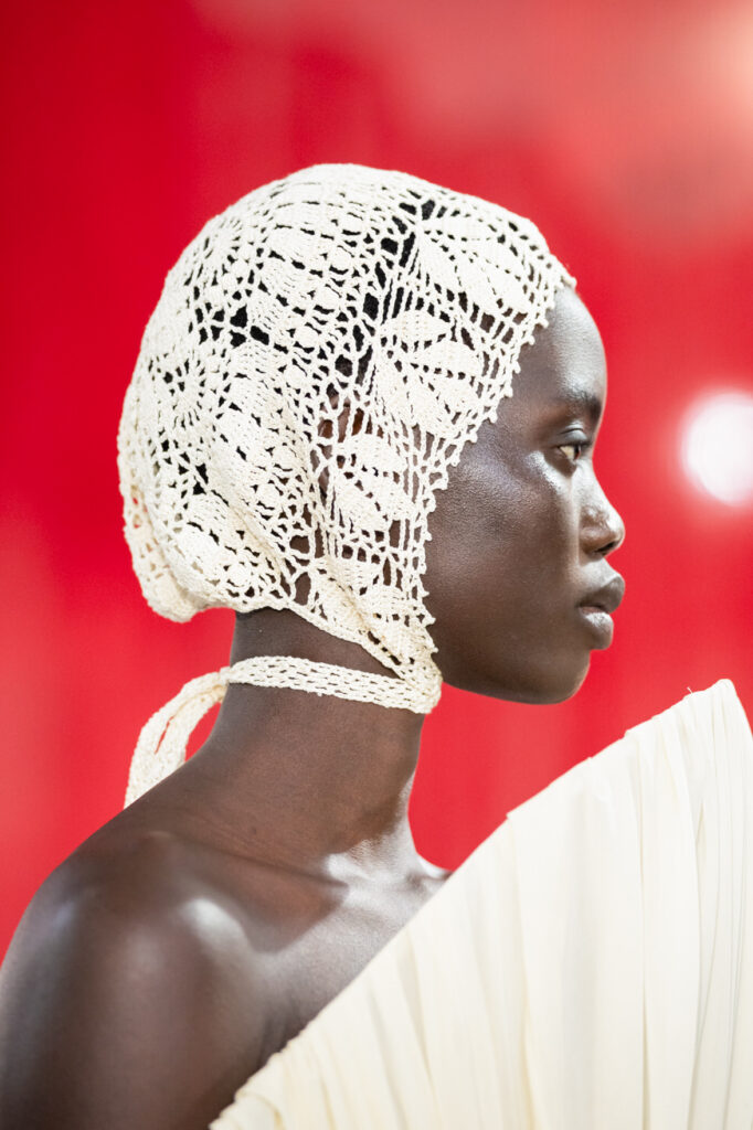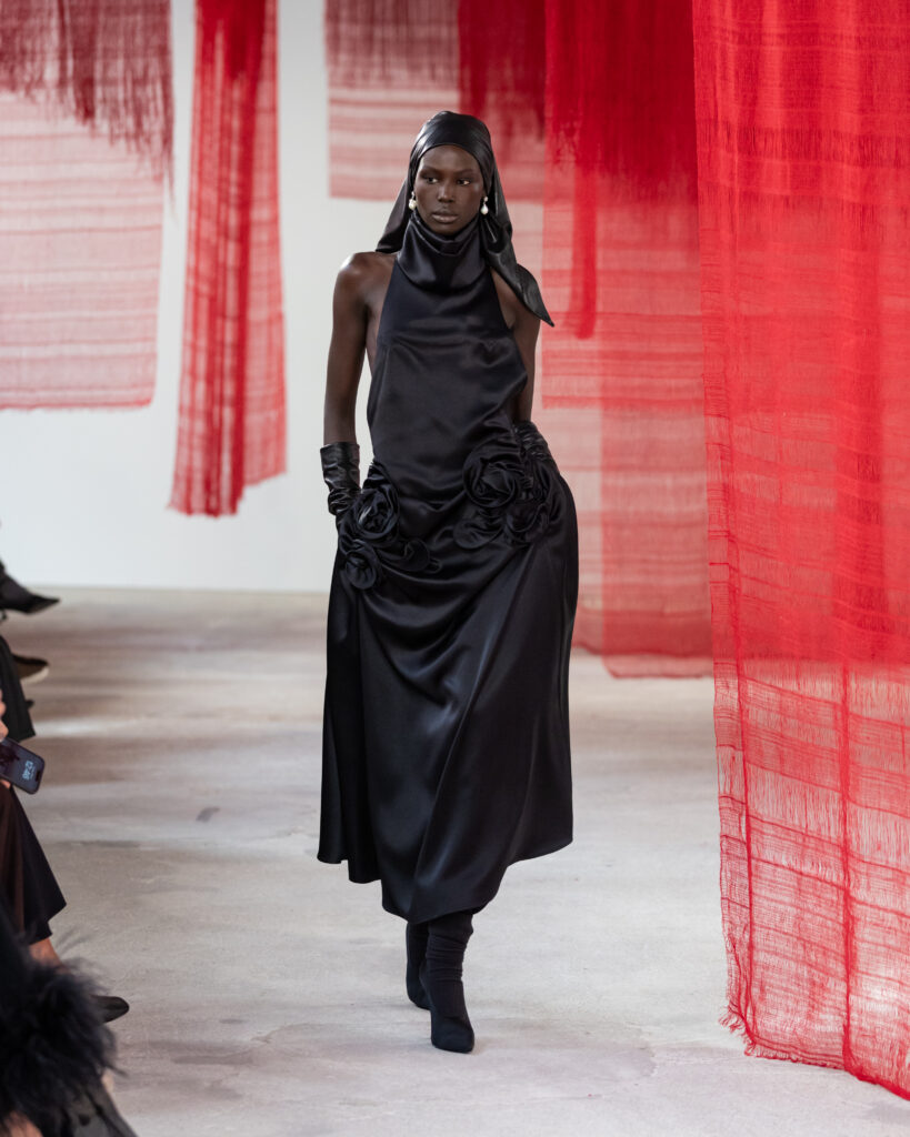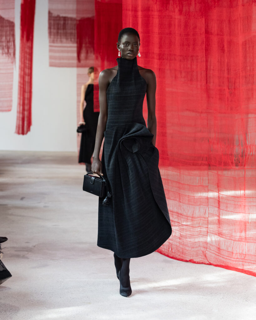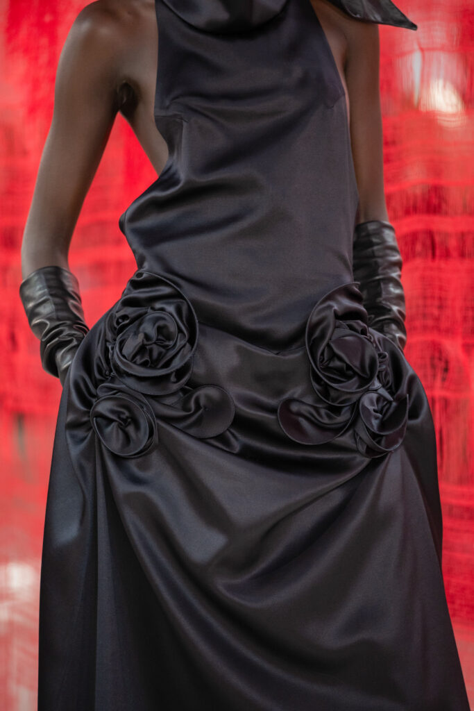 Le savoir-faire textile, mis en avant dans le décor comme dans les vêtements, souligne la volonté de Magda Butrym d’ancrer son travail dans une tradition millénaire tout en explorant de nouvelles possibilités créatives.