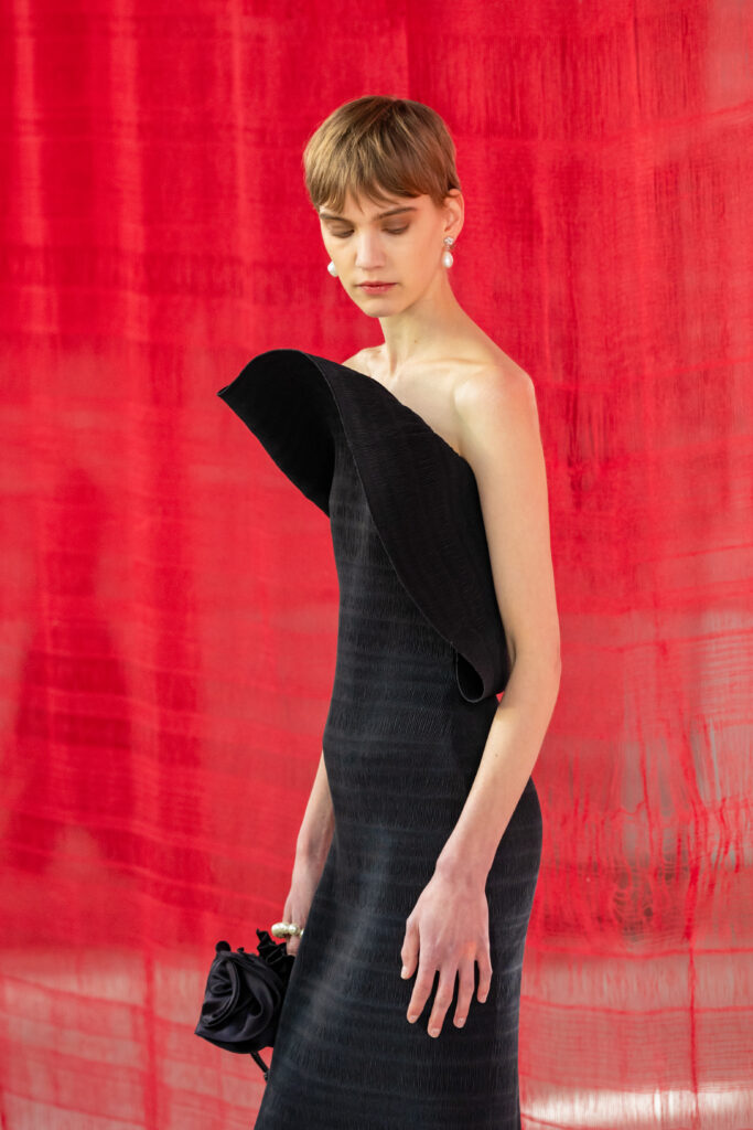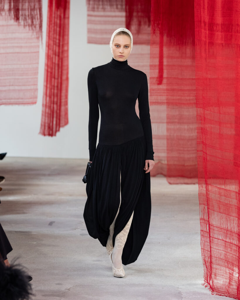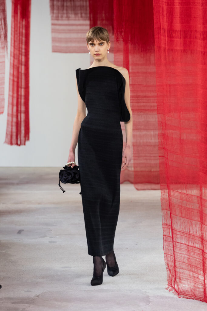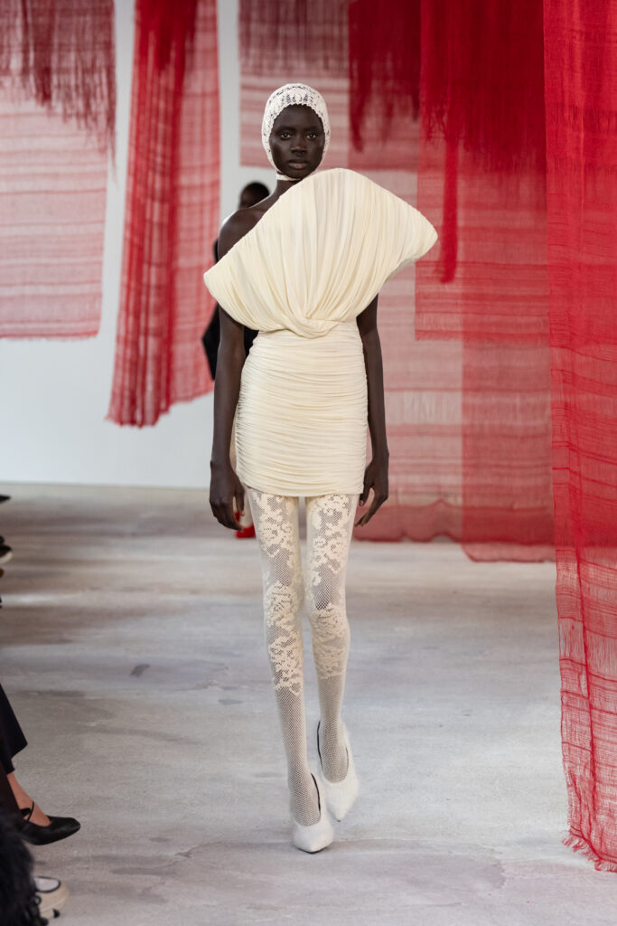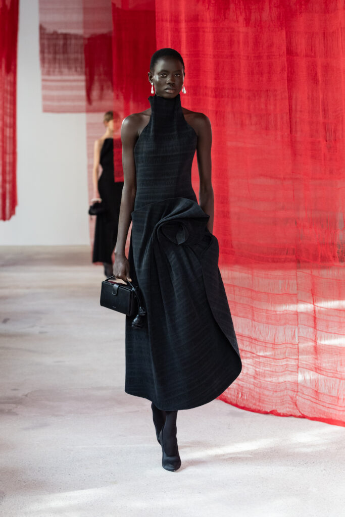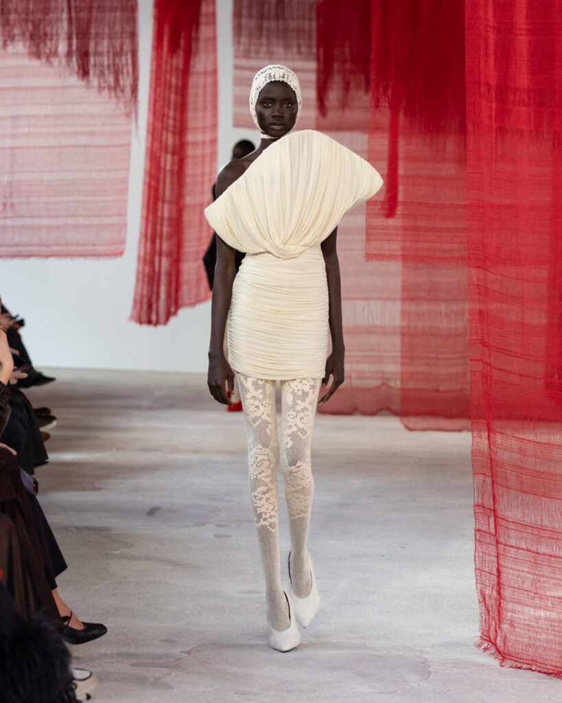 Le savoir-faire textile, mis en avant dans le décor comme dans les vêtements, souligne la volonté de Magda Butrym d’ancrer son travail dans une tradition millénaire tout en explorant de nouvelles possibilités créatives.