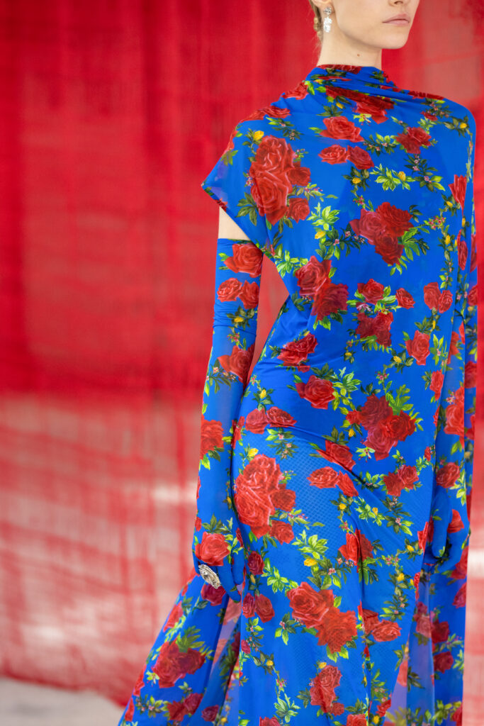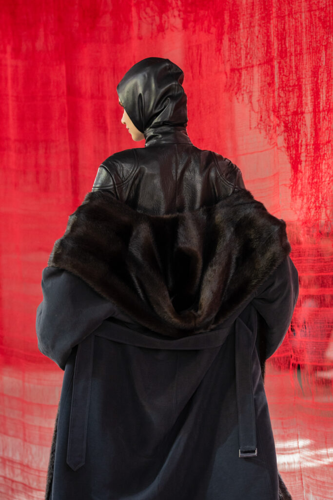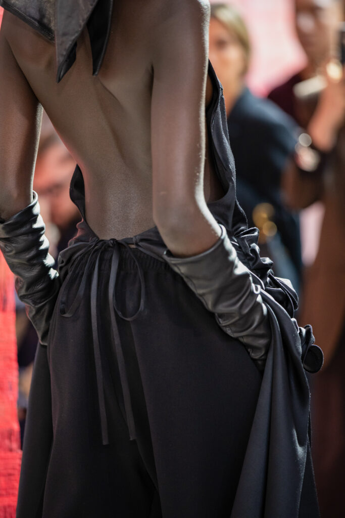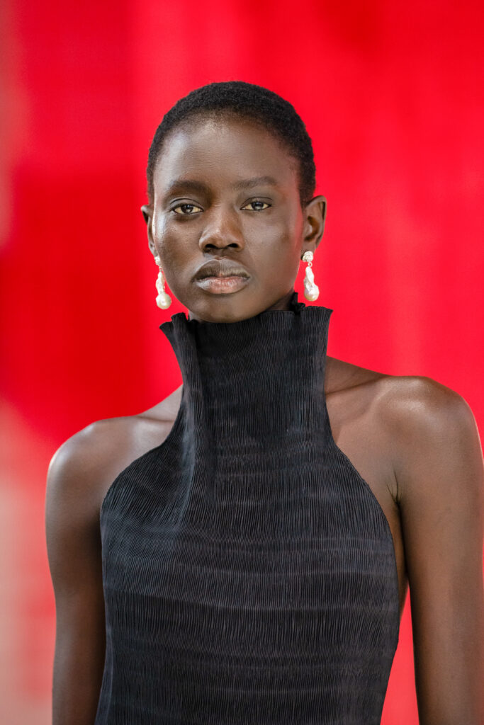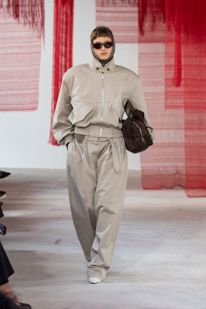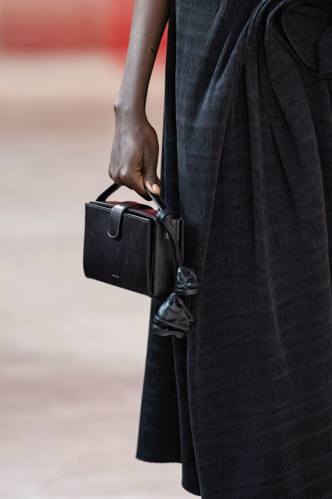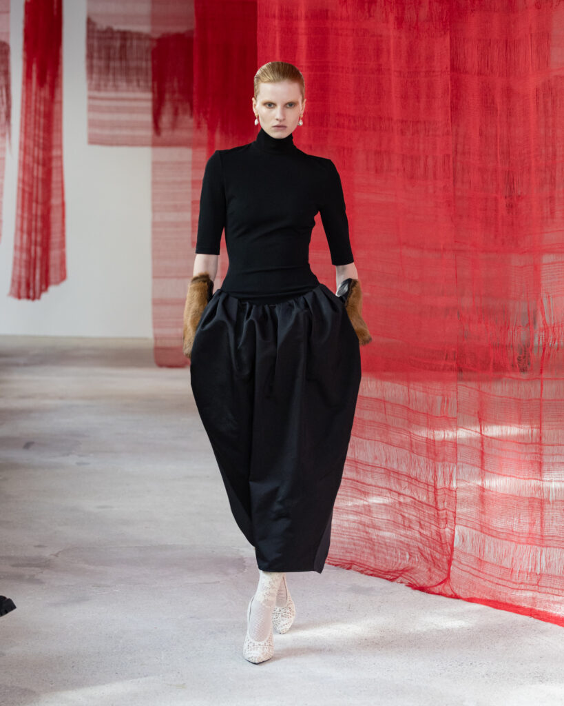 Le savoir-faire textile, mis en avant dans le décor comme dans les vêtements, souligne la volonté de Magda Butrym d’ancrer son travail dans une tradition millénaire tout en explorant de nouvelles possibilités créatives.