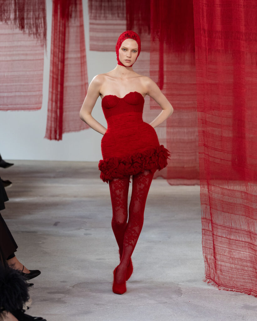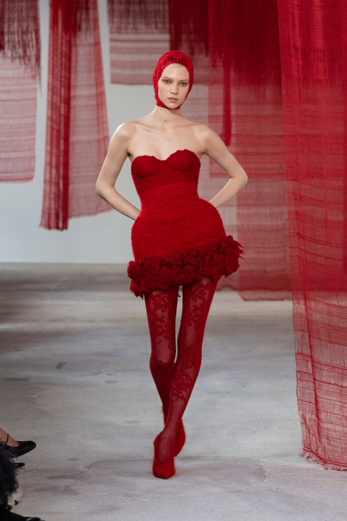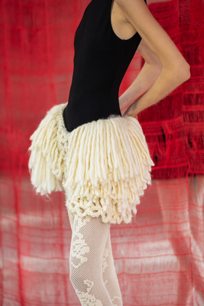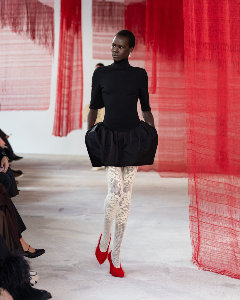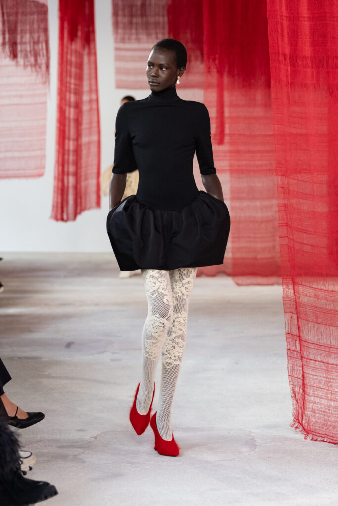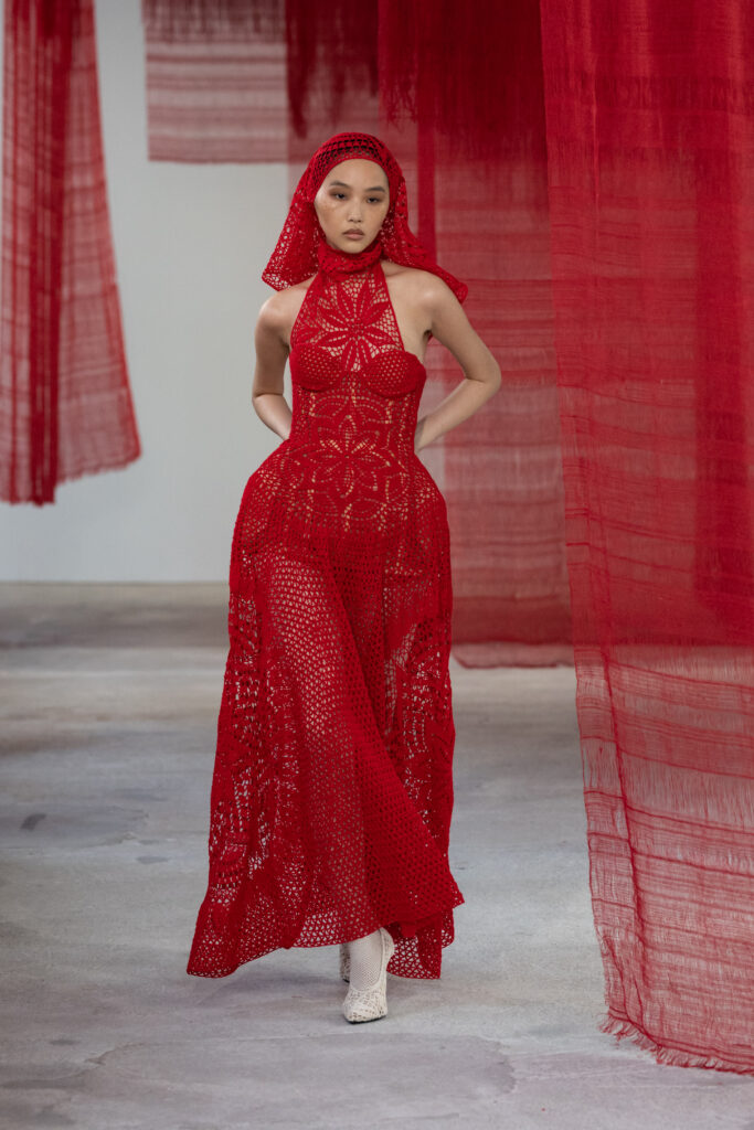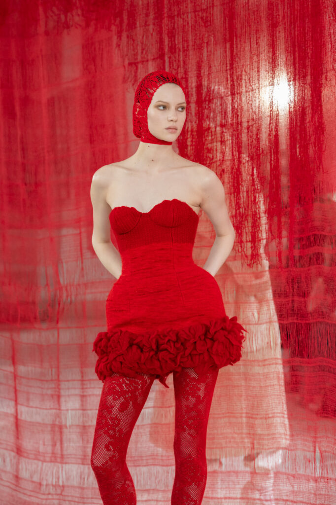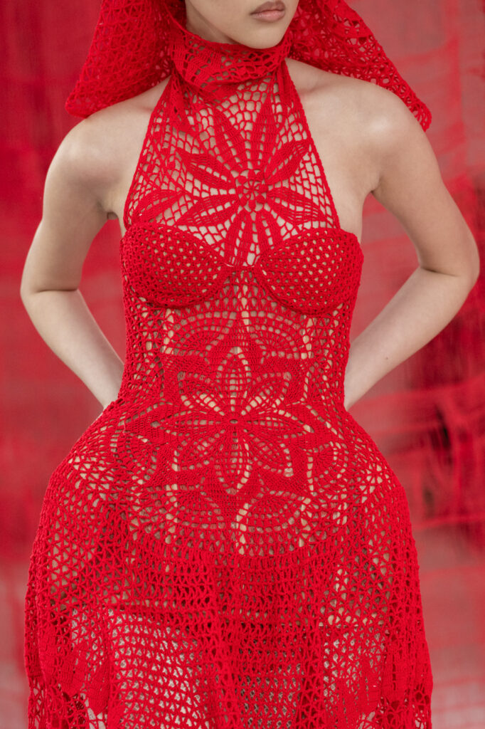 Les influences sont multiples, mais toujours filtrées par un prisme slavique et romantique. Le tissage, élément central du patrimoine artisanal polonais, s’invite dans des créations aux textures riches et aux volumes audacieux. Les robes iconiques de la collection – une mini-robe rouge flamboyante, un tutu en tricot ouvert porté sur une combinaison noire ultra-fluide – sont des hymnes à la féminité assumée et libérée.