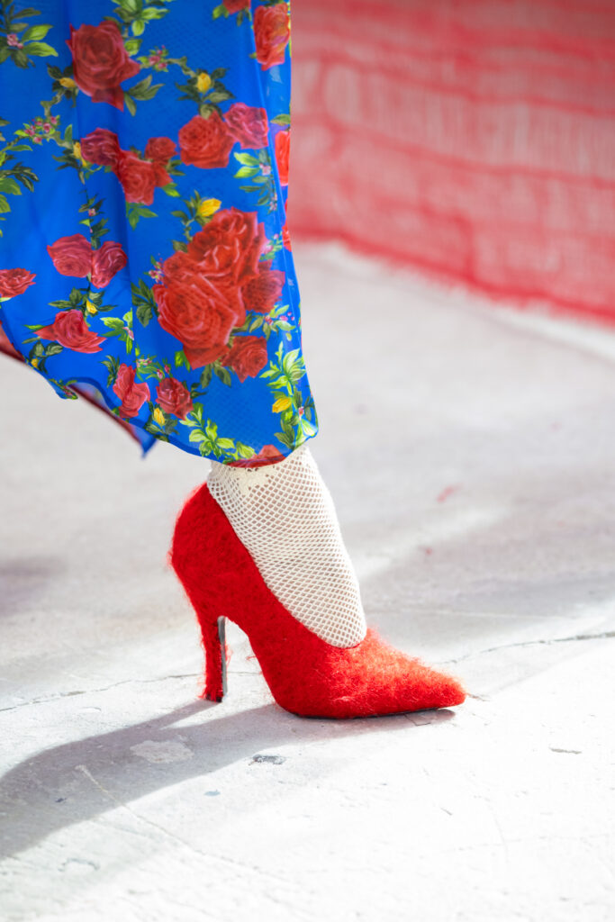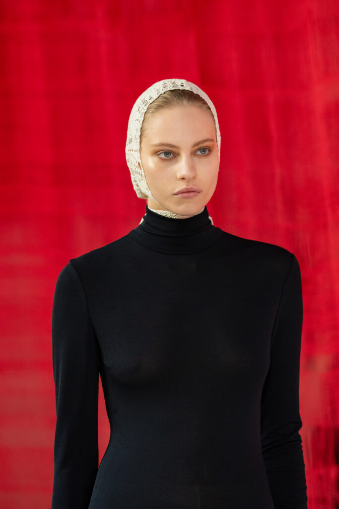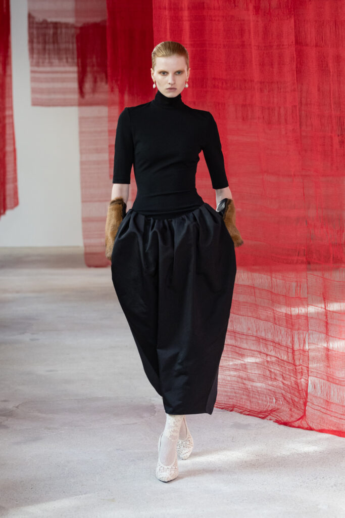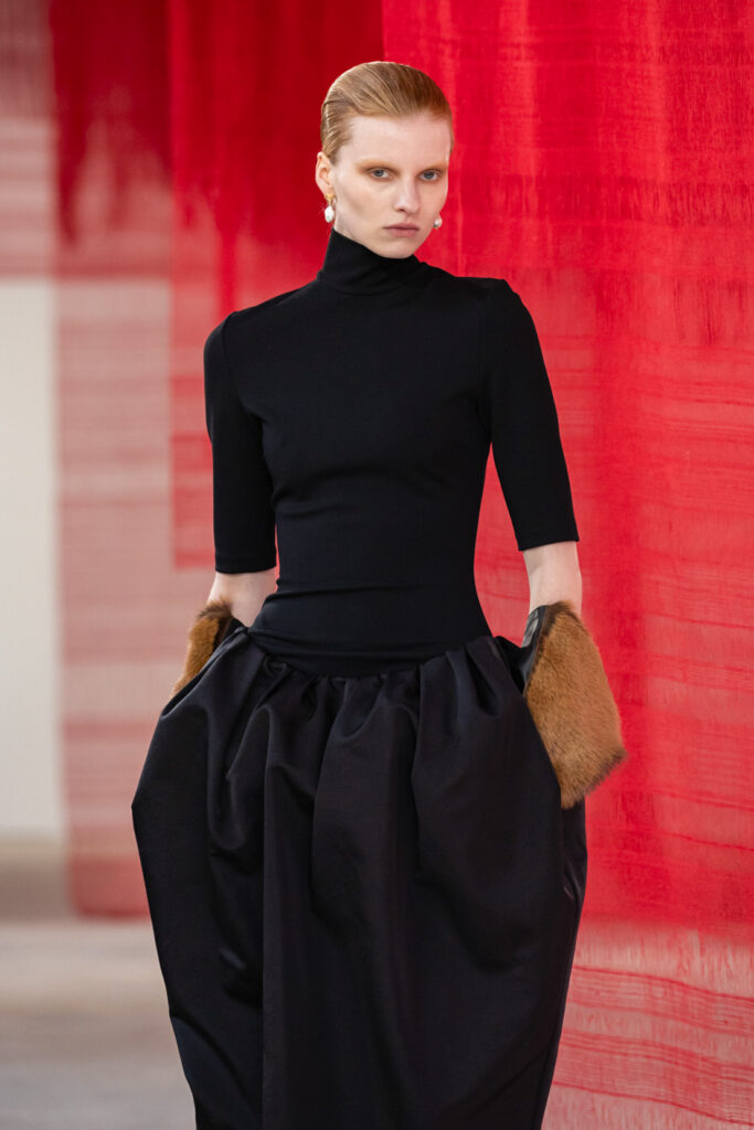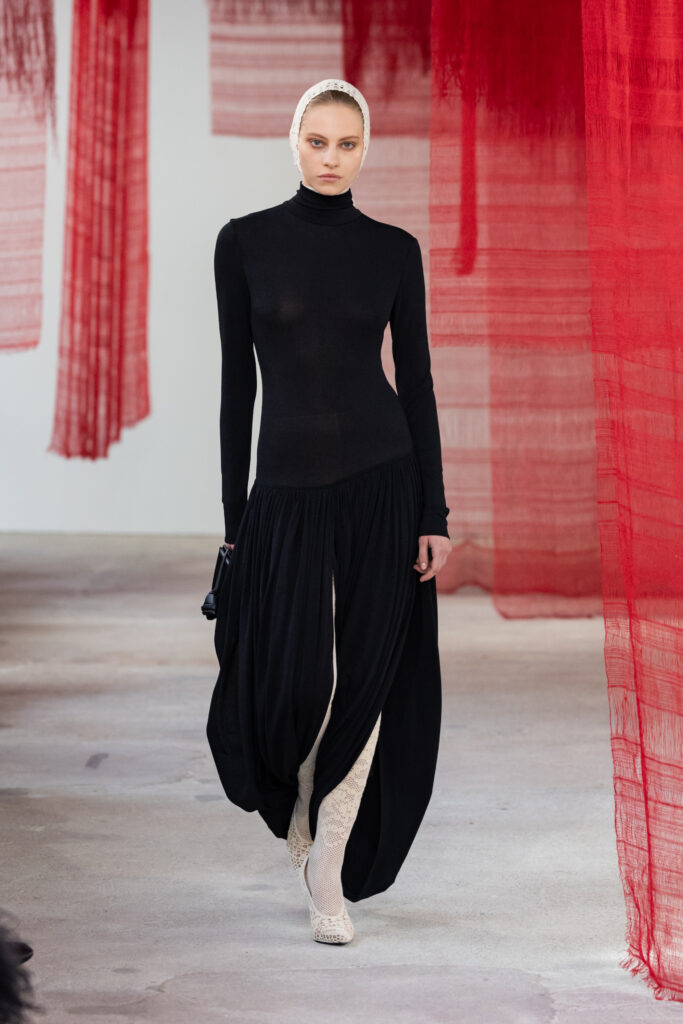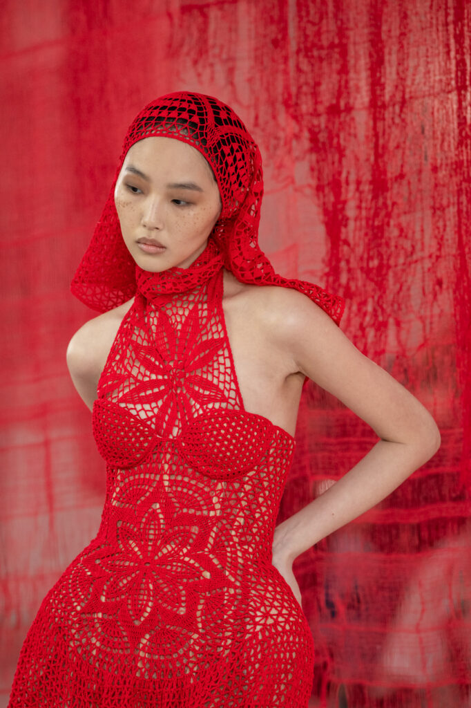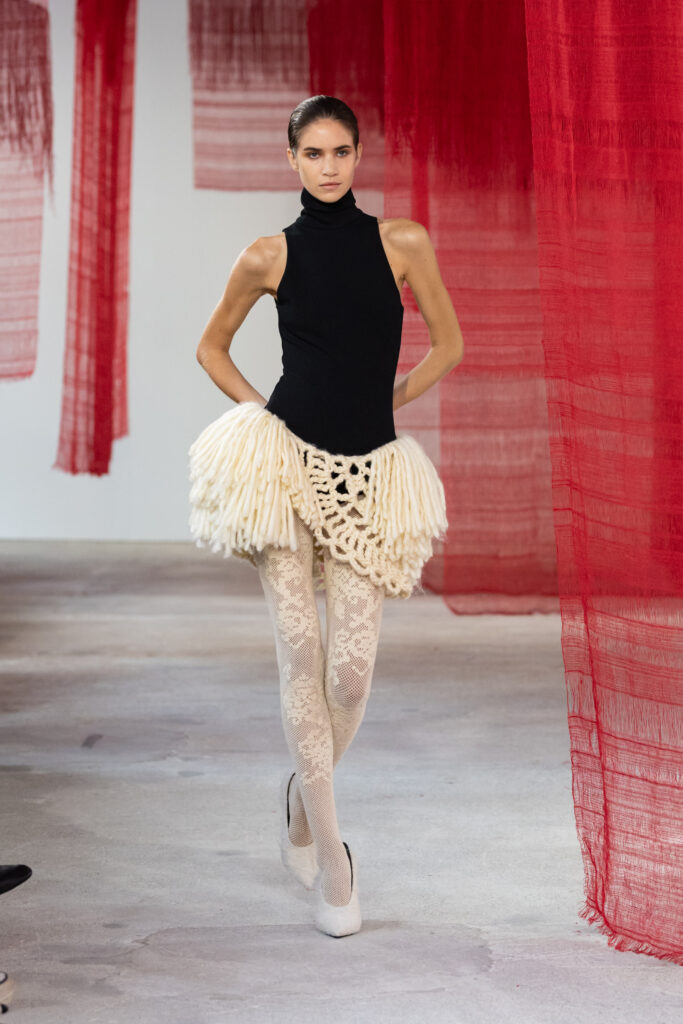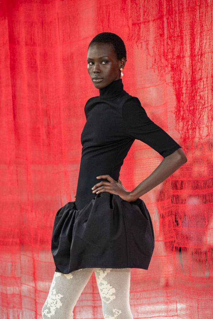 Les influences sont multiples, mais toujours filtrées par un prisme slavique et romantique. Le tissage, élément central du patrimoine artisanal polonais, s’invite dans des créations aux textures riches et aux volumes audacieux. Les robes iconiques de la collection – une mini-robe rouge flamboyante, un tutu en tricot ouvert porté sur une combinaison noire ultra-fluide – sont des hymnes à la féminité assumée et libérée.