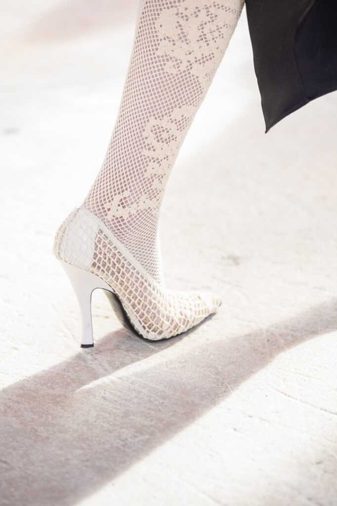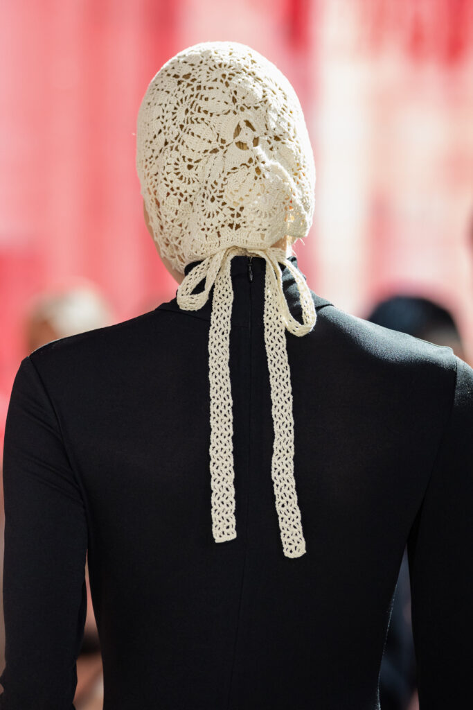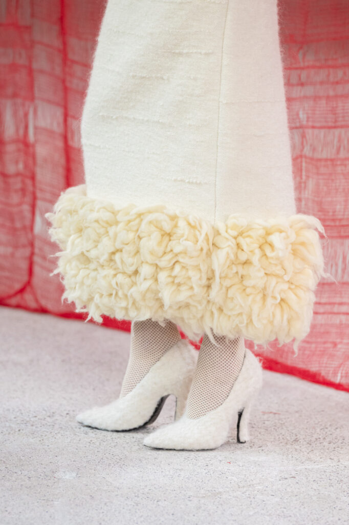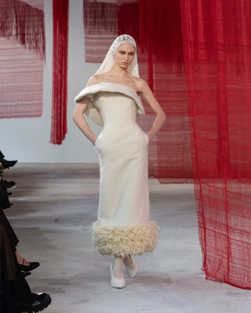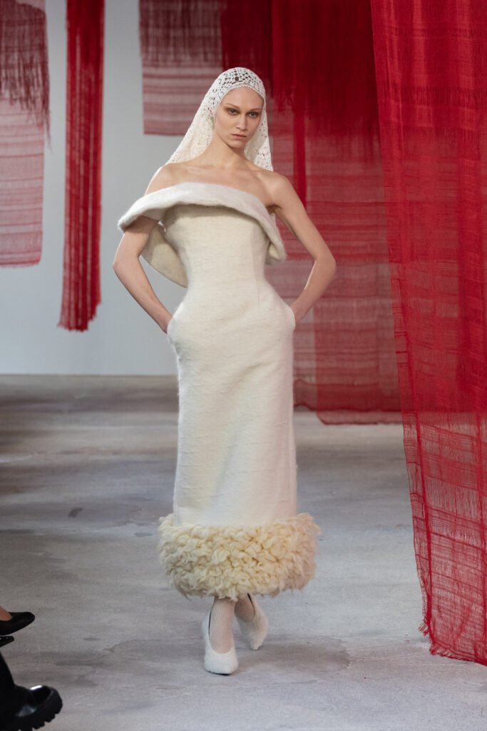 Le final du show dévoile l’une des pièces les plus marquantes : une robe de mariée accompagnée d’un voile en crochet et de souliers texturés façon nuages. La silhouette, dense et structurée, évoque les tapisseries traditionnelles polonaises, tout en incarnant une esthétique contemporaine et minimaliste.