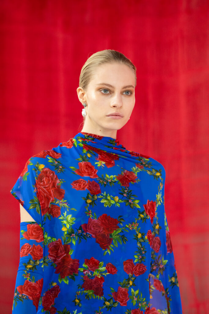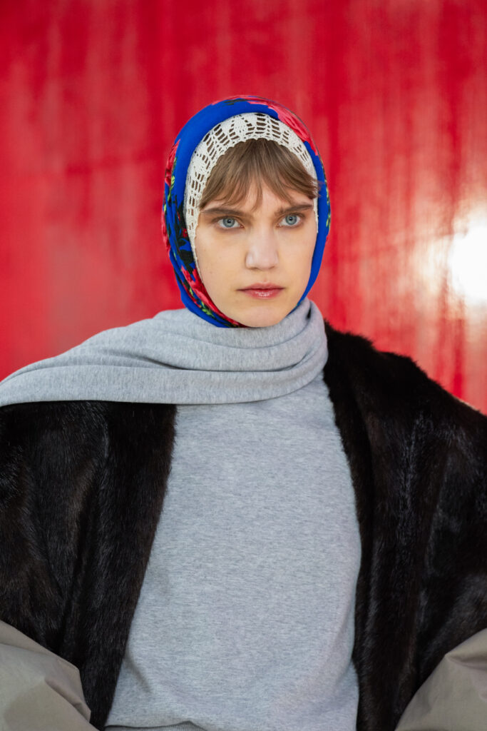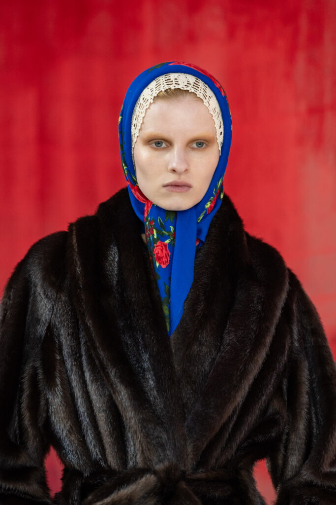 Le foulard fleuri, signature de la maison, s’affirme comme un hommage au folklore slave, tout en insufflant une touche contemporaine.