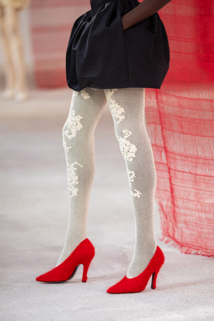 Butrym joue avec une palette de blancs éclatants, de rouges profonds et de noirs charbonneux, trois teintes évocatrices de son héritage et de sa signature esthétique. Le rouge, omniprésent, rappelle la Rose Enchantée, emblème de la maison. Le blanc, symbole de renouveau et de liberté, se décline dans des mailles moelleuses et des dentelles arachnéennes, tandis que le noir évoque une force mystérieuse et magnétique.