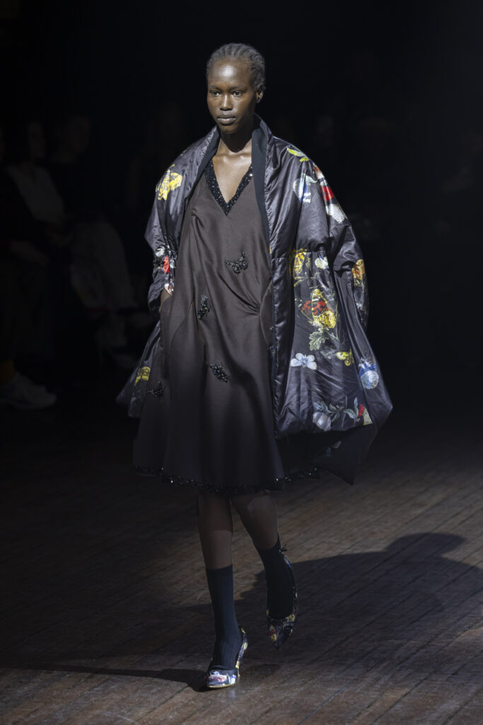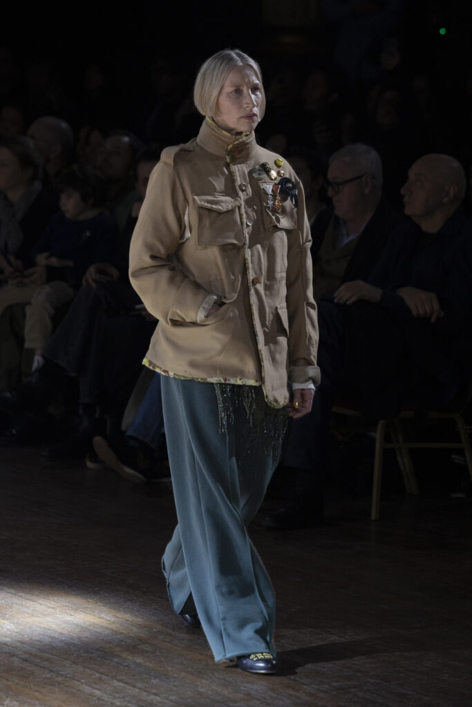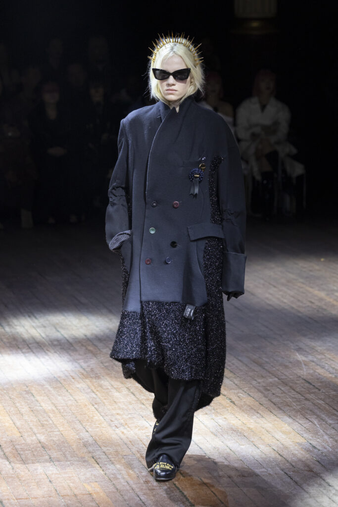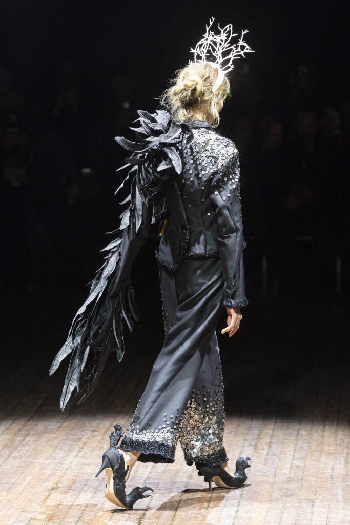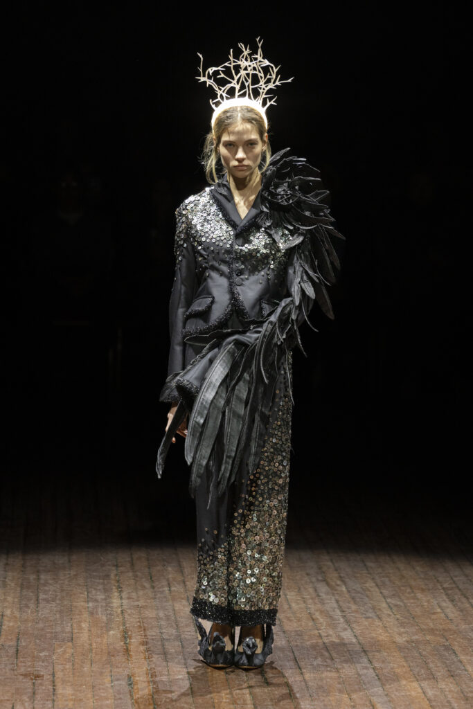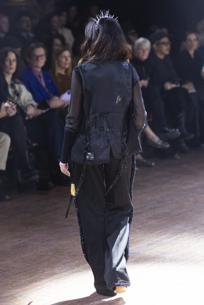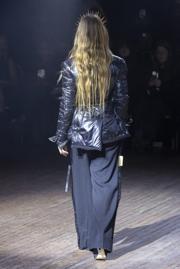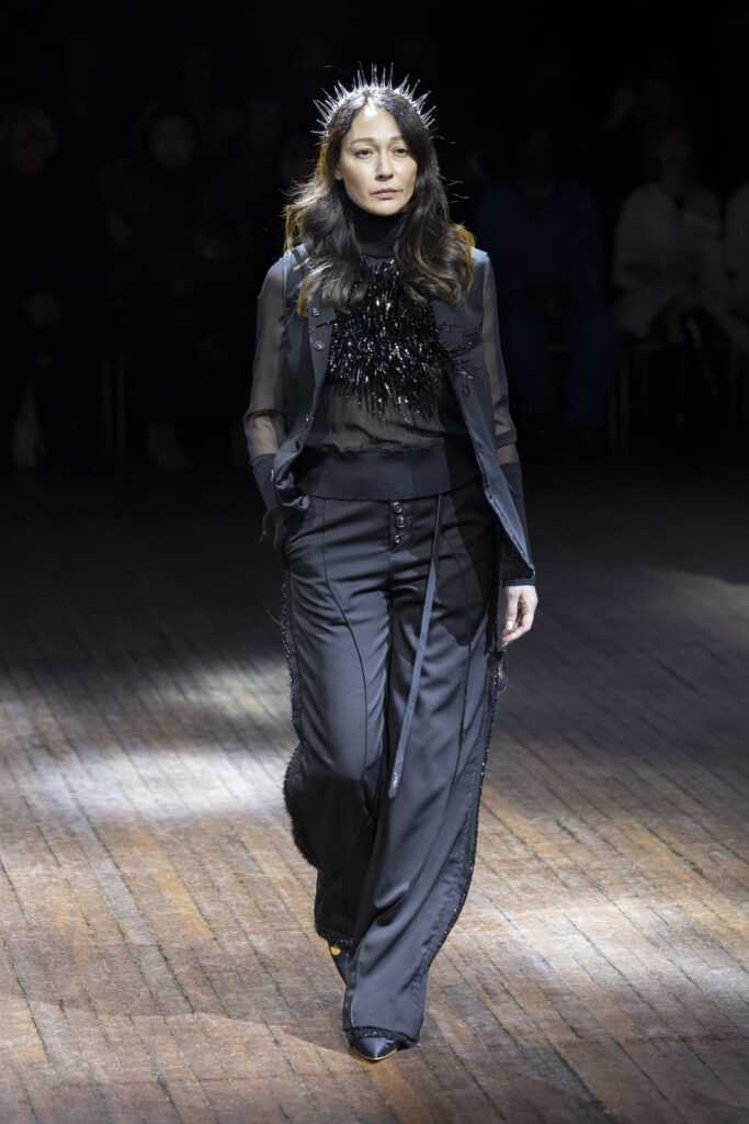 Les vestes aux épaules acérées dialoguaient avec des robes fluides, ponctuées de détails inattendus : empiècements en soie dévorée, broderies en relief et jeux de transparences. La palette oscillait entre noir profond, gris anthracite, bordeaux fané et éclats métalliques, conférant aux silhouettes une allure sombrement sophistiquée.