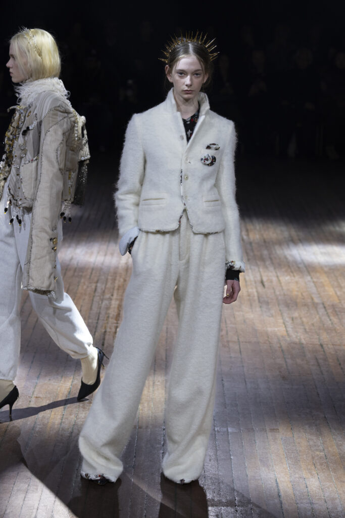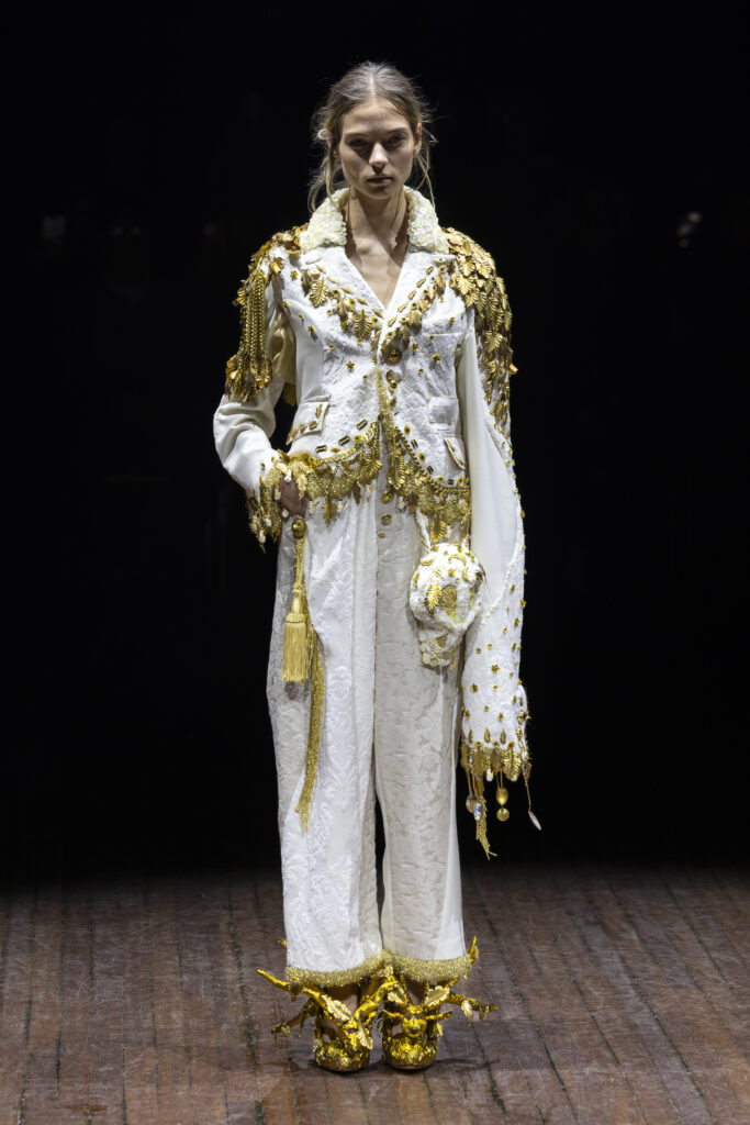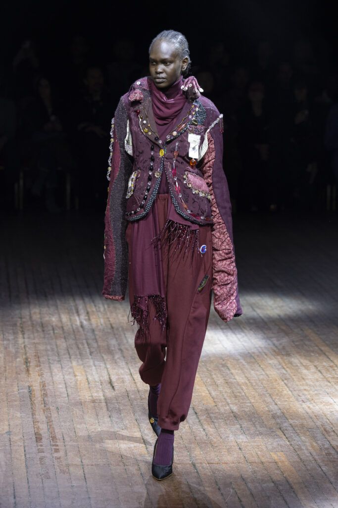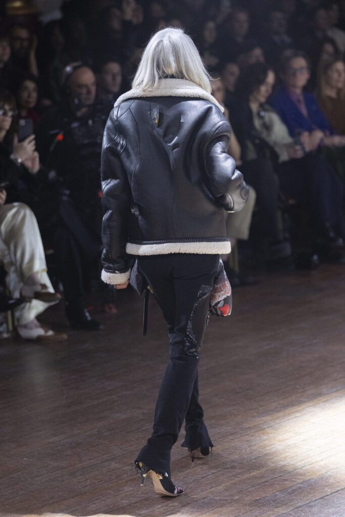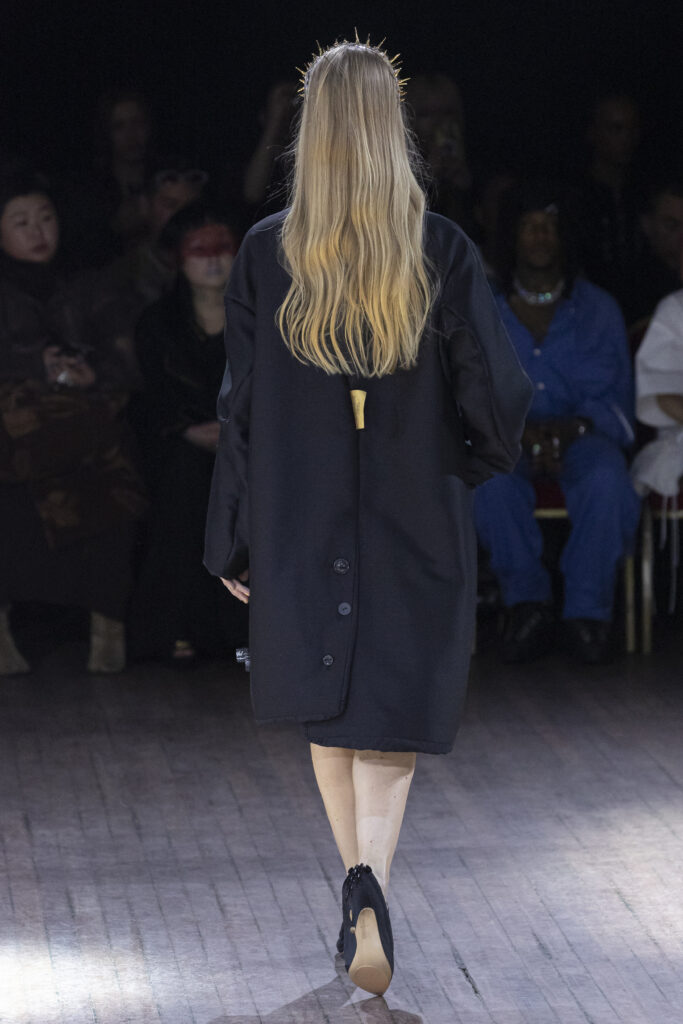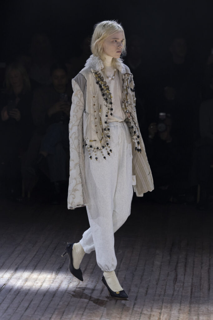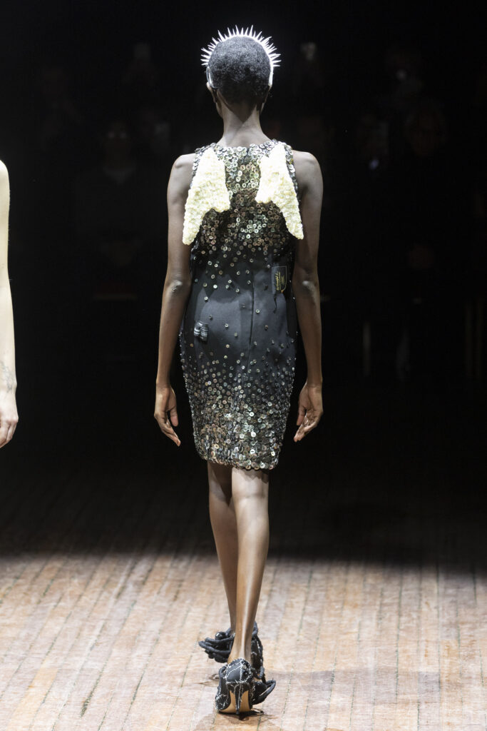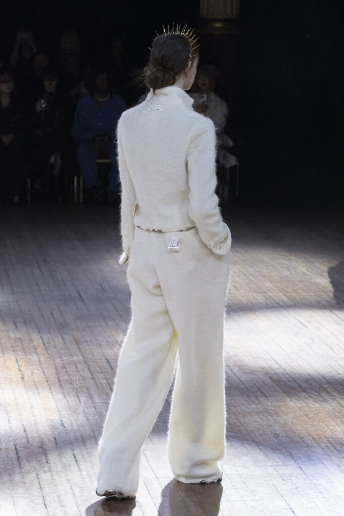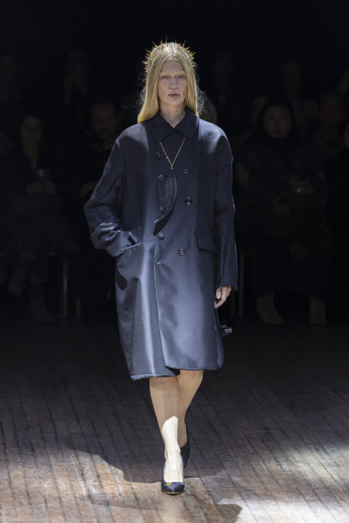 Les vestes aux épaules acérées dialoguaient avec des robes fluides, ponctuées de détails inattendus : empiècements en soie dévorée, broderies en relief et jeux de transparences. La palette oscillait entre noir profond, gris anthracite, bordeaux fané et éclats métalliques, conférant aux silhouettes une allure sombrement sophistiquée.