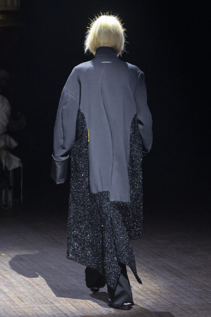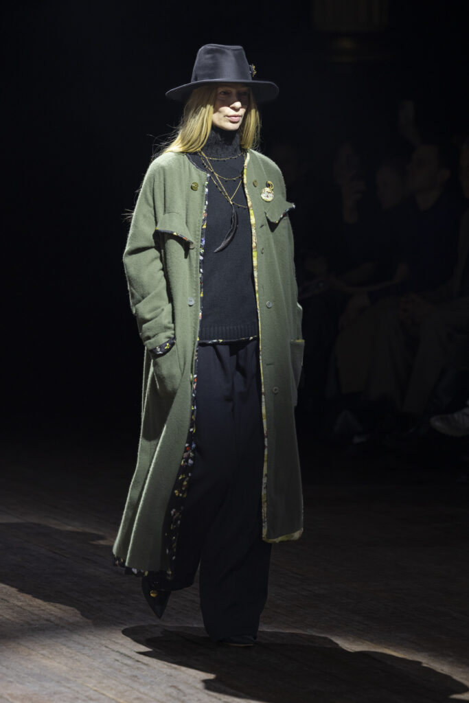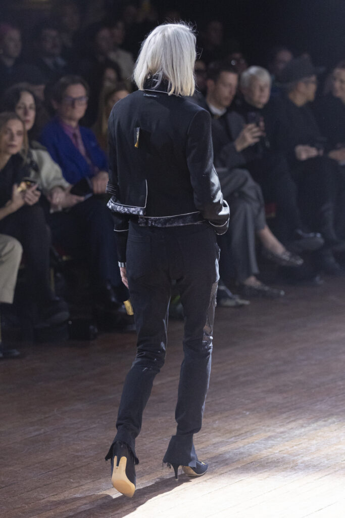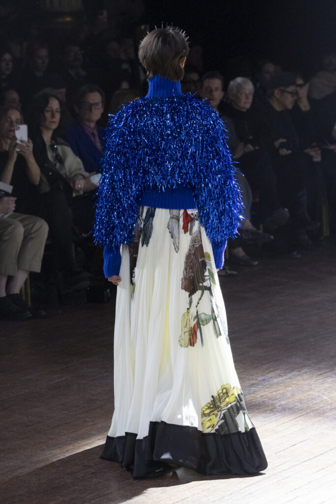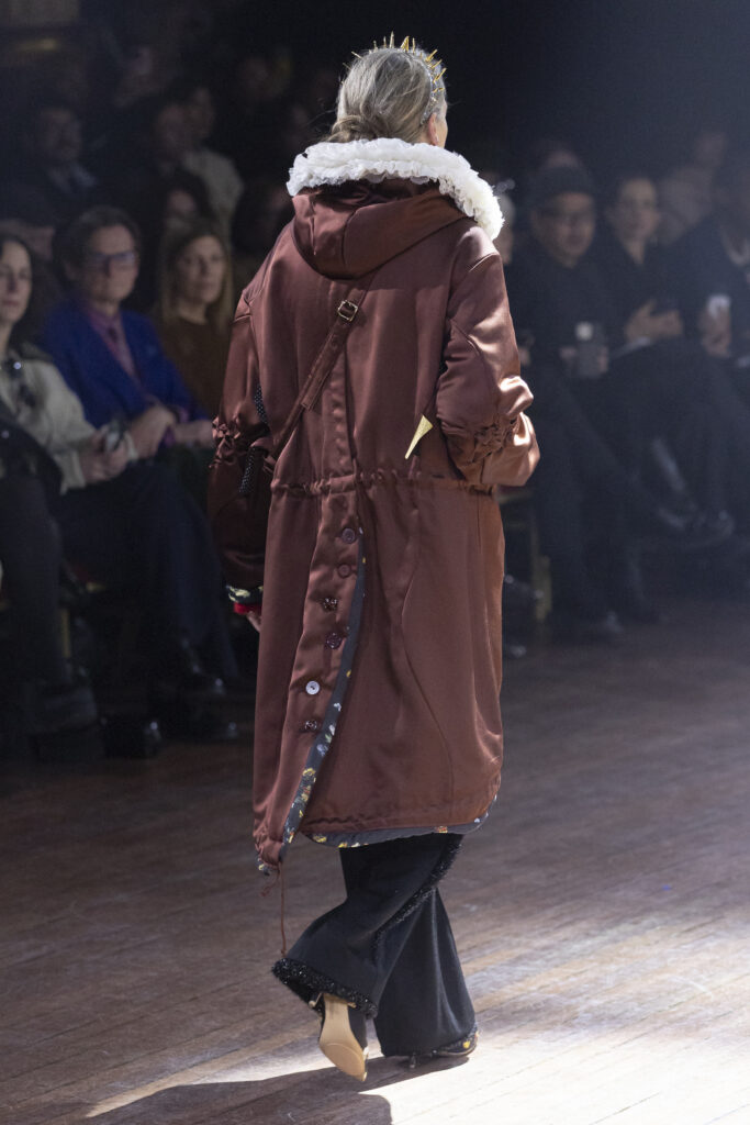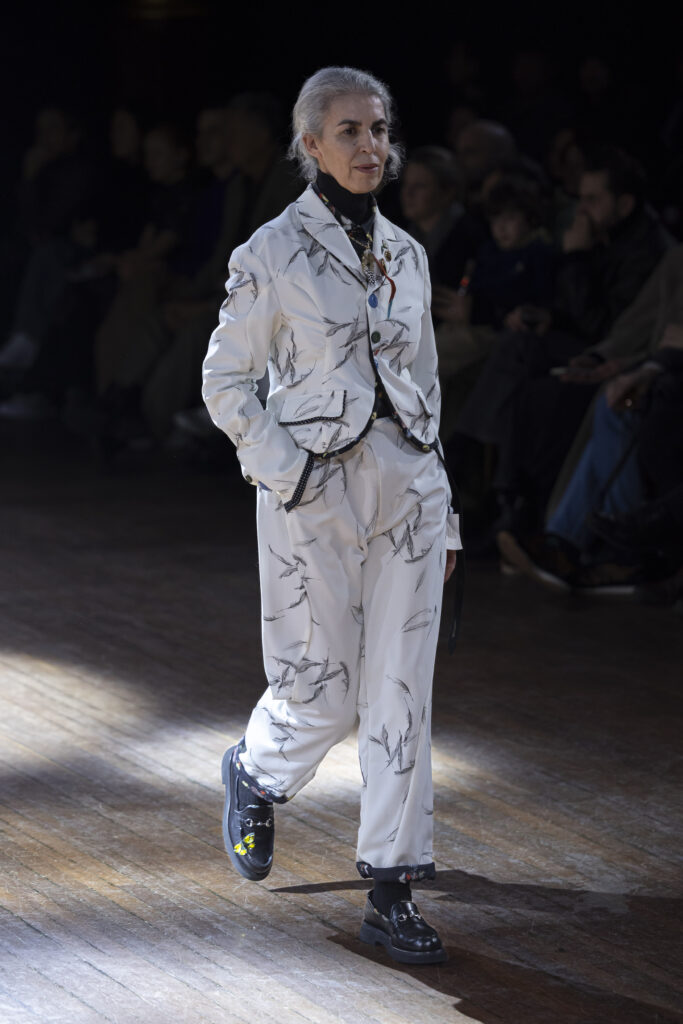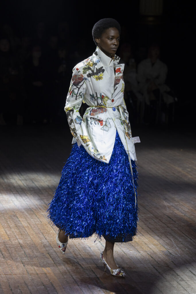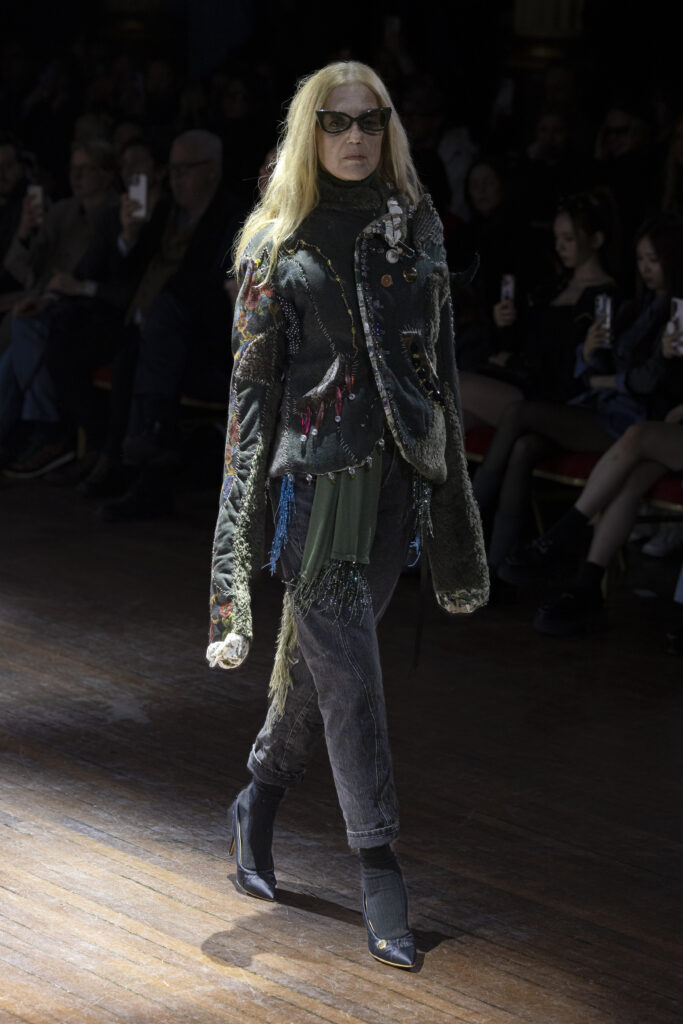 Les vestes aux épaules acérées dialoguaient avec des robes fluides, ponctuées de détails inattendus : empiècements en soie dévorée, broderies en relief et jeux de transparences. La palette oscillait entre noir profond, gris anthracite, bordeaux fané et éclats métalliques, conférant aux silhouettes une allure sombrement sophistiquée.