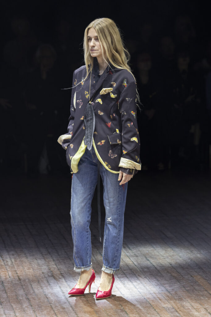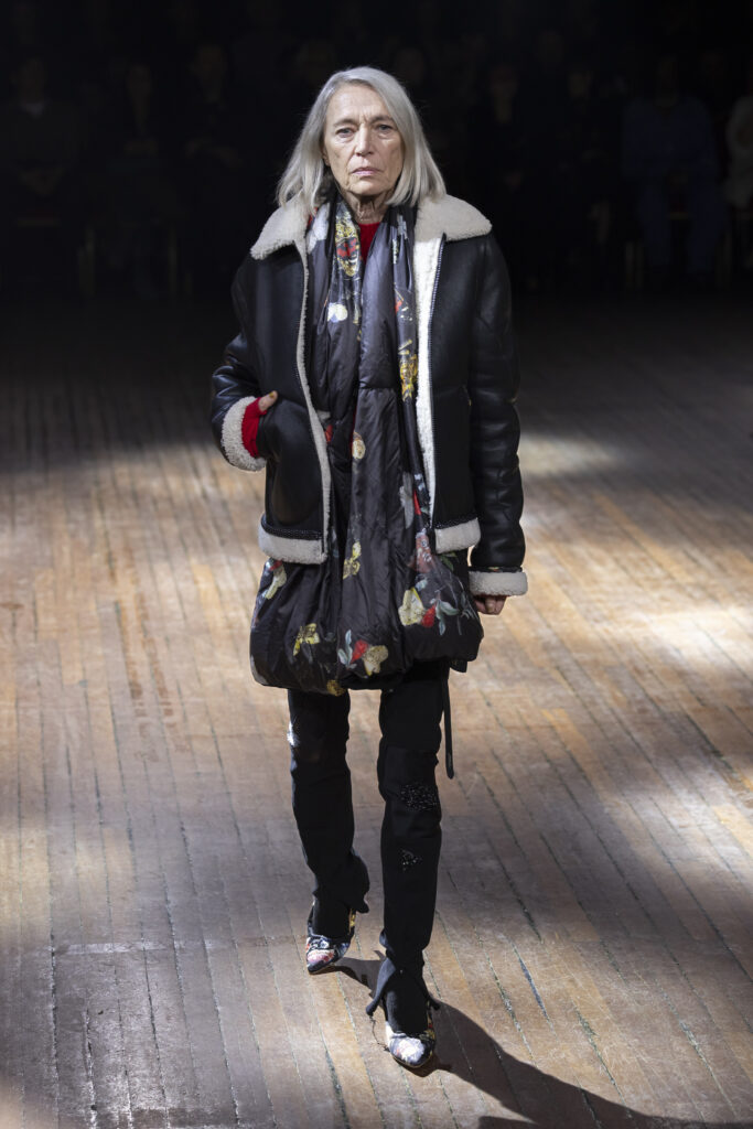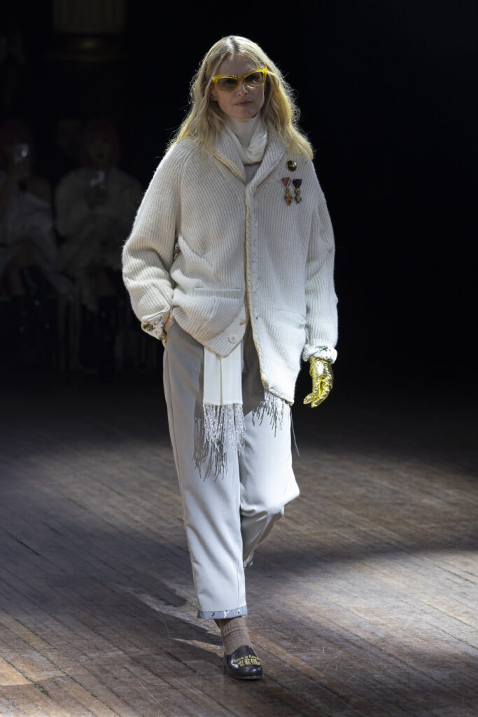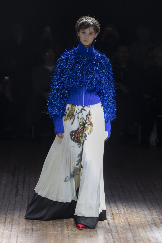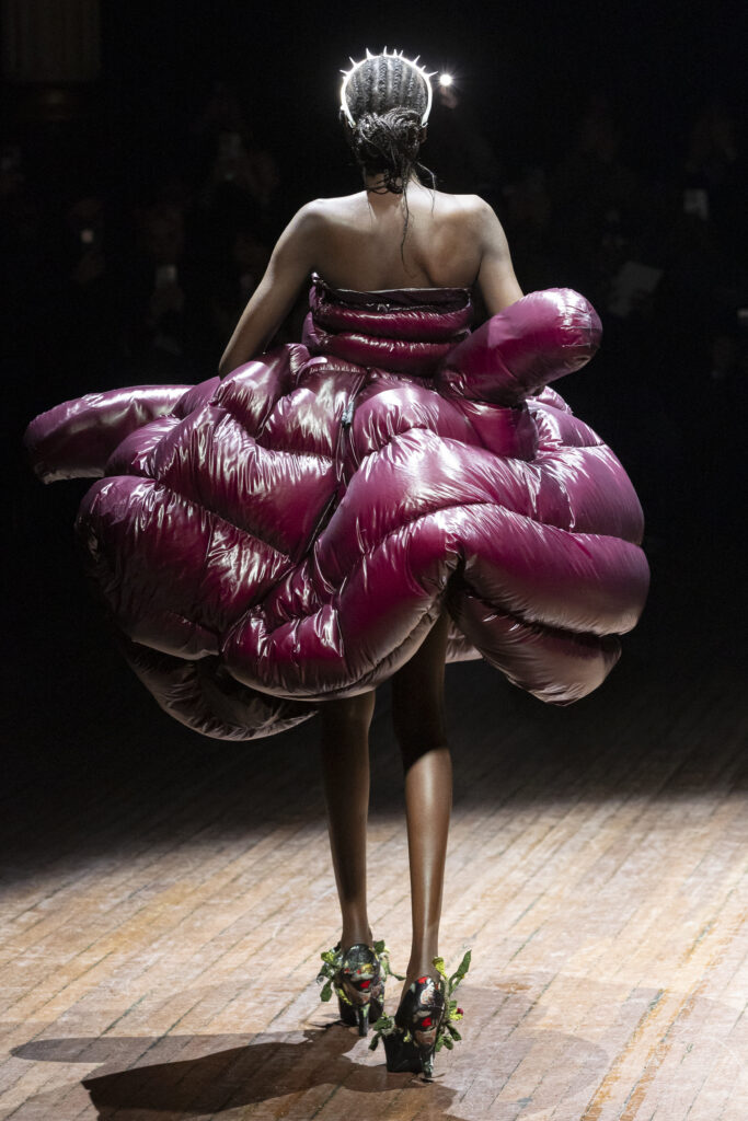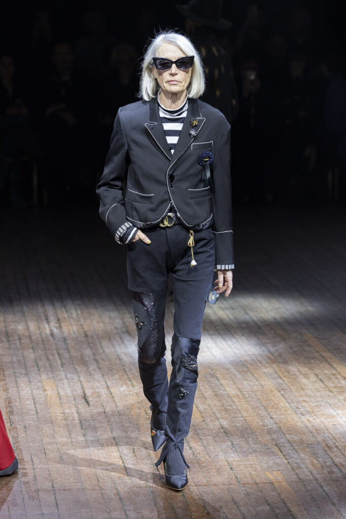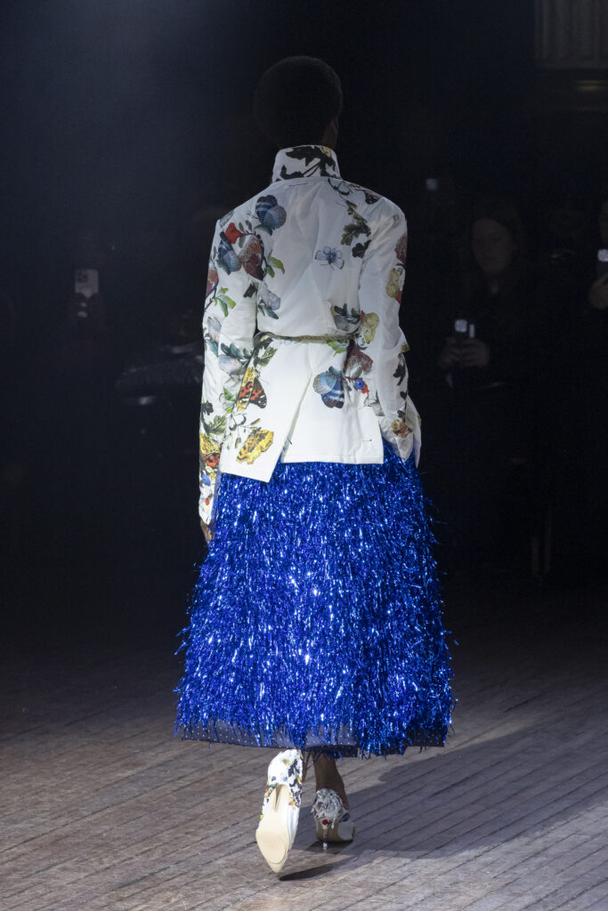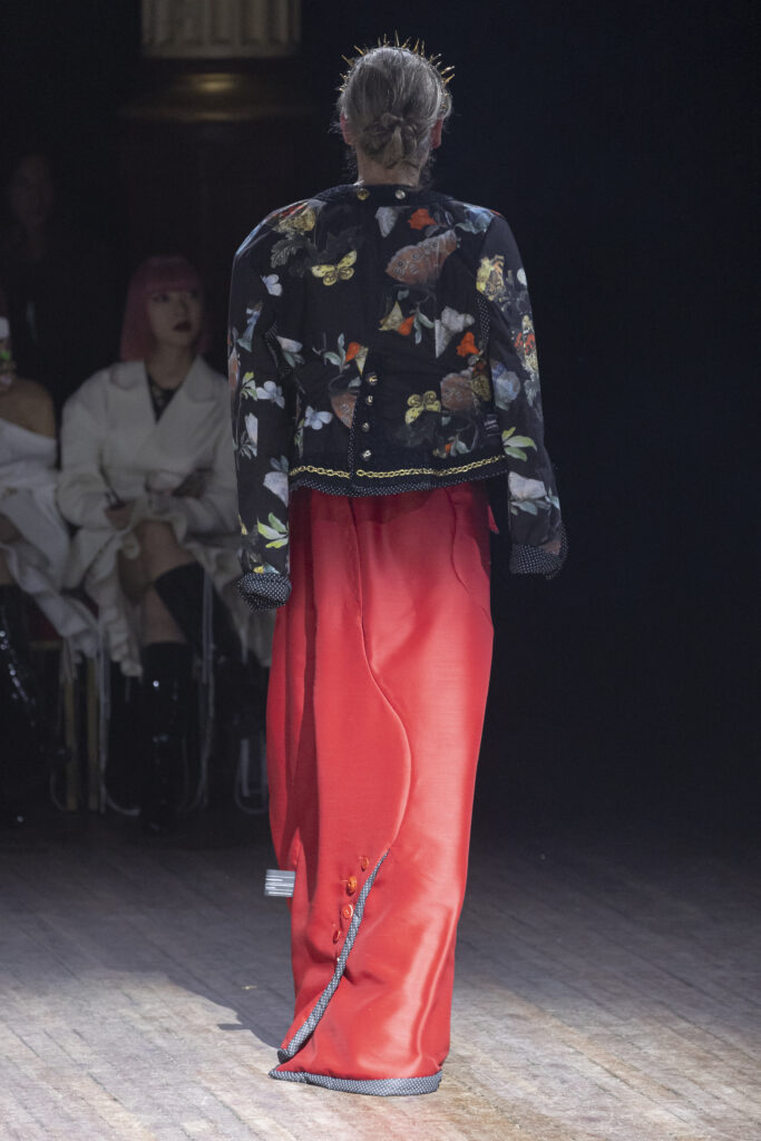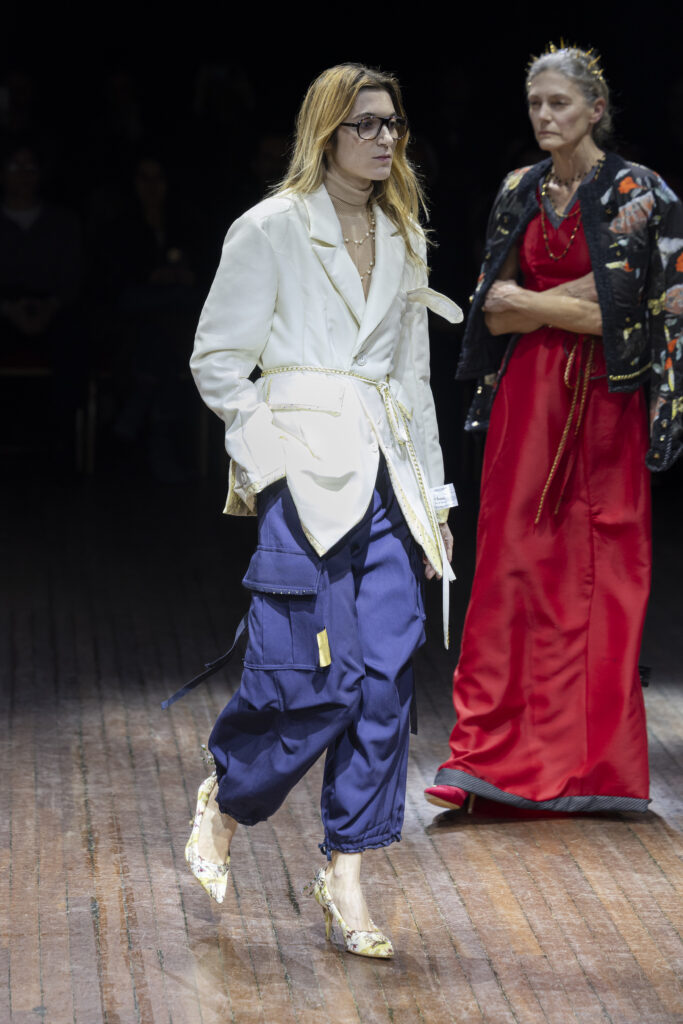 Les vestes aux épaules acérées dialoguaient avec des robes fluides, ponctuées de détails inattendus : empiècements en soie dévorée, broderies en relief et jeux de transparences. La palette oscillait entre noir profond, gris anthracite, bordeaux fané et éclats métalliques, conférant aux silhouettes une allure sombrement sophistiquée.