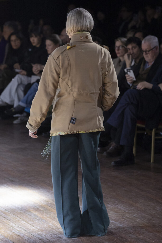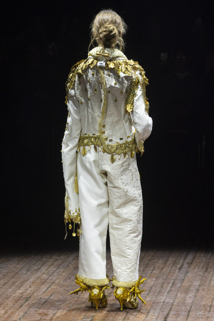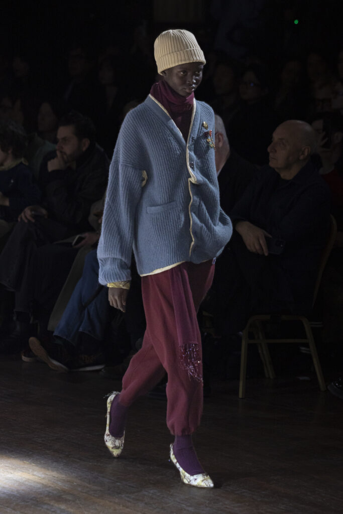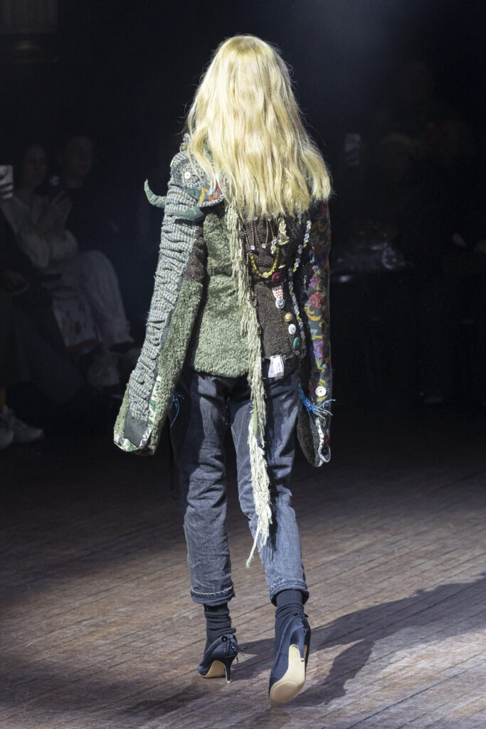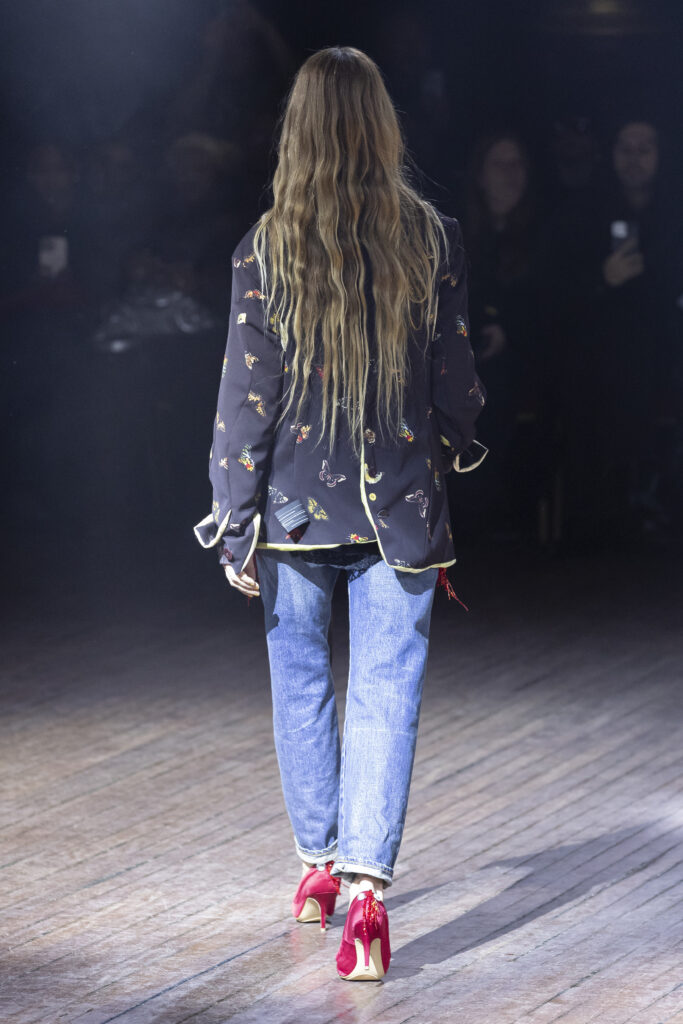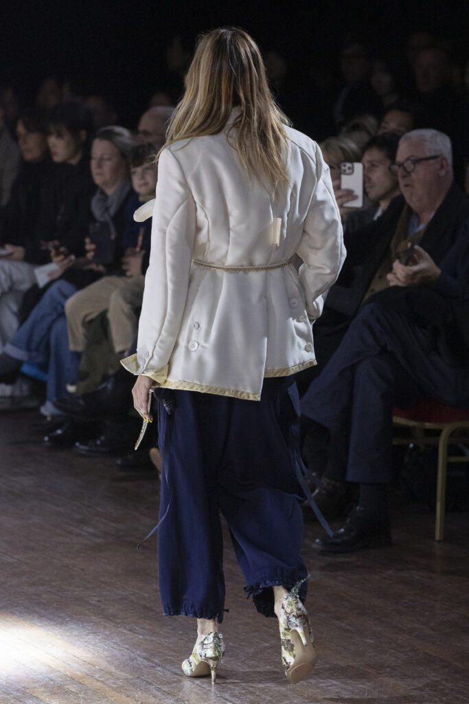 Comme à son habitude, UNDERCOVER a puisé dans une sélection de partenaires pointus pour enrichir son univers. Les chaussures d’Anne-Valérie Dupond, véritables sculptures textiles, fusionnaient mode et art, ajoutant une dimension tactile et conceptuelle à chaque passage.