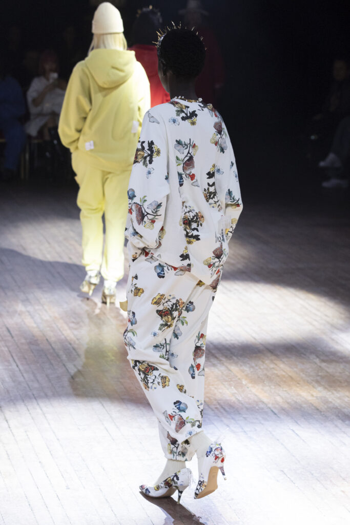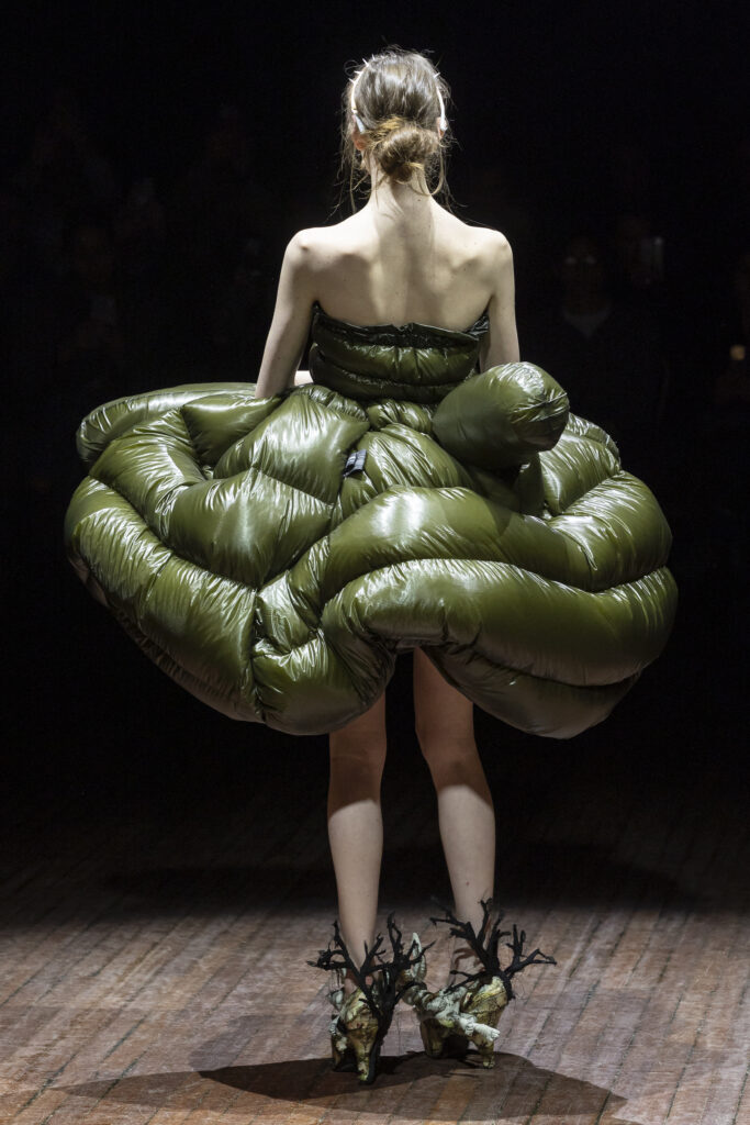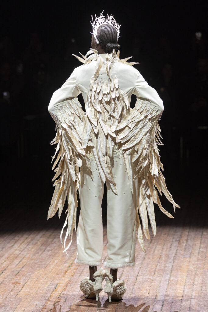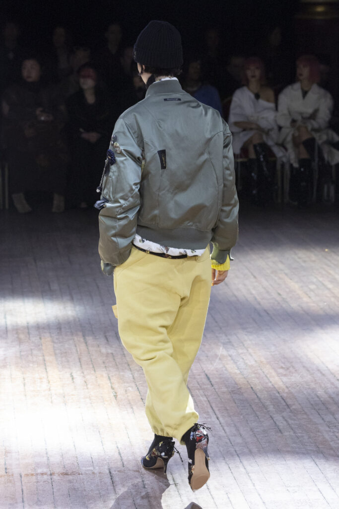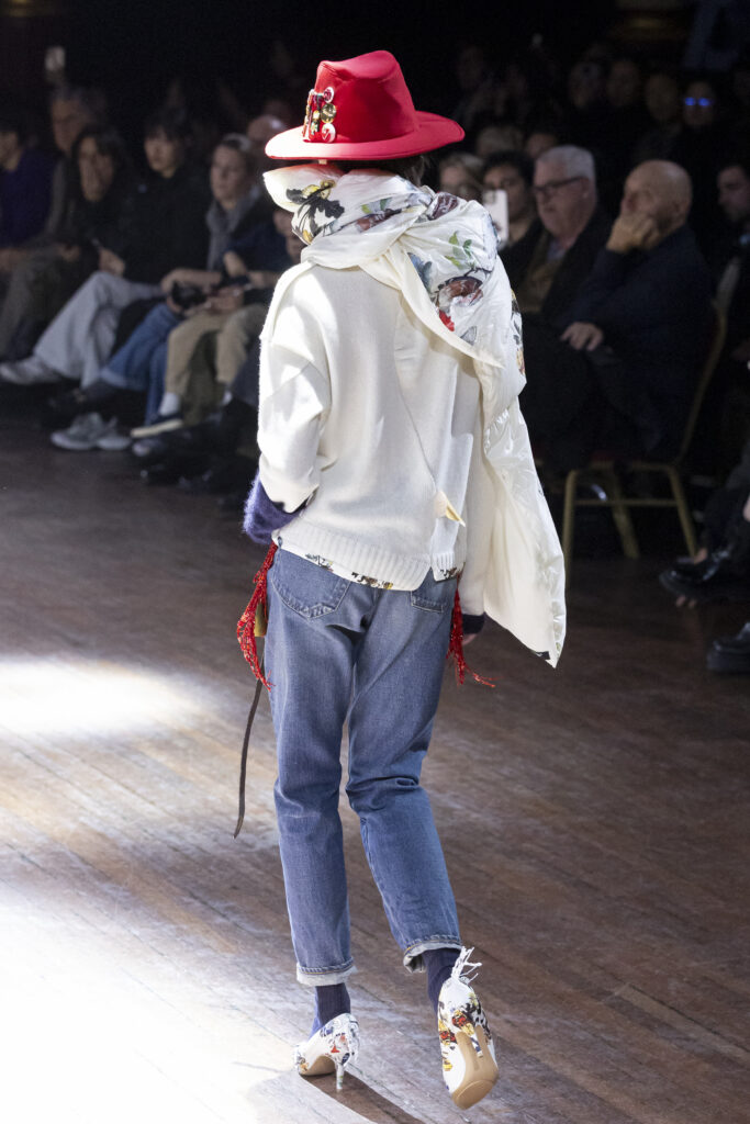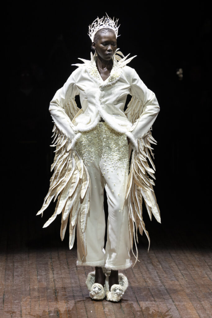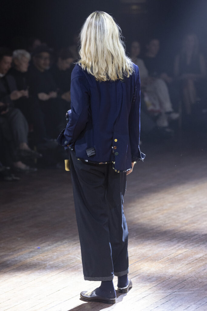 Comme à son habitude, UNDERCOVER a puisé dans une sélection de partenaires pointus pour enrichir son univers. Les chaussures d’Anne-Valérie Dupond, véritables sculptures textiles, fusionnaient mode et art, ajoutant une dimension tactile et conceptuelle à chaque passage.
