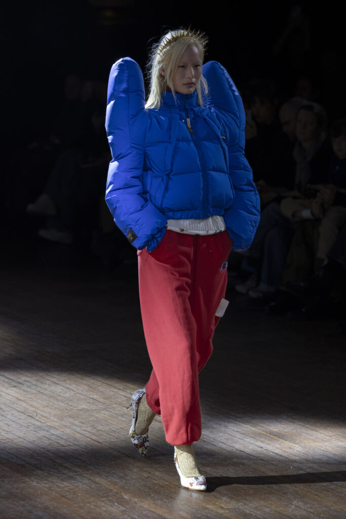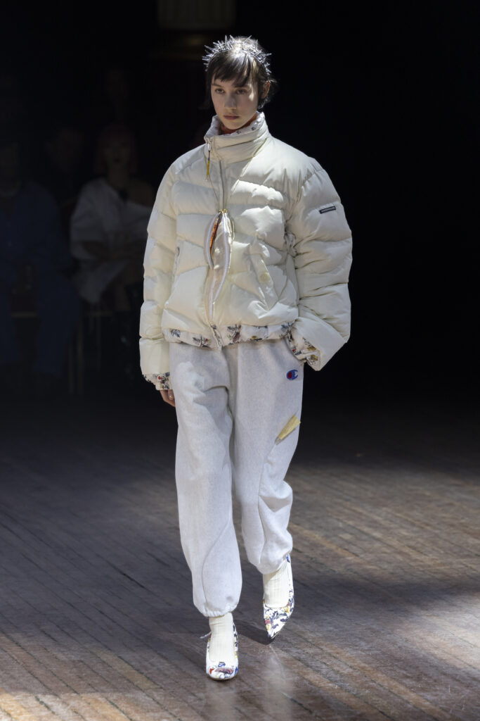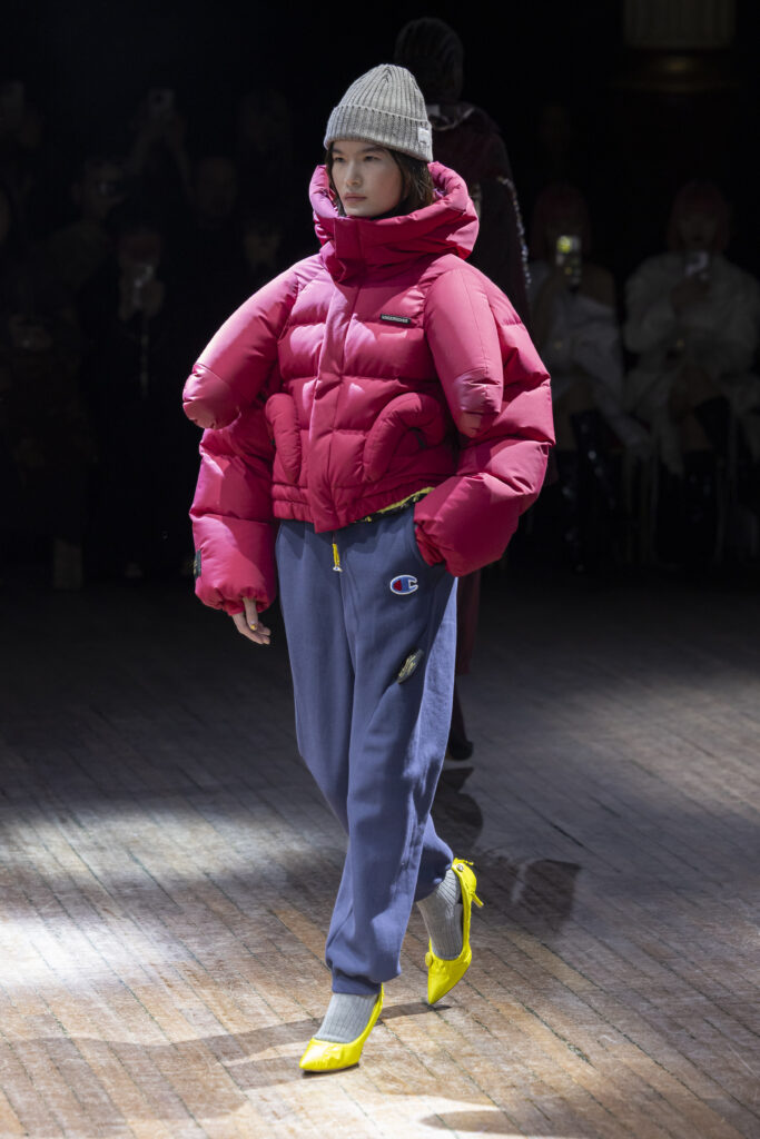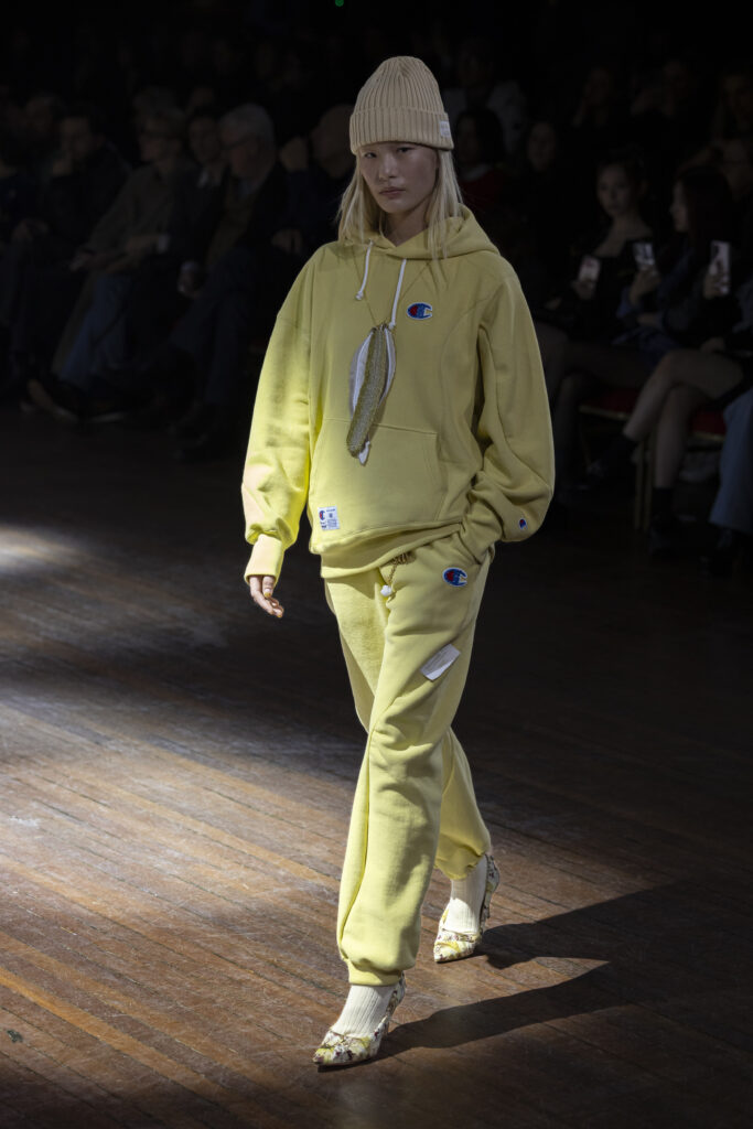 Côté sportswear, la présence de UNDERCOVER x CHAMPION confirmait une volonté de brouiller les frontières entre luxe et streetwear, offrant une alternative confortable et sophistiquée à une garde-robe d’hiver.