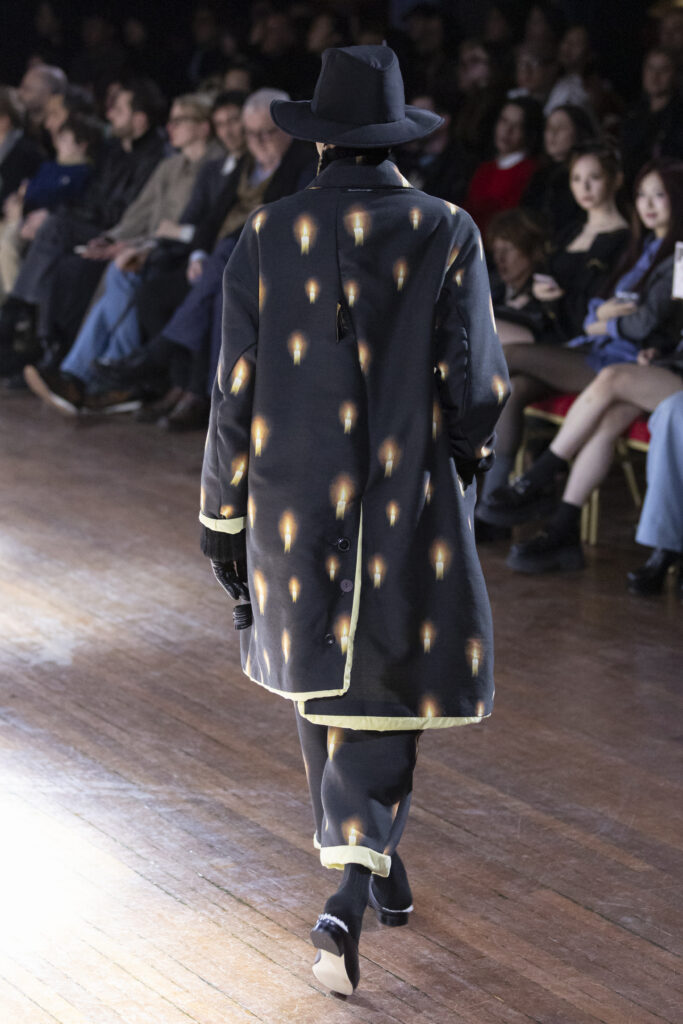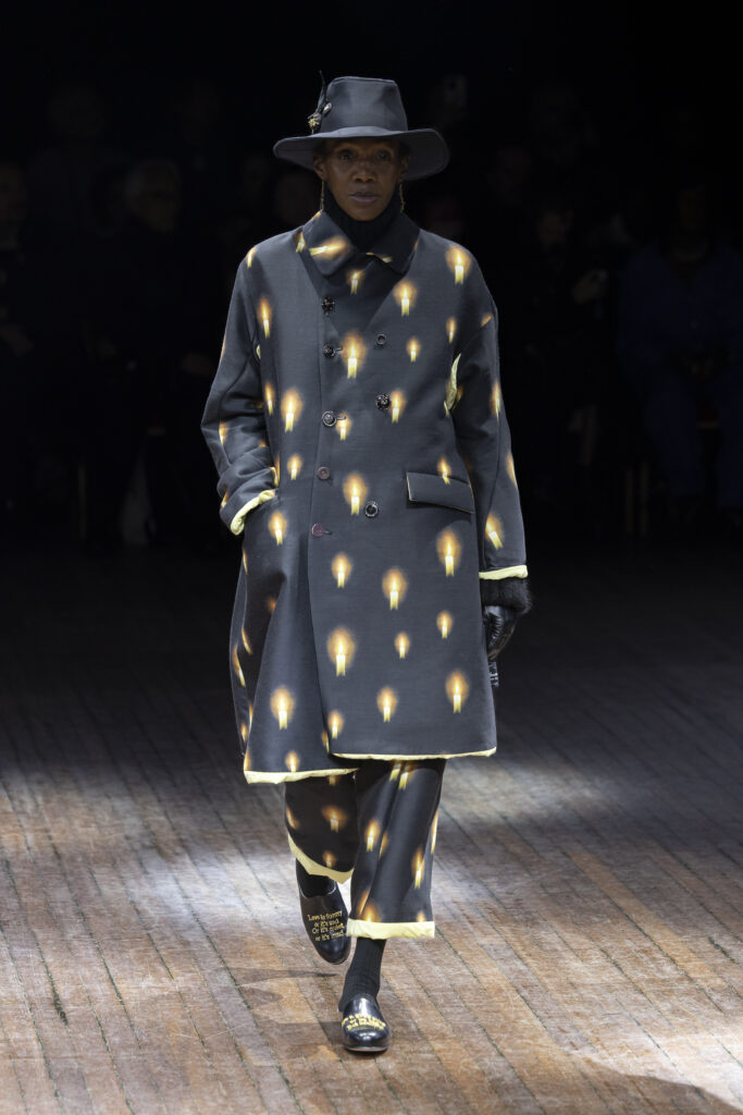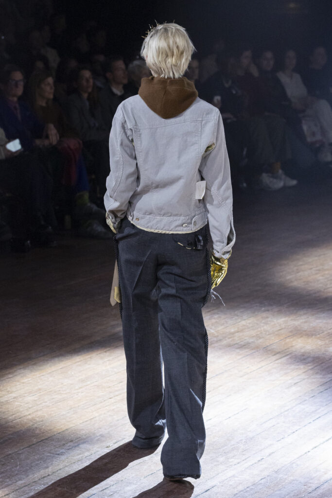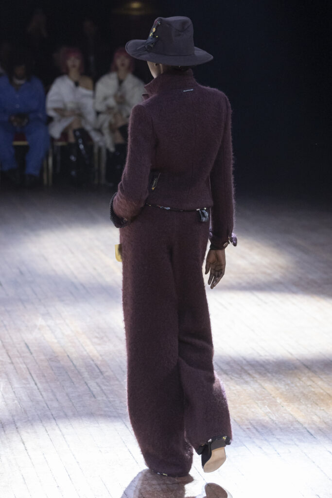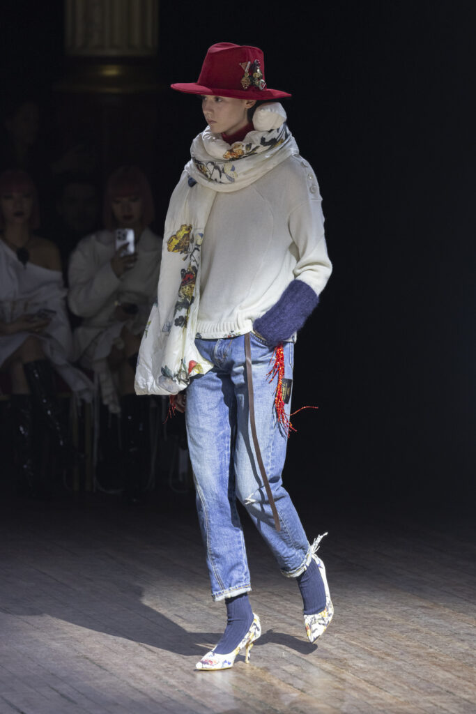 Les accessoires, loin d’être de simples ajouts, structuraient les tenues et leur donnaient une puissance dramatique. Les chapeaux UNDERCOVER x FACTORY900 et UNDERCOVER x KIJIMA TAKAYUKI apportaient une touche théâtrale, évoquant tantôt le cabaret berlinois, tantôt les silhouettes monastiques d’un film expressionniste.