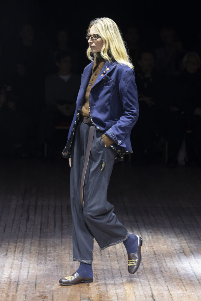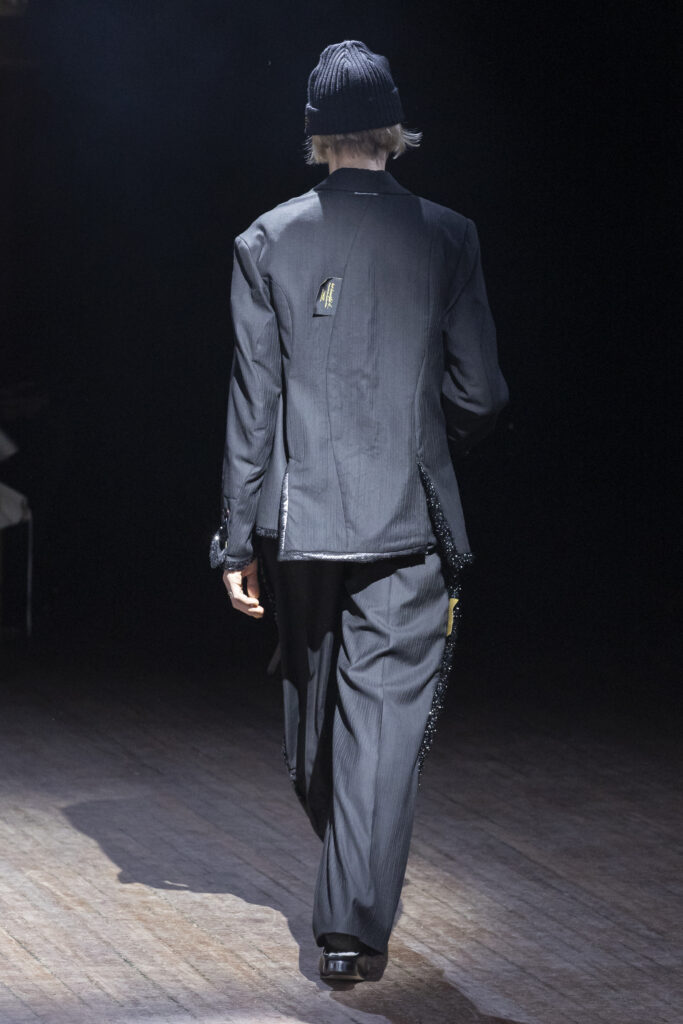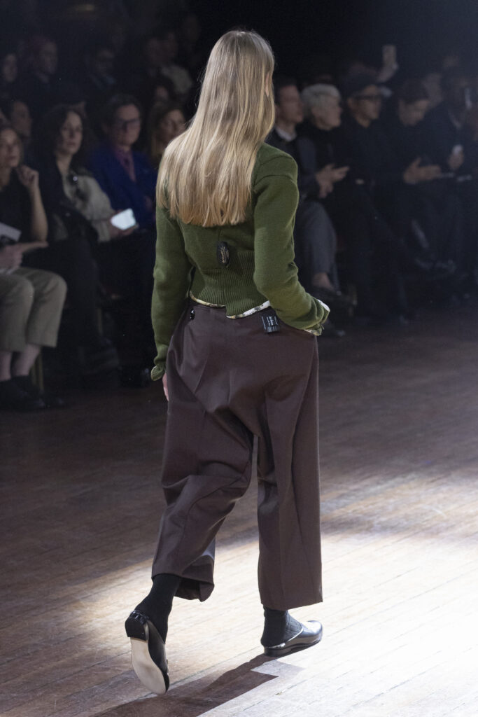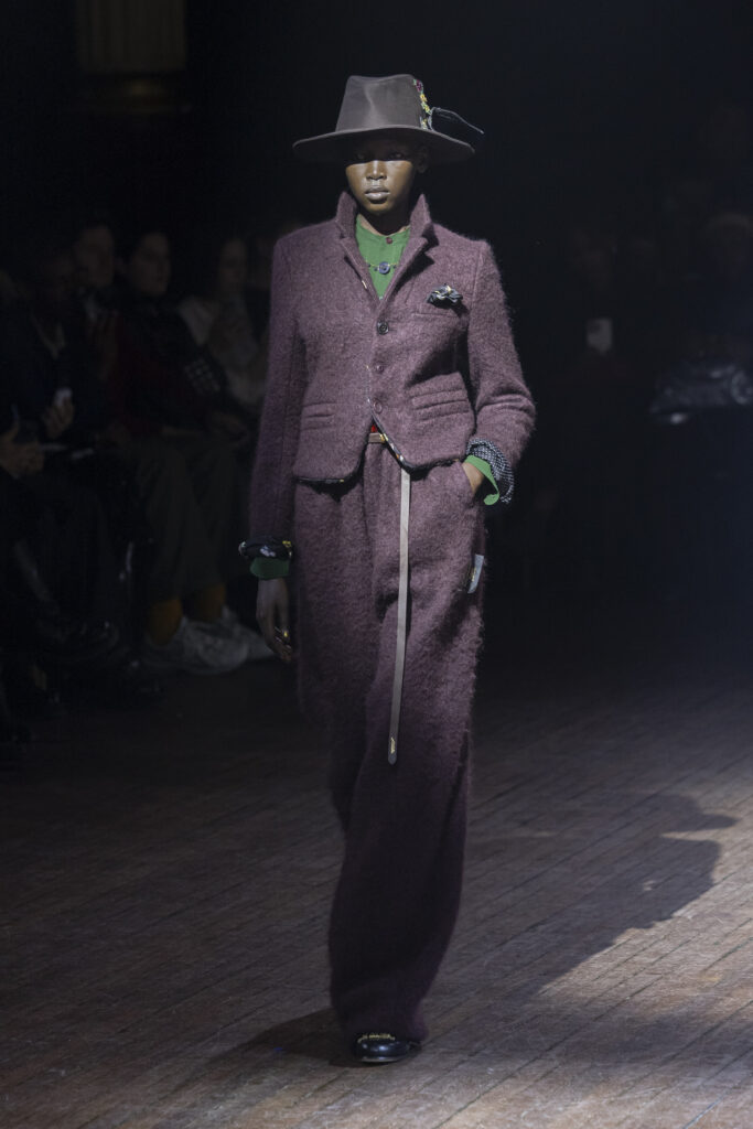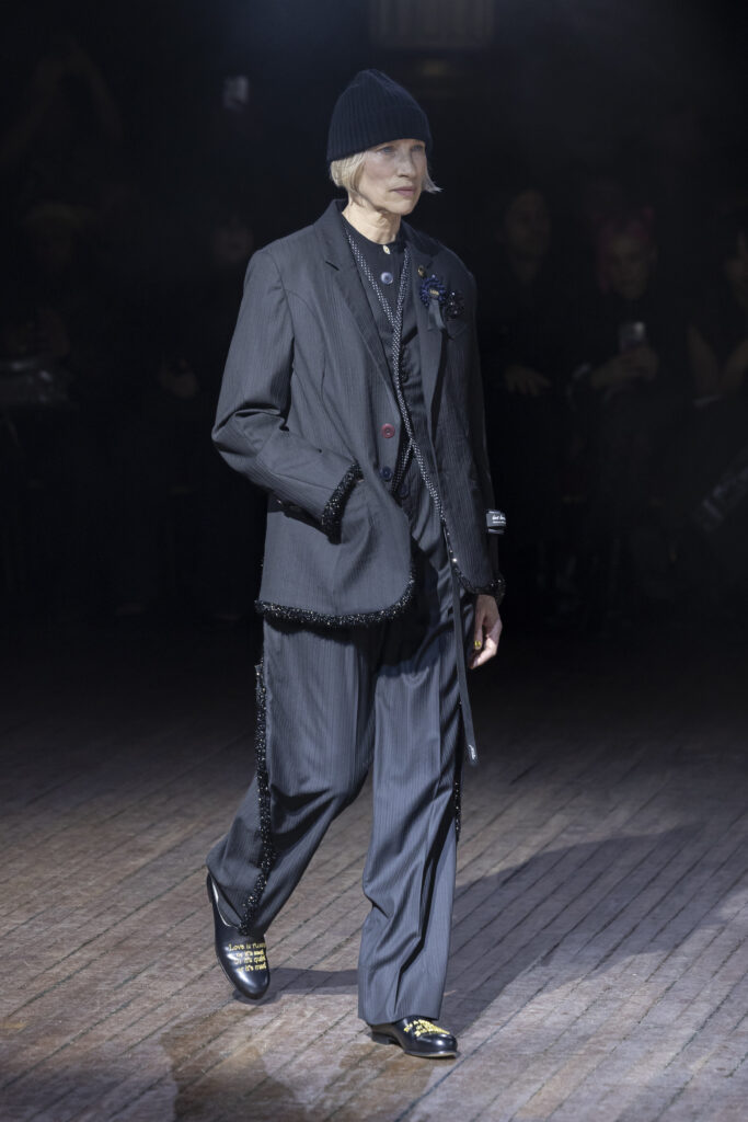 Les accessoires, loin d’être de simples ajouts, structuraient les tenues et leur donnaient une puissance dramatique. Les chapeaux UNDERCOVER x FACTORY900 et UNDERCOVER x KIJIMA TAKAYUKI apportaient une touche théâtrale, évoquant tantôt le cabaret berlinois, tantôt les silhouettes monastiques d’un film expressionniste.