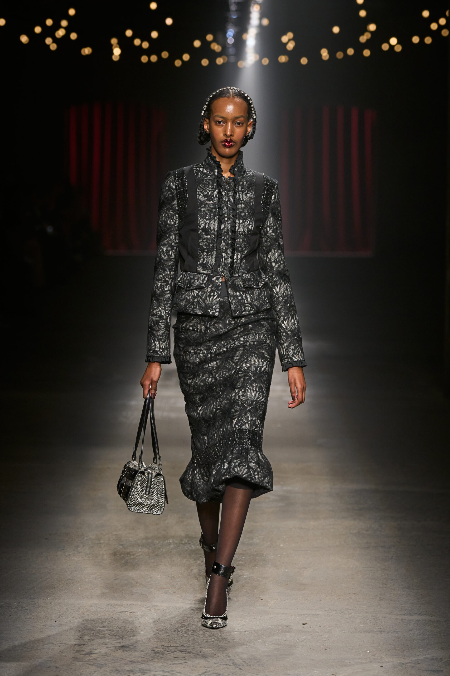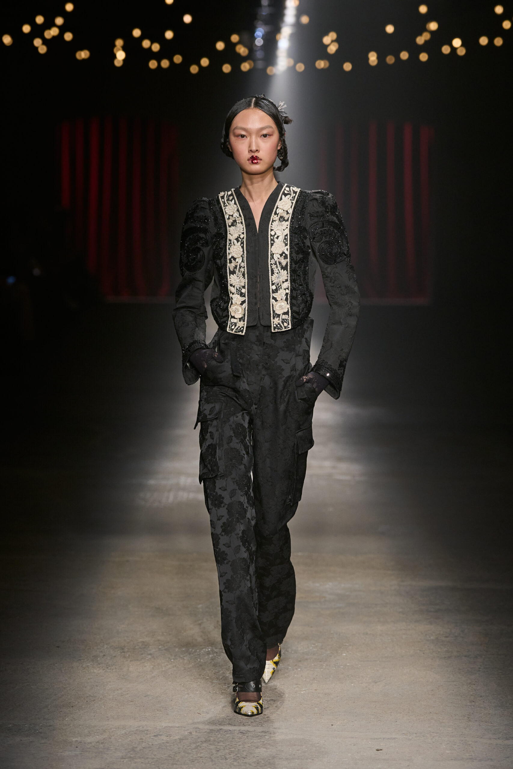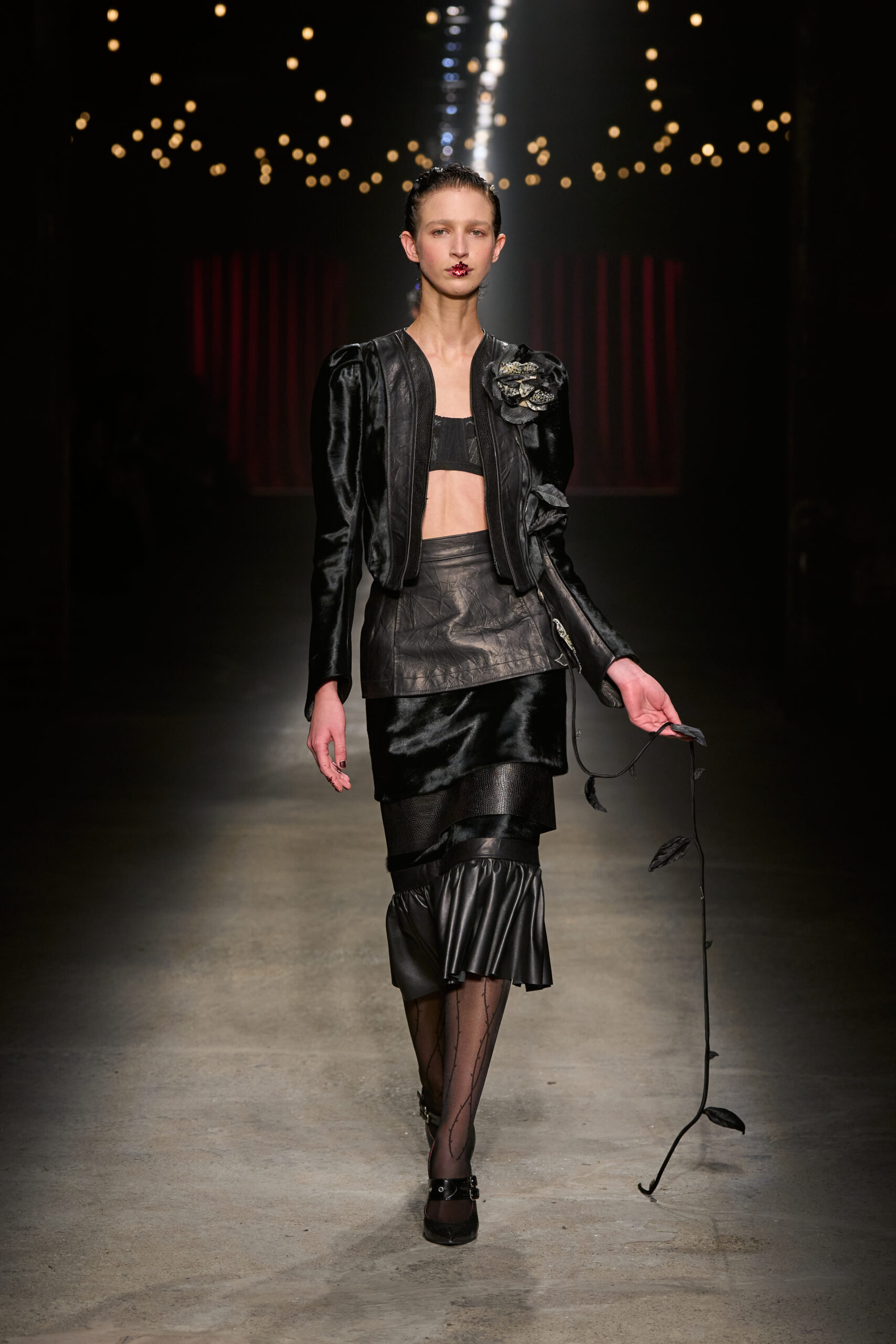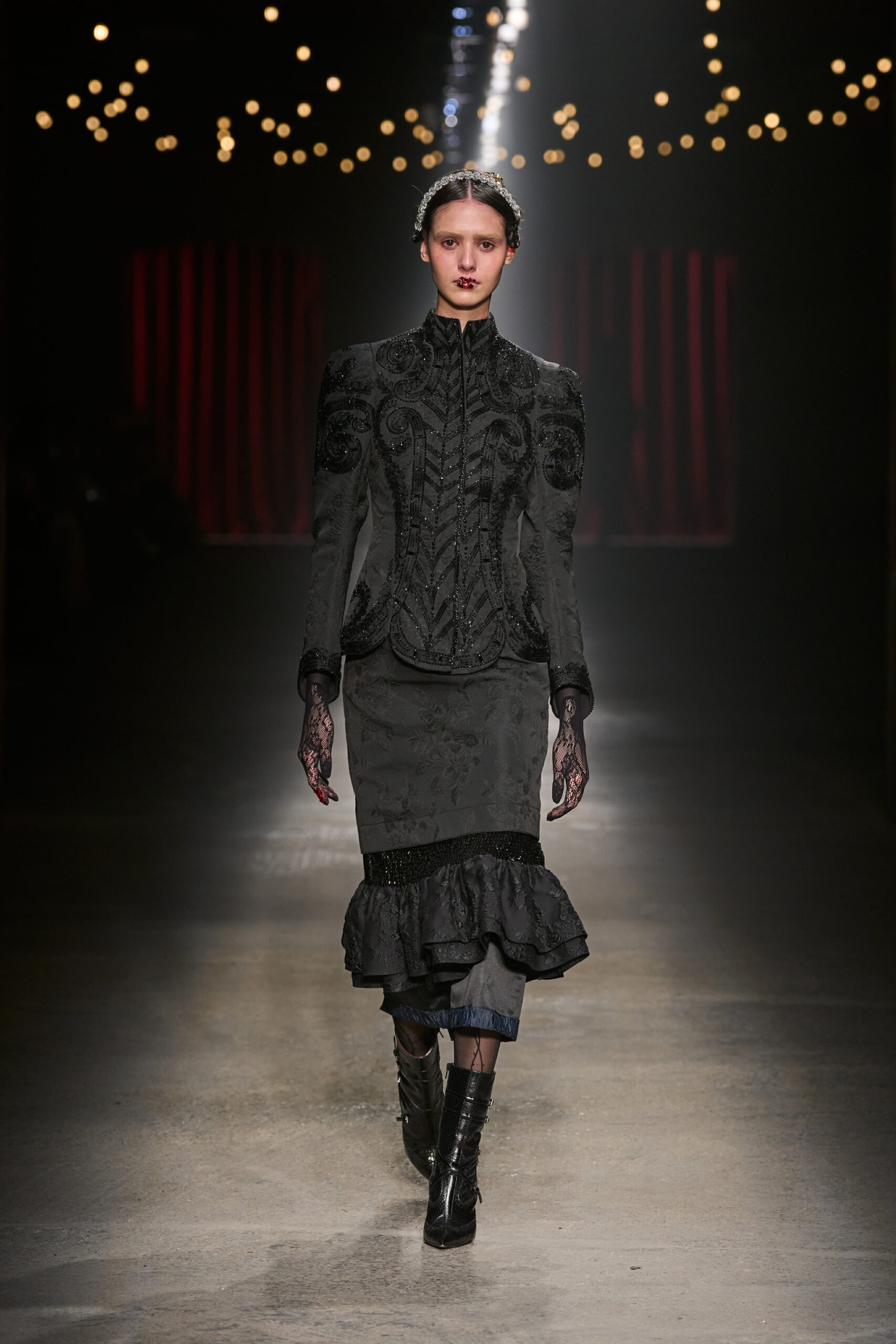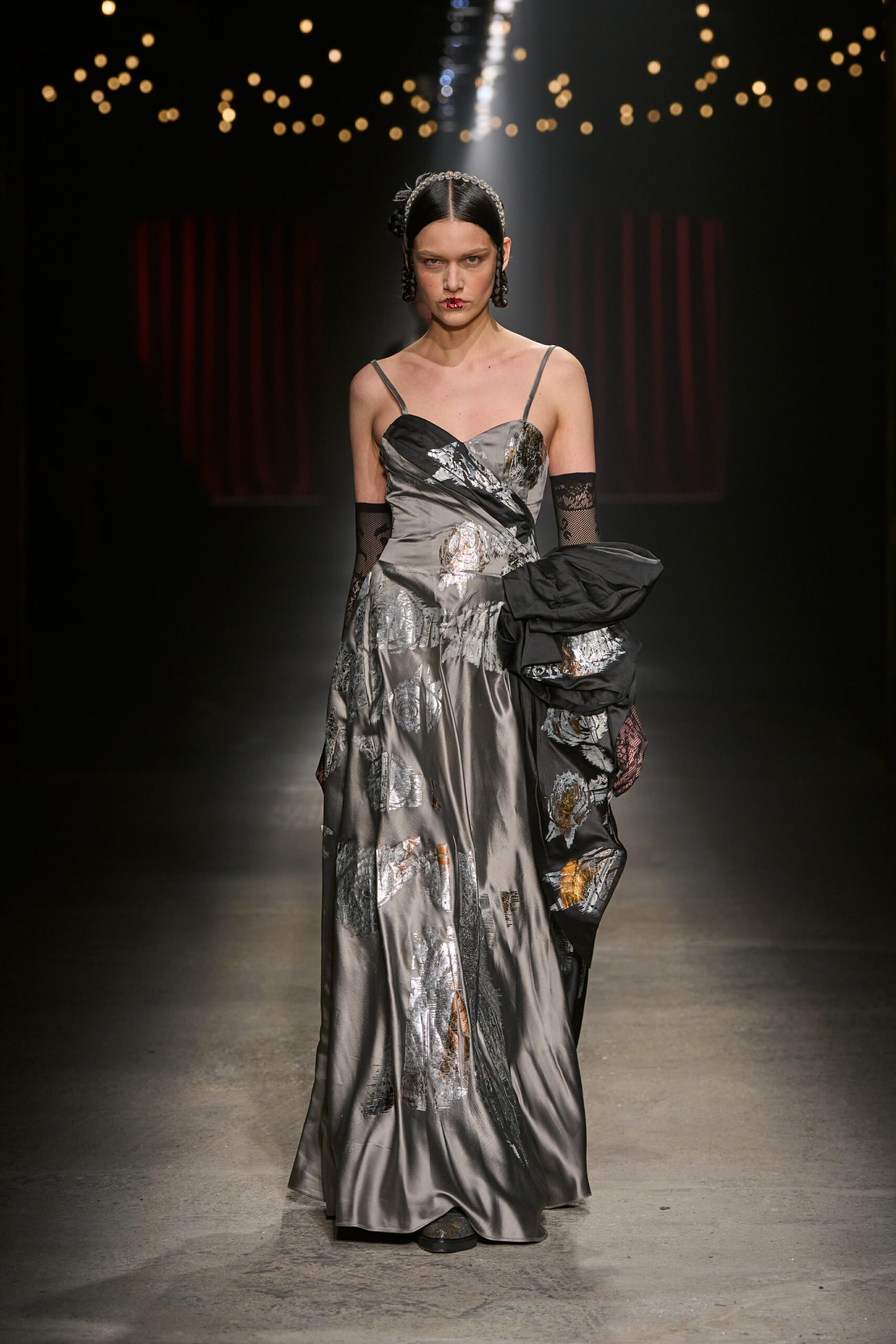La mise en scène, telle une représentation d’opéra, joue sur des contrastes forts. Les pièces tailleur en laine militaire arborent des coupes strictes, ponctuées de détails inattendus : dentelles vaporeuses, appliqués de perles, pans de cuir, incrustations de tulle. Les silhouettes se font tour à tour majestueuses et charnelles : d’un côté, des robes amples, pensées comme de véritables costumes de scène, où les volumes se superposent ; de l’autre, des coupes ajustées, près du corps, dégageant un sentiment d’audace et de modernité. On perçoit dans ces contrastes l’hommage à une époque où la passion, démesurée, trouvait écho dans l’exubérance des décors et la noblesse des étoffes.