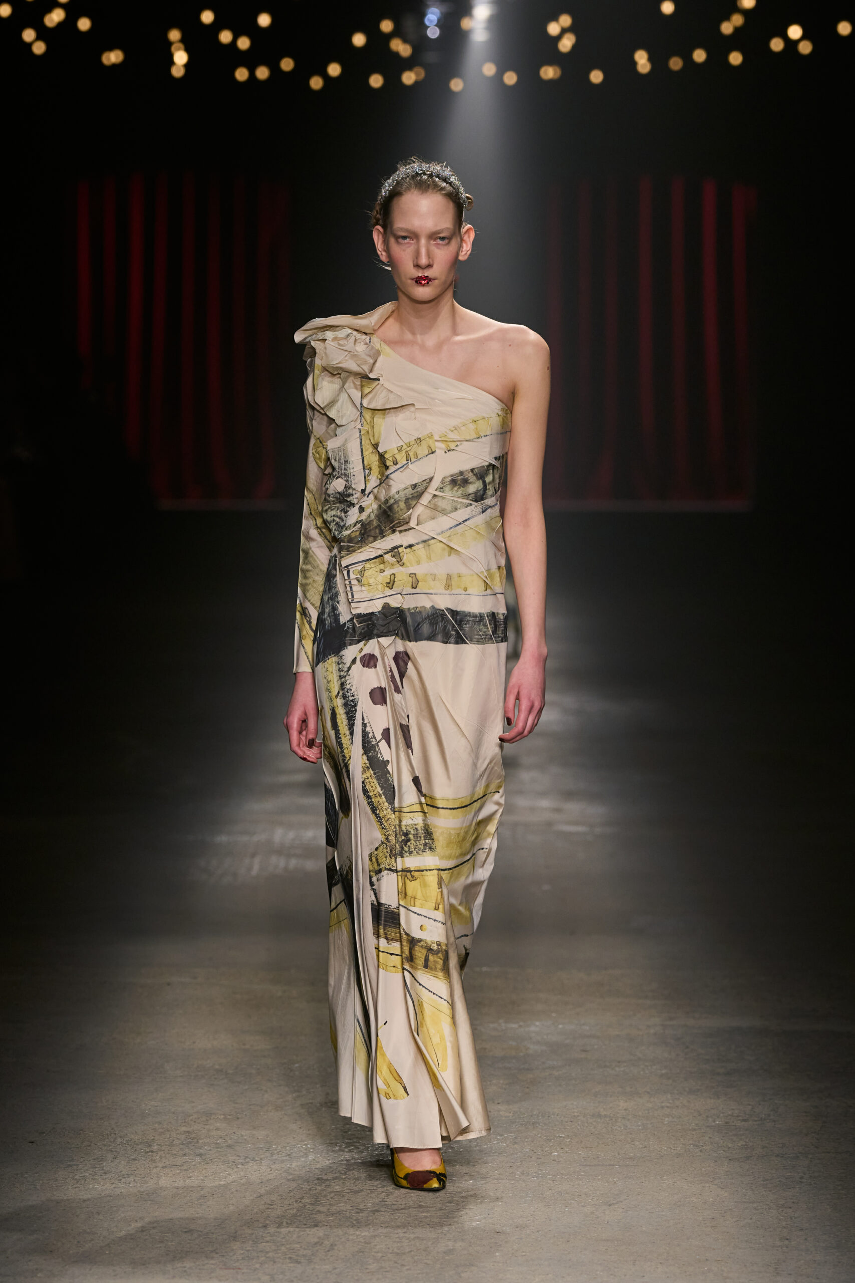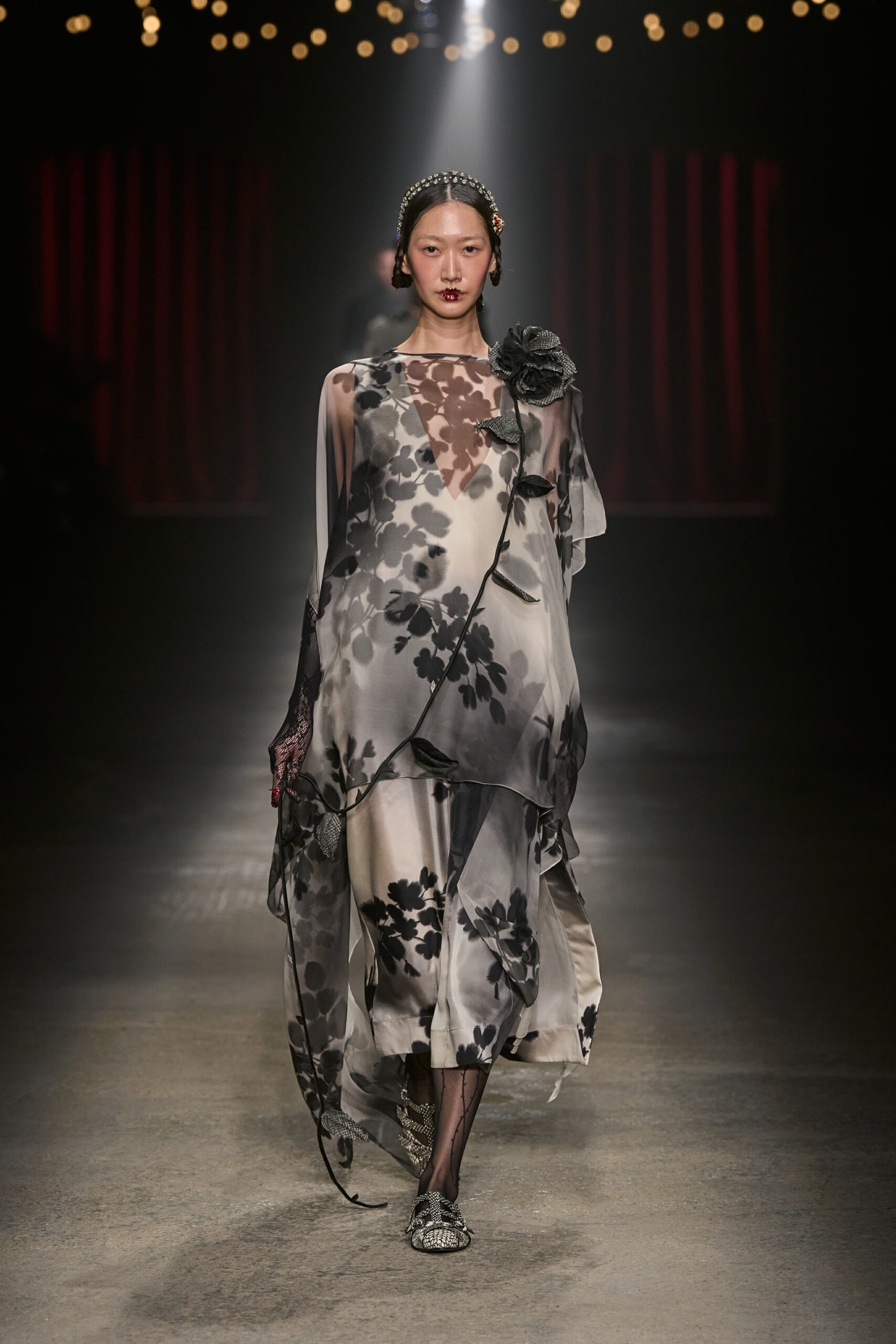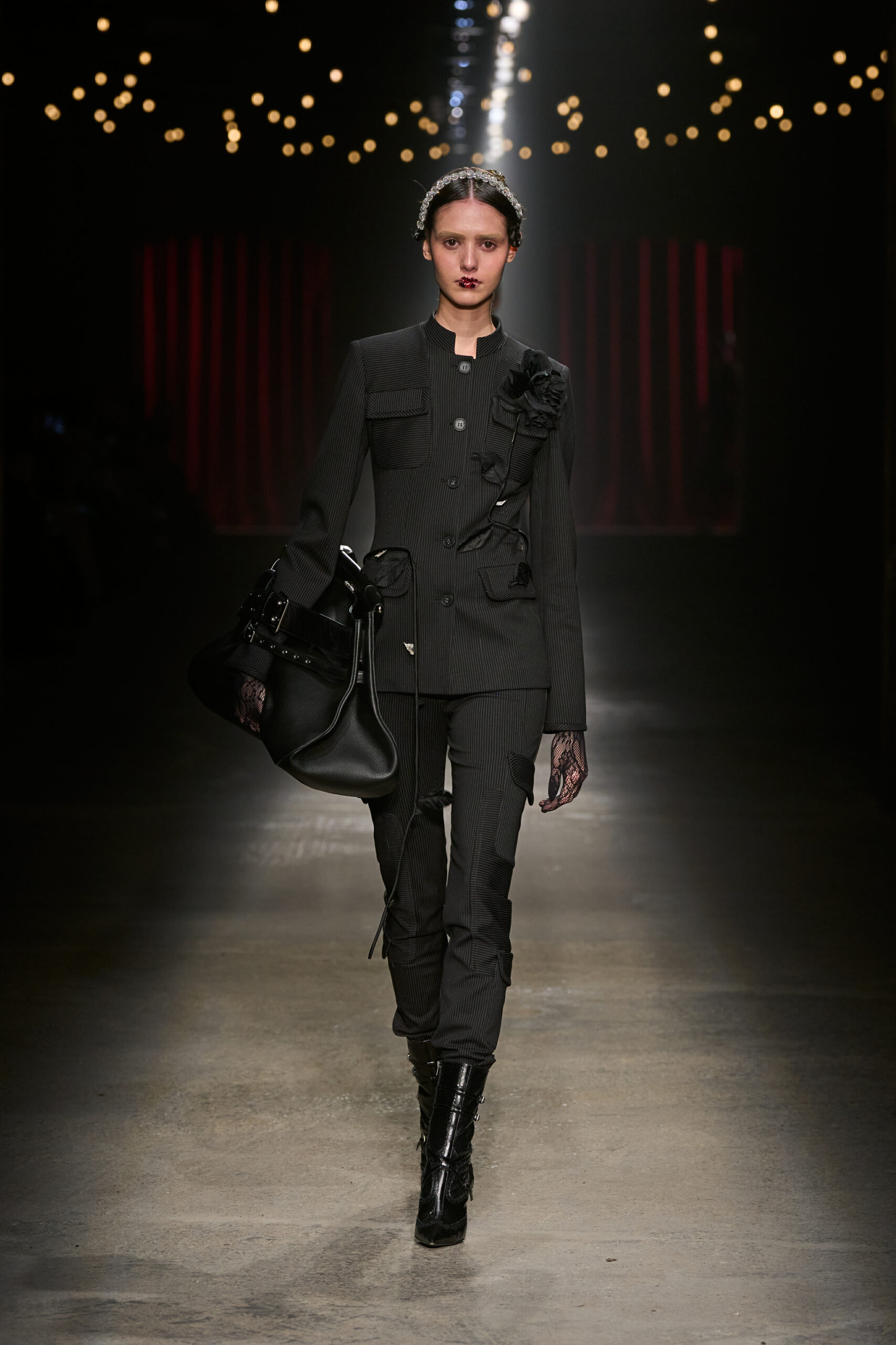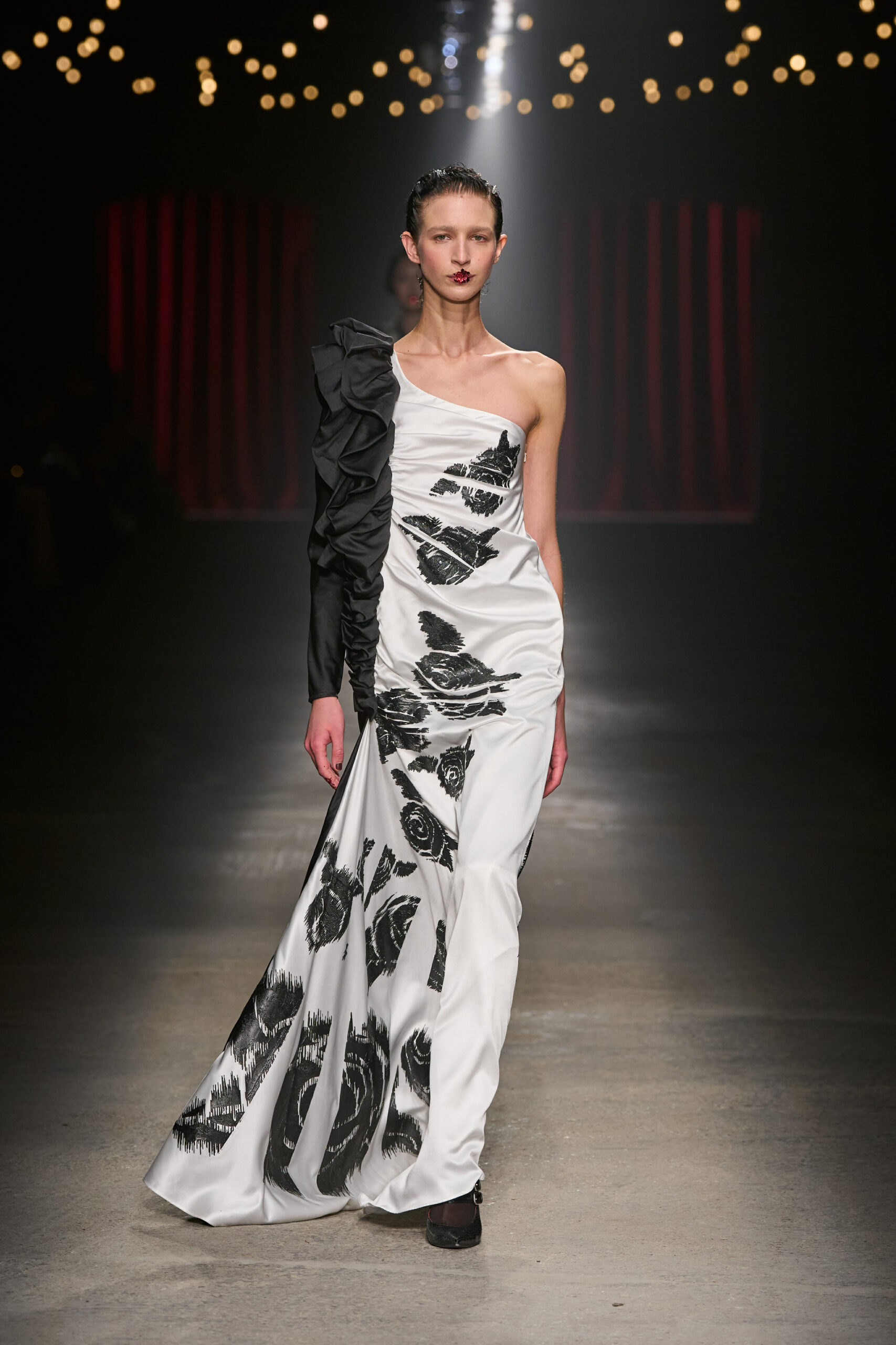 La mise en scène, telle une représentation d’opéra, joue sur des contrastes forts. Les pièces tailleur en laine militaire arborent des coupes strictes, ponctuées de détails inattendus : dentelles vaporeuses, appliqués de perles, pans de cuir, incrustations de tulle. Les silhouettes se font tour à tour majestueuses et charnelles : d’un côté, des robes amples, pensées comme de véritables costumes de scène, où les volumes se superposent ; de l’autre, des coupes ajustées, près du corps, dégageant un sentiment d’audace et de modernité. On perçoit dans ces contrastes l’hommage à une époque où la passion, démesurée, trouvait écho dans l’exubérance des décors et la noblesse des étoffes.