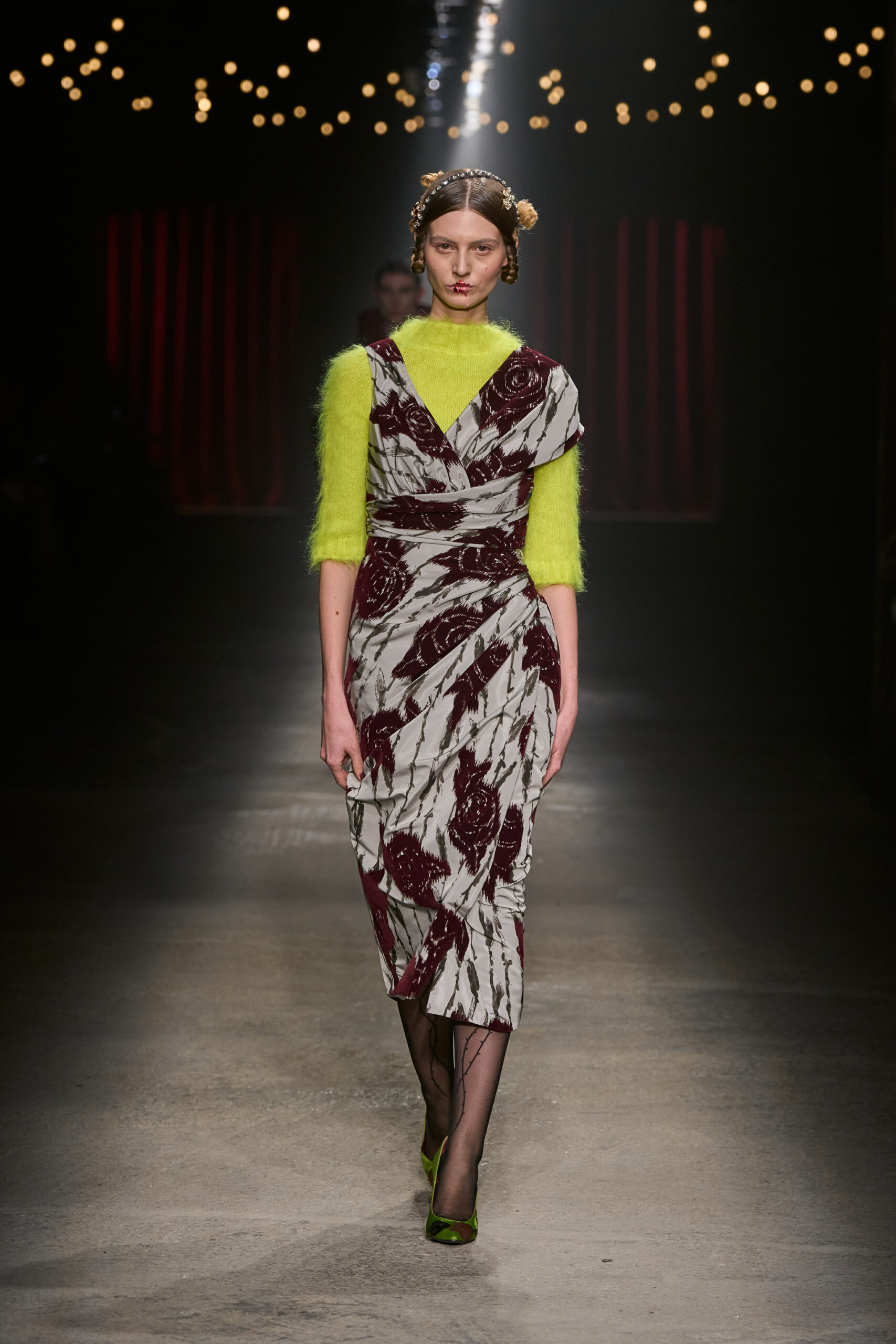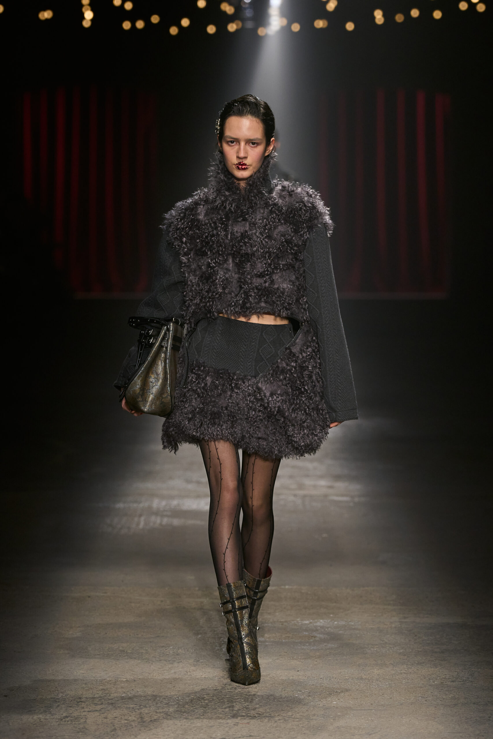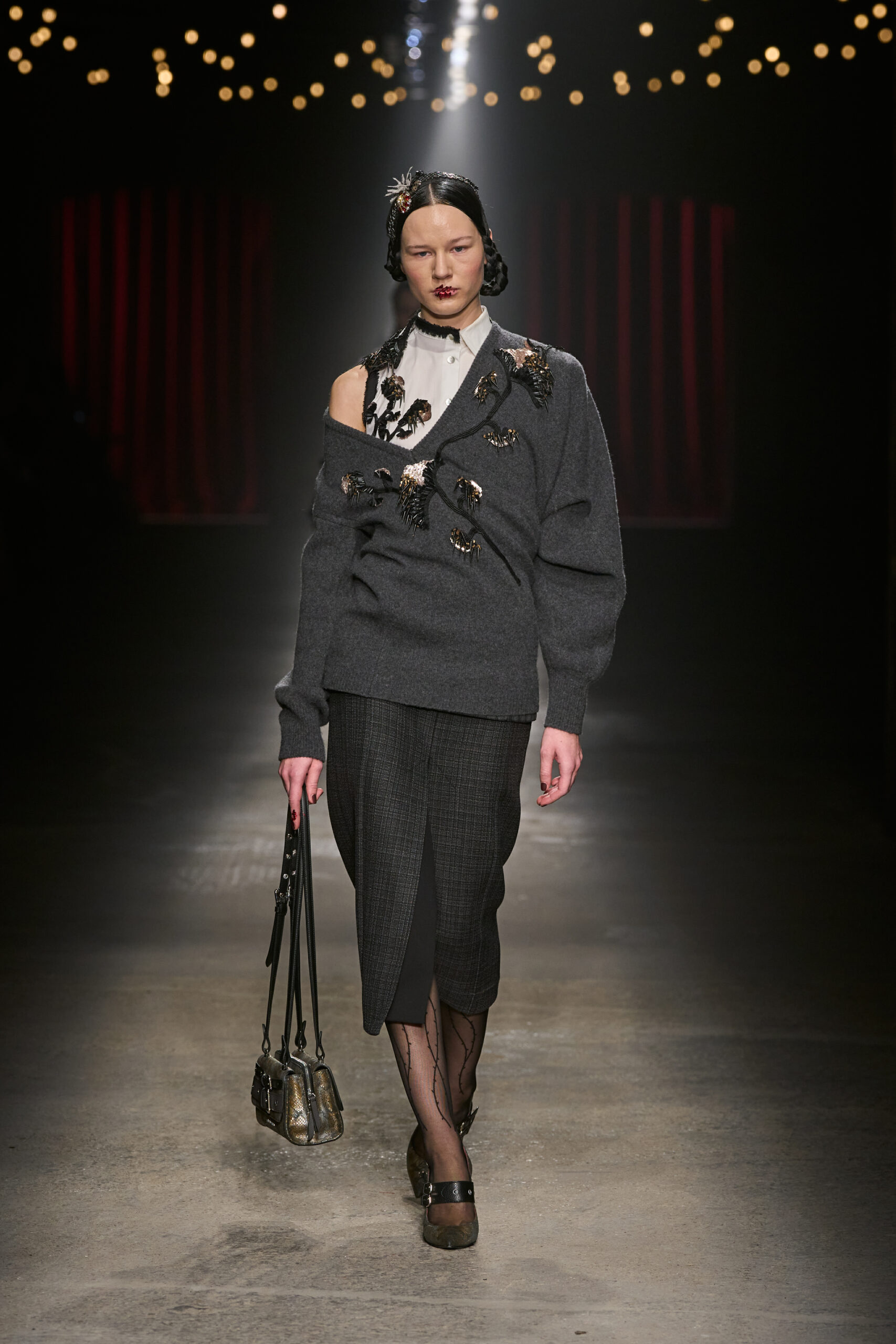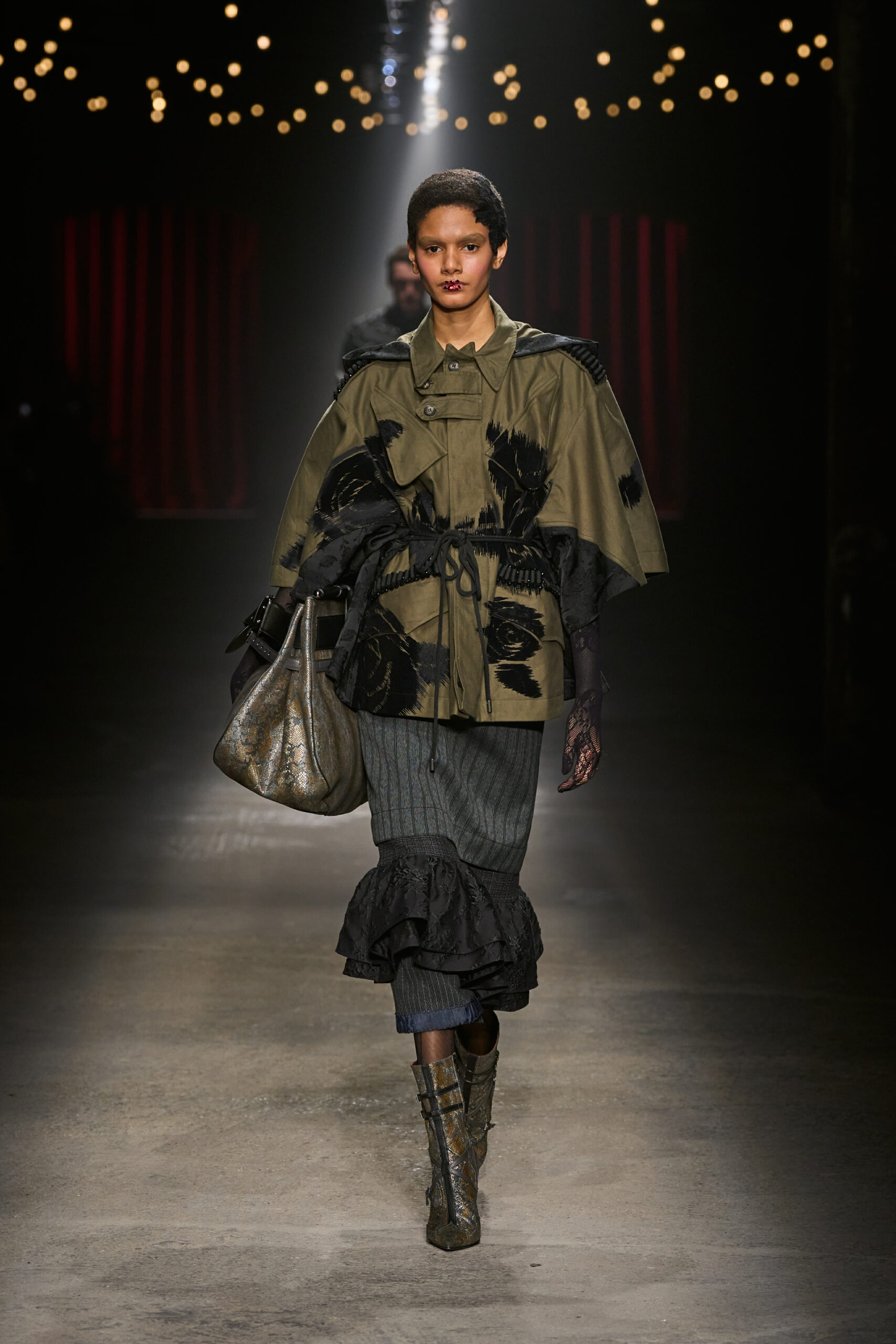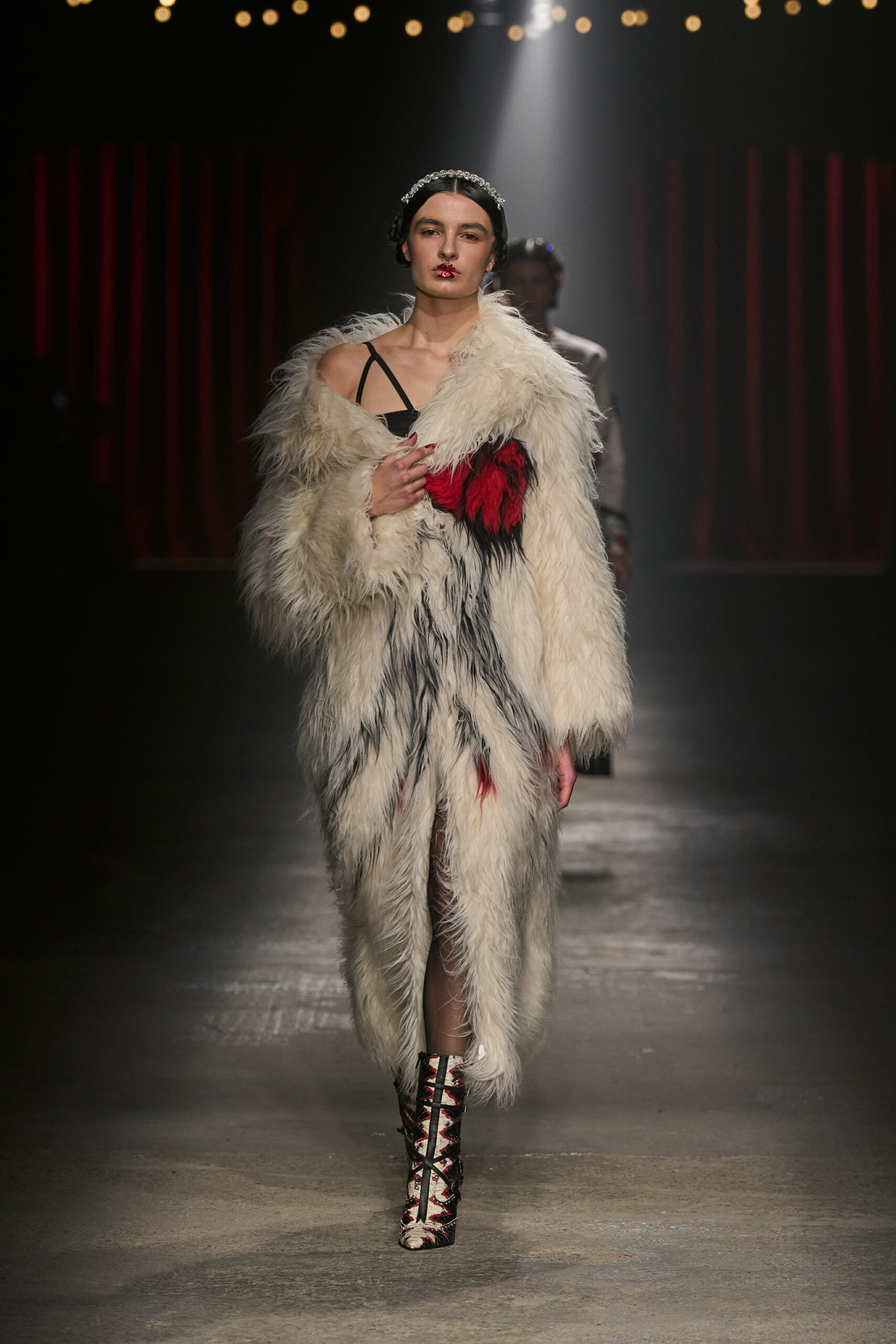 La mise en scène, telle une représentation d’opéra, joue sur des contrastes forts. Les pièces tailleur en laine militaire arborent des coupes strictes, ponctuées de détails inattendus : dentelles vaporeuses, appliqués de perles, pans de cuir, incrustations de tulle. Les silhouettes se font tour à tour majestueuses et charnelles : d’un côté, des robes amples, pensées comme de véritables costumes de scène, où les volumes se superposent ; de l’autre, des coupes ajustées, près du corps, dégageant un sentiment d’audace et de modernité. On perçoit dans ces contrastes l’hommage à une époque où la passion, démesurée, trouvait écho dans l’exubérance des décors et la noblesse des étoffes.