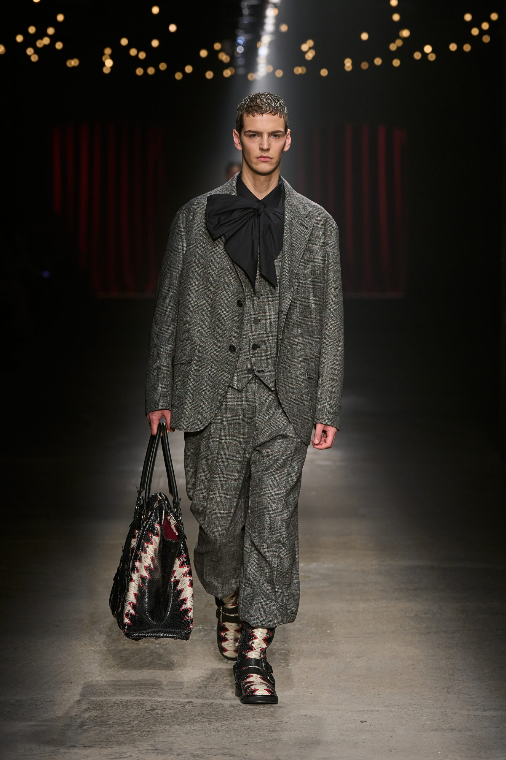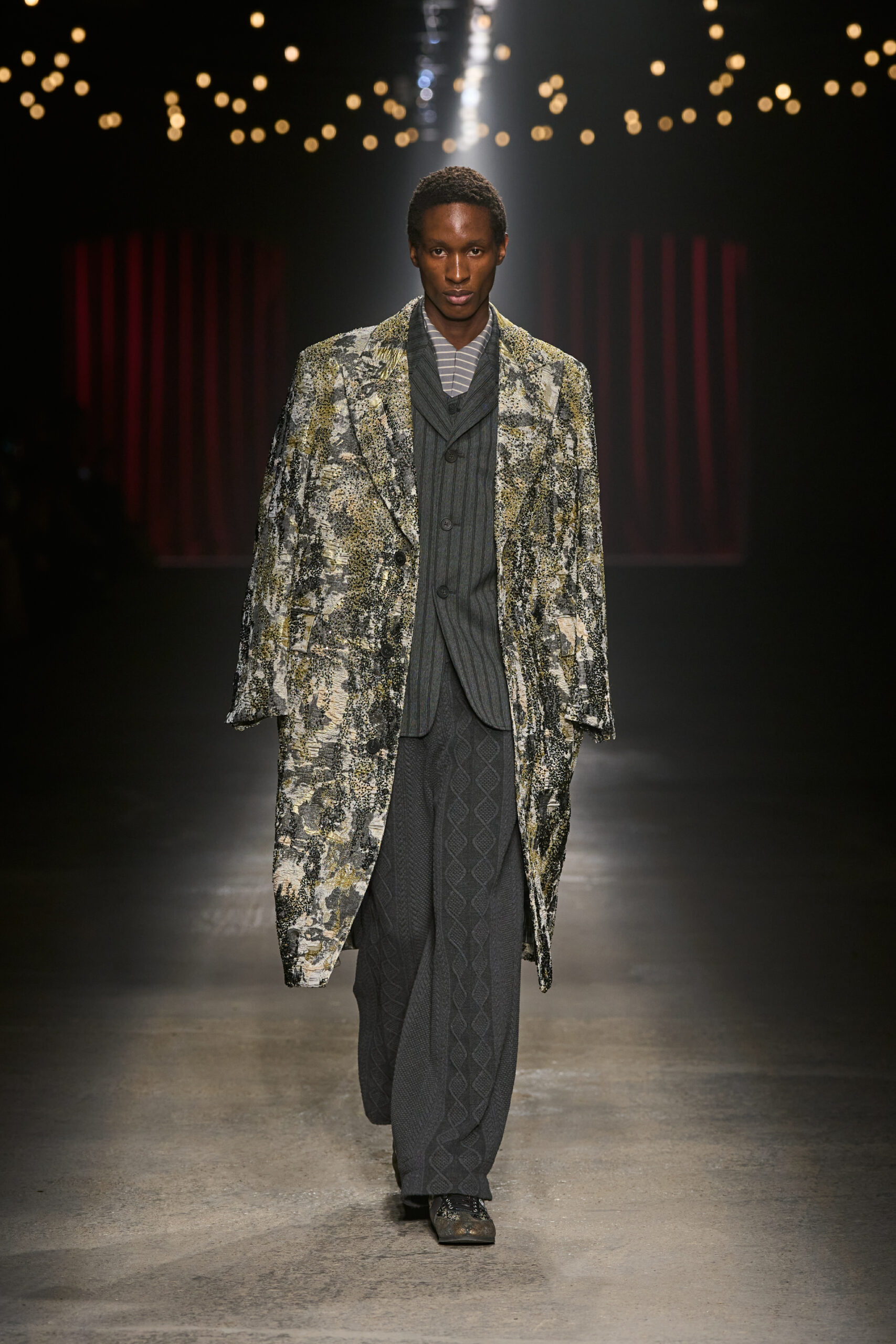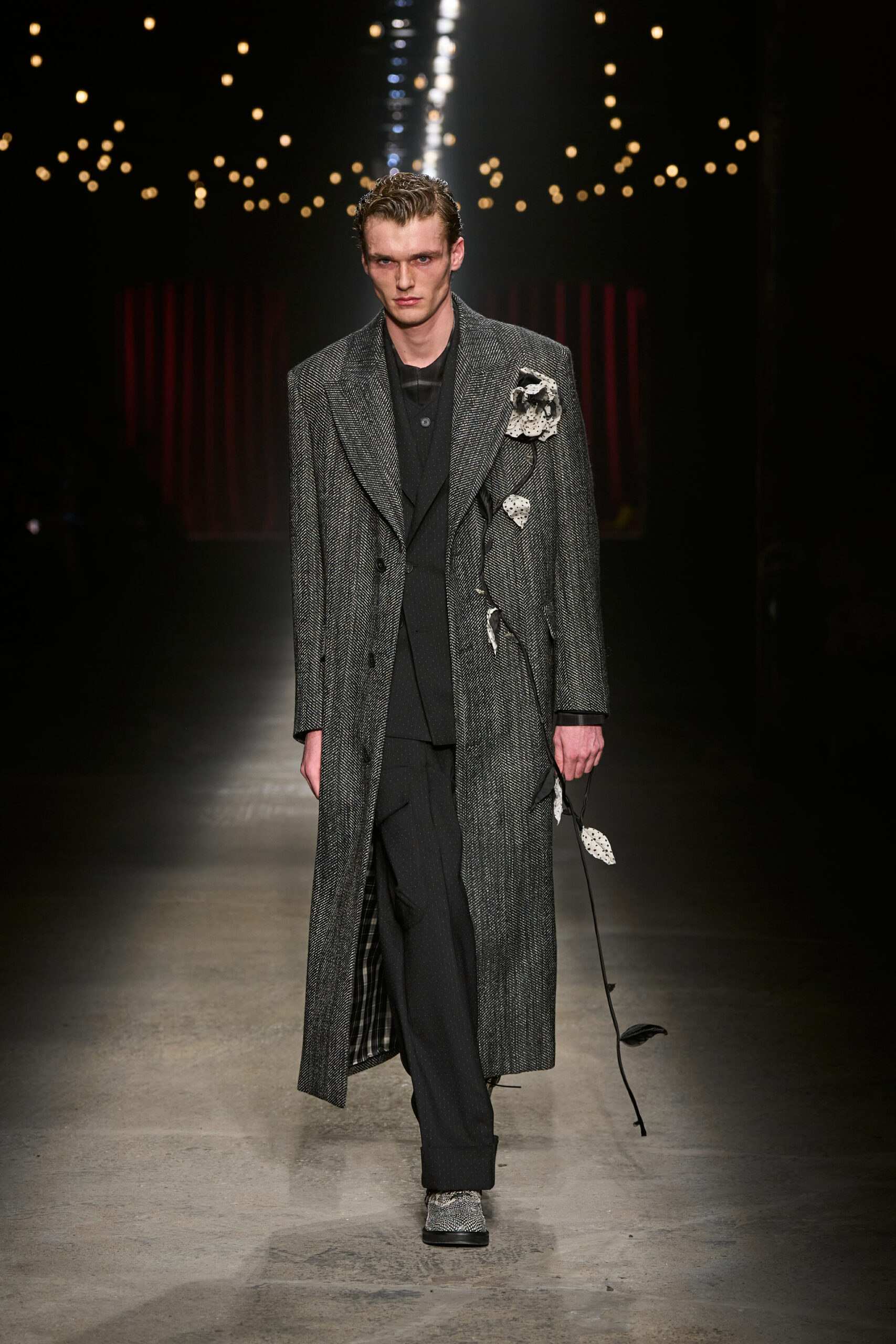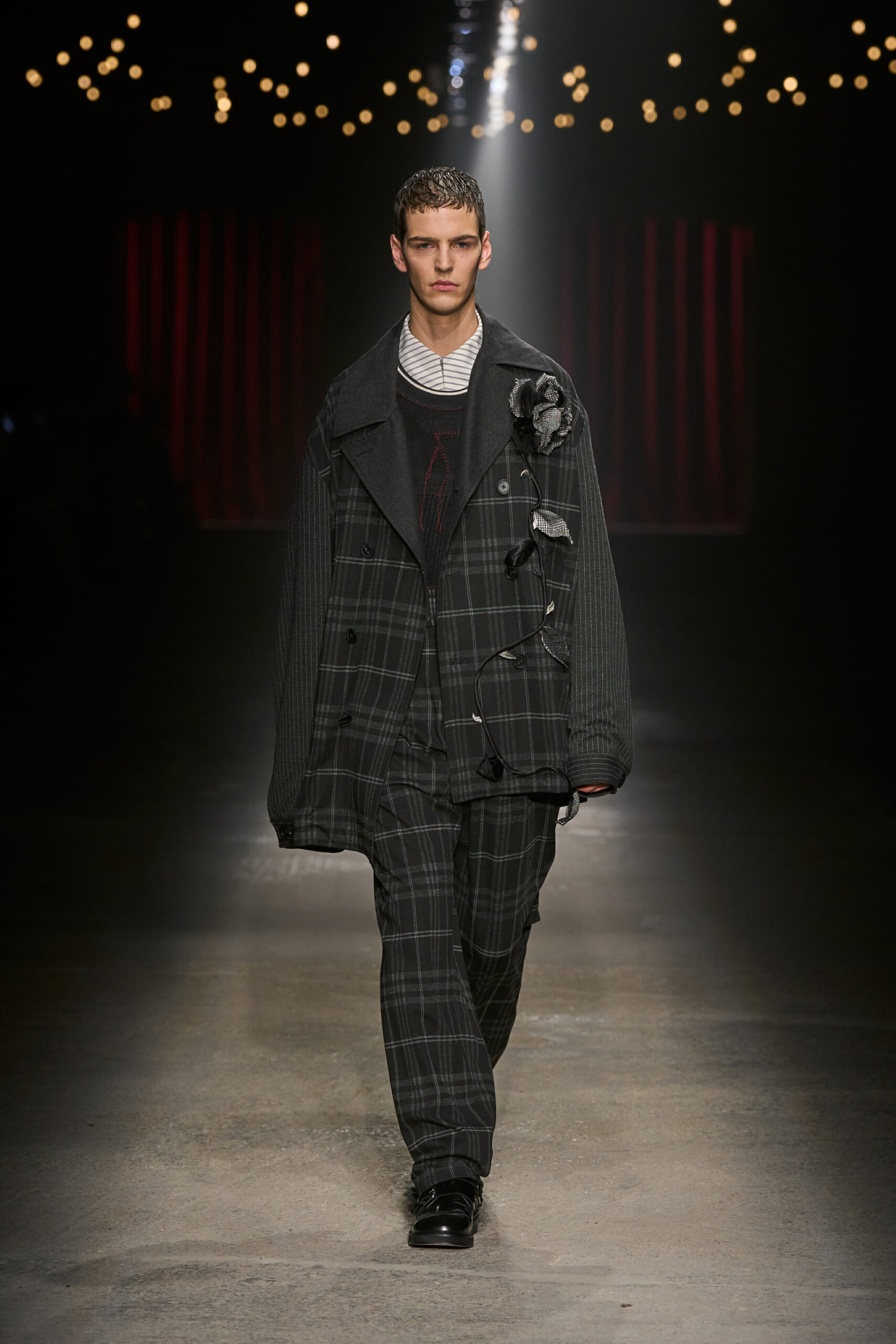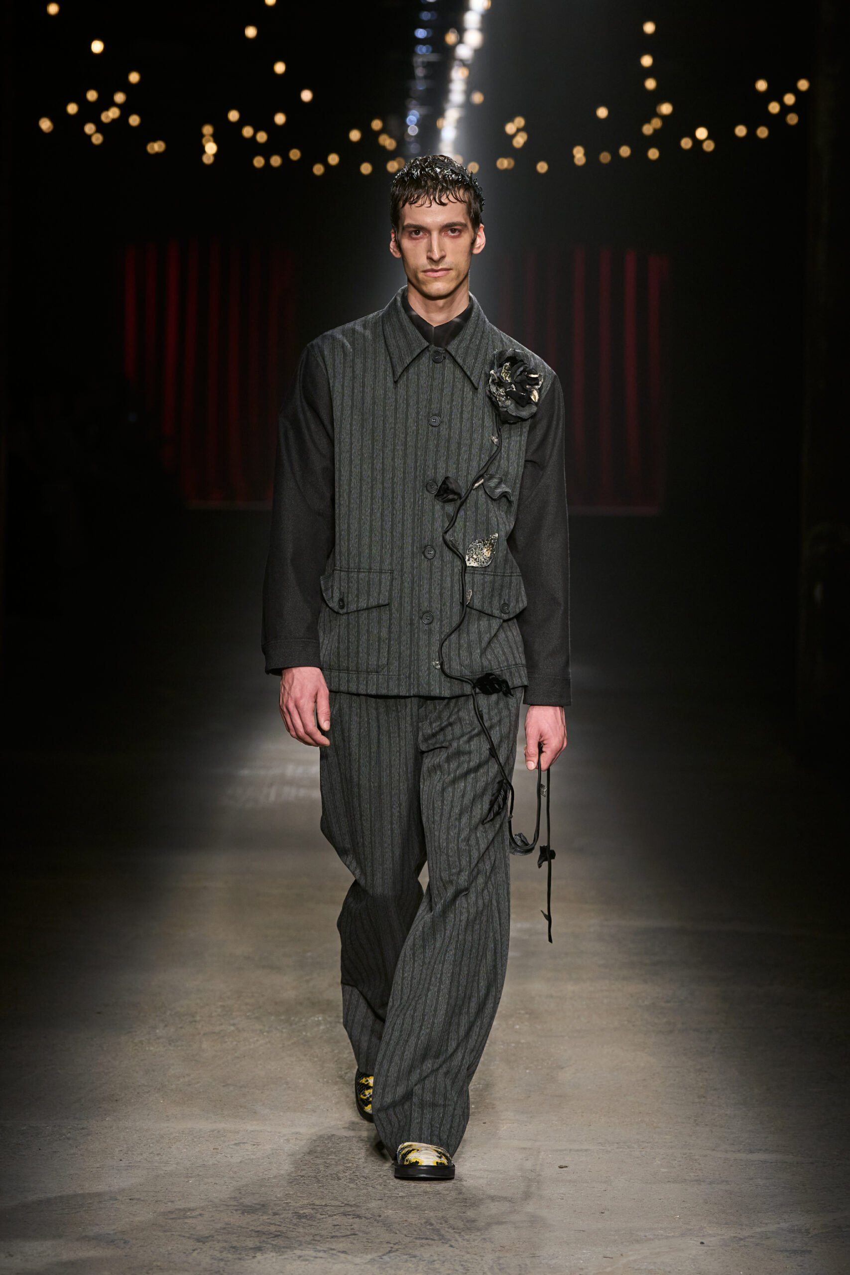 Comme dans un opéra où chaque détail sert la dramaturgie, Antonio Marras soigne les finitions. Des rubans cousus à la main, des broderies géométriques, des patchworks de tissus chinés et réassemblés : chaque geste rappelle la dimension artisanale et la quête d’authenticité au cœur de la maison. Les silhouettes masculines, tantôt minimalistes, tantôt théâtrales, mêlent kilts à carreaux et manteaux structurés, arborant un col rehaussé de broderies. Les accessoires, enfin, prolongent la narration : bottines ajourées, ceintures ornées de motifs végétaux et sacs brodés renouvellent le vocabulaire stylistique de la marque.