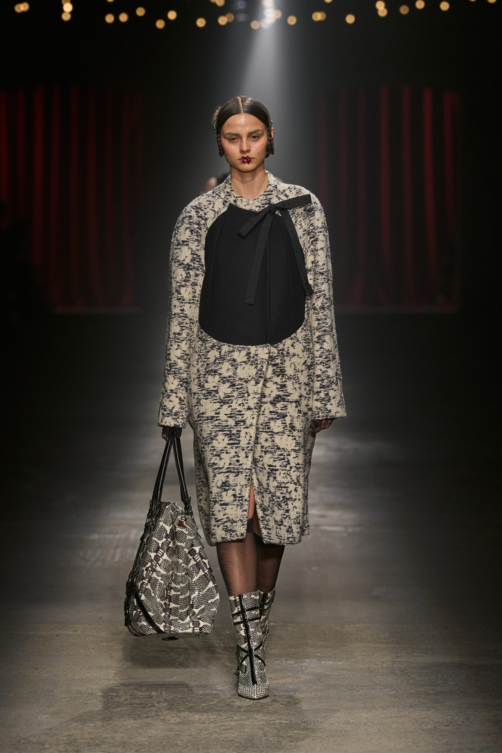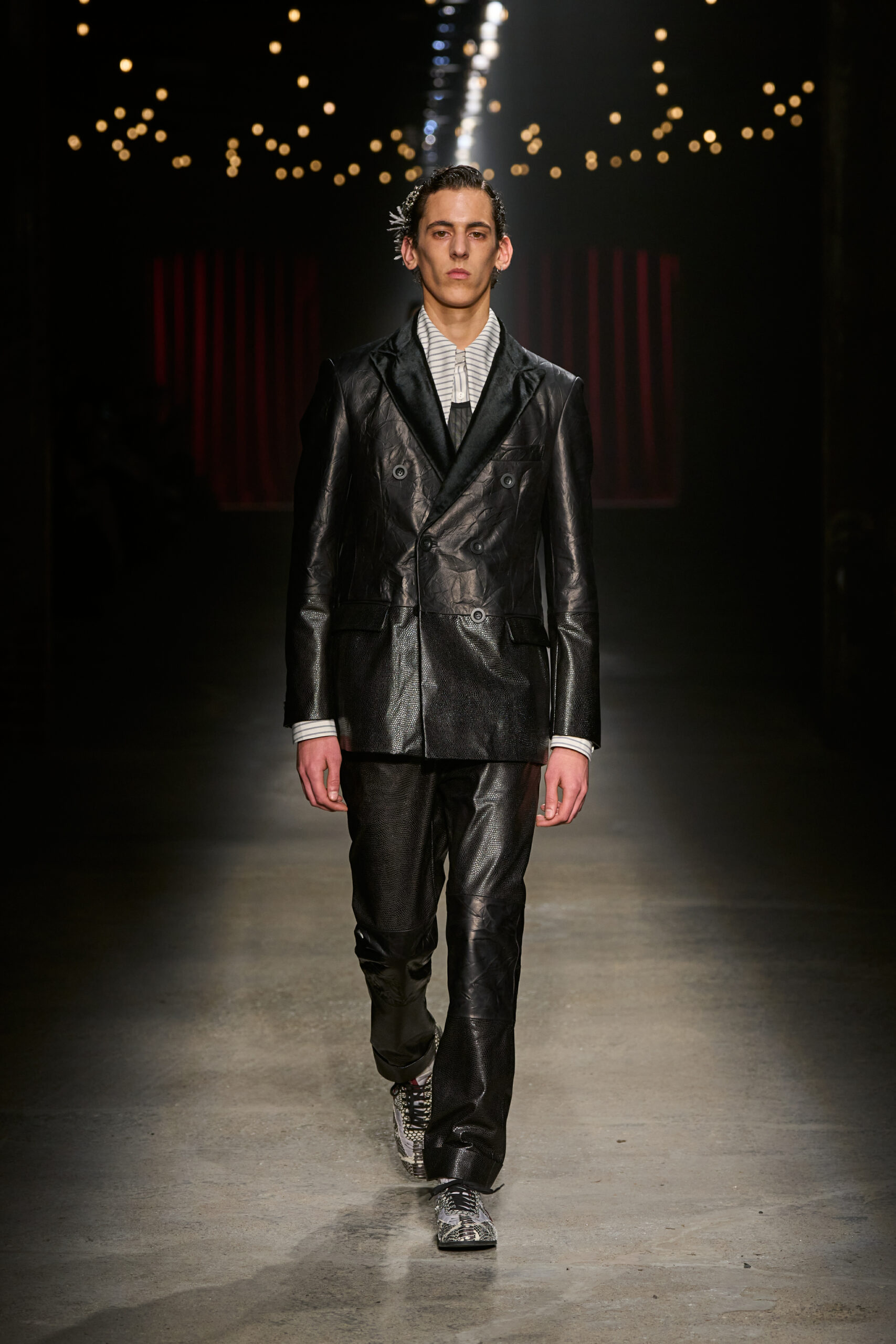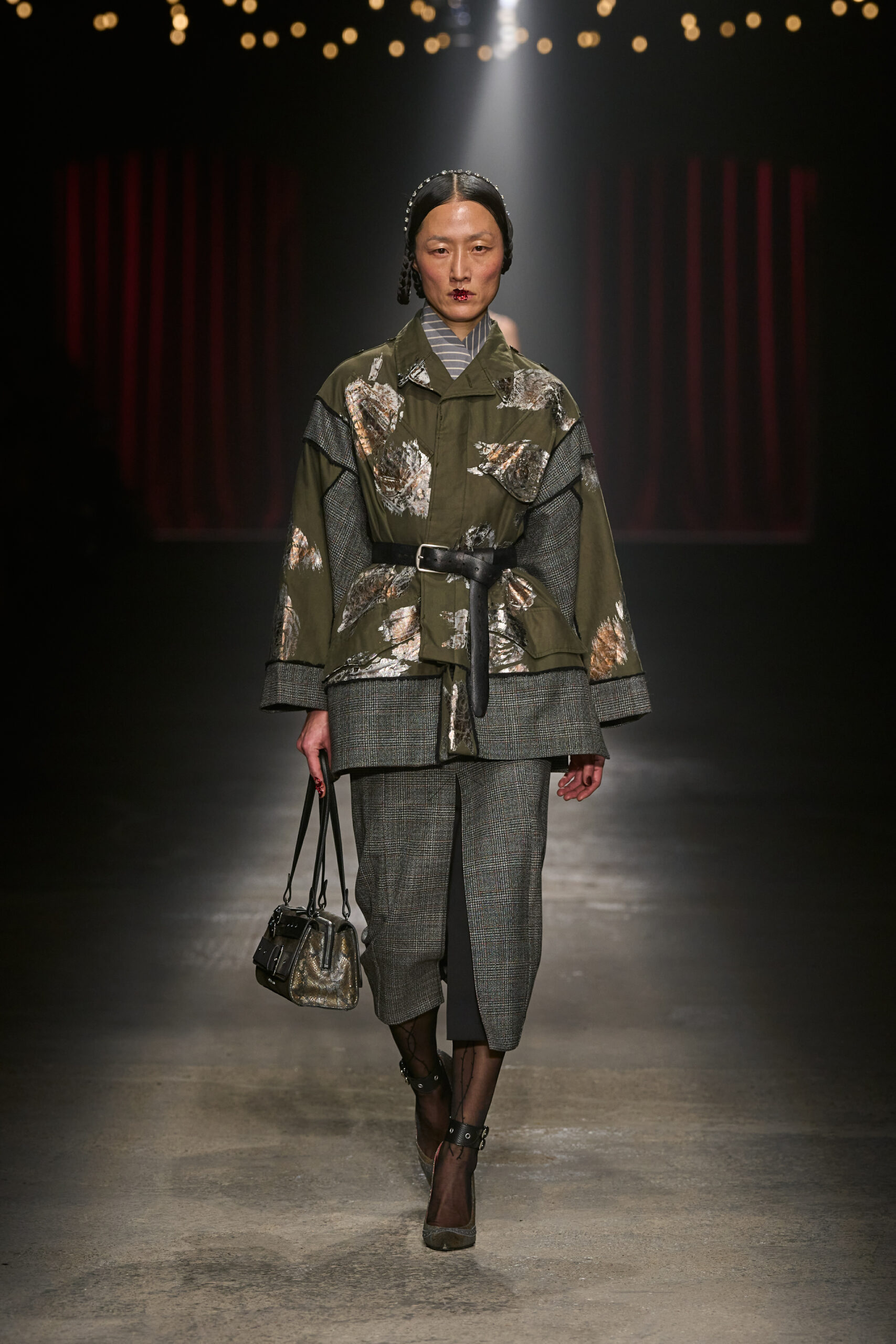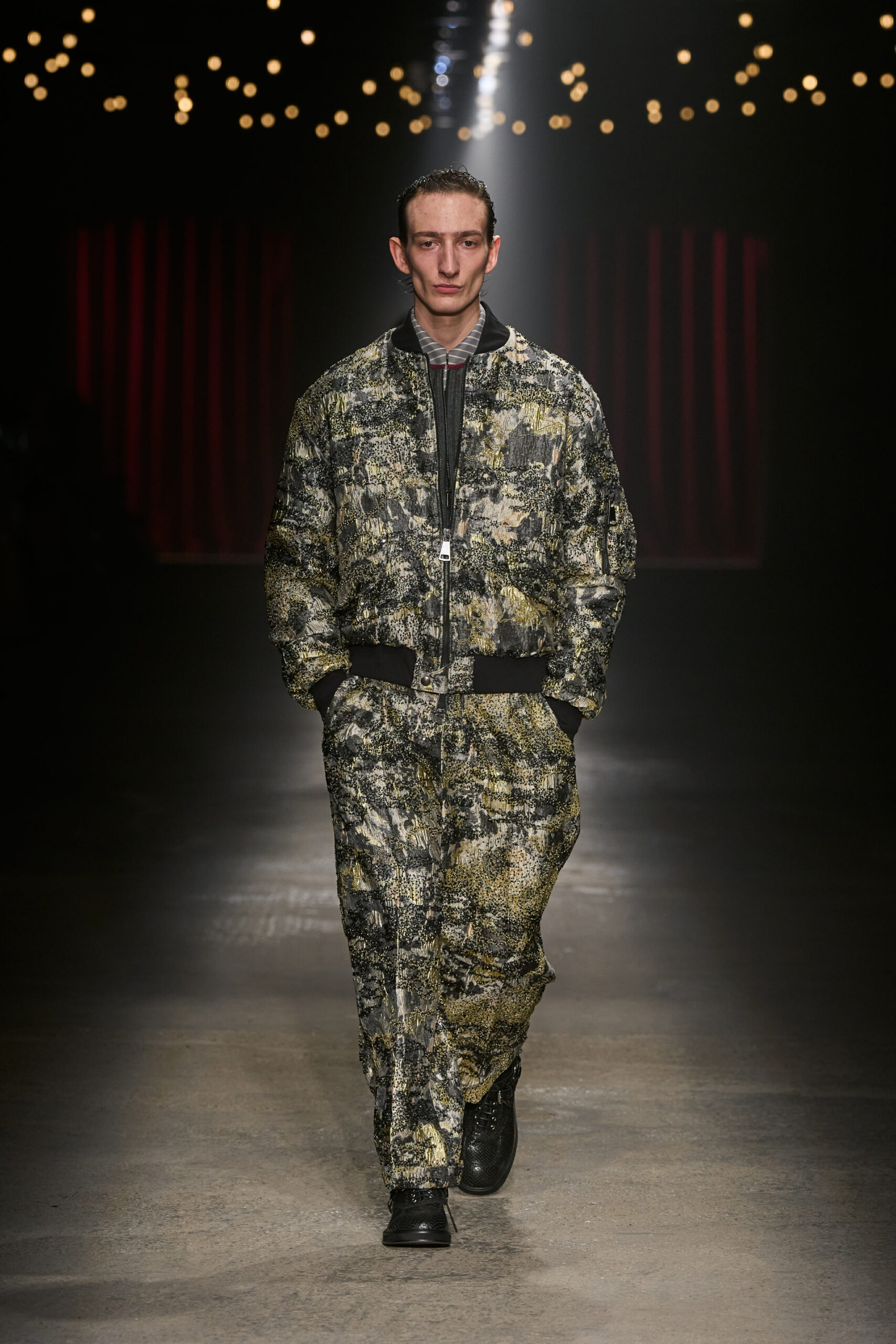 Comme dans un opéra où chaque détail sert la dramaturgie, Antonio Marras soigne les finitions. Des rubans cousus à la main, des broderies géométriques, des patchworks de tissus chinés et réassemblés : chaque geste rappelle la dimension artisanale et la quête d’authenticité au cœur de la maison. Les silhouettes masculines, tantôt minimalistes, tantôt théâtrales, mêlent kilts à carreaux et manteaux structurés, arborant un col rehaussé de broderies. Les accessoires, enfin, prolongent la narration : bottines ajourées, ceintures ornées de motifs végétaux et sacs brodés renouvellent le vocabulaire stylistique de la marque.