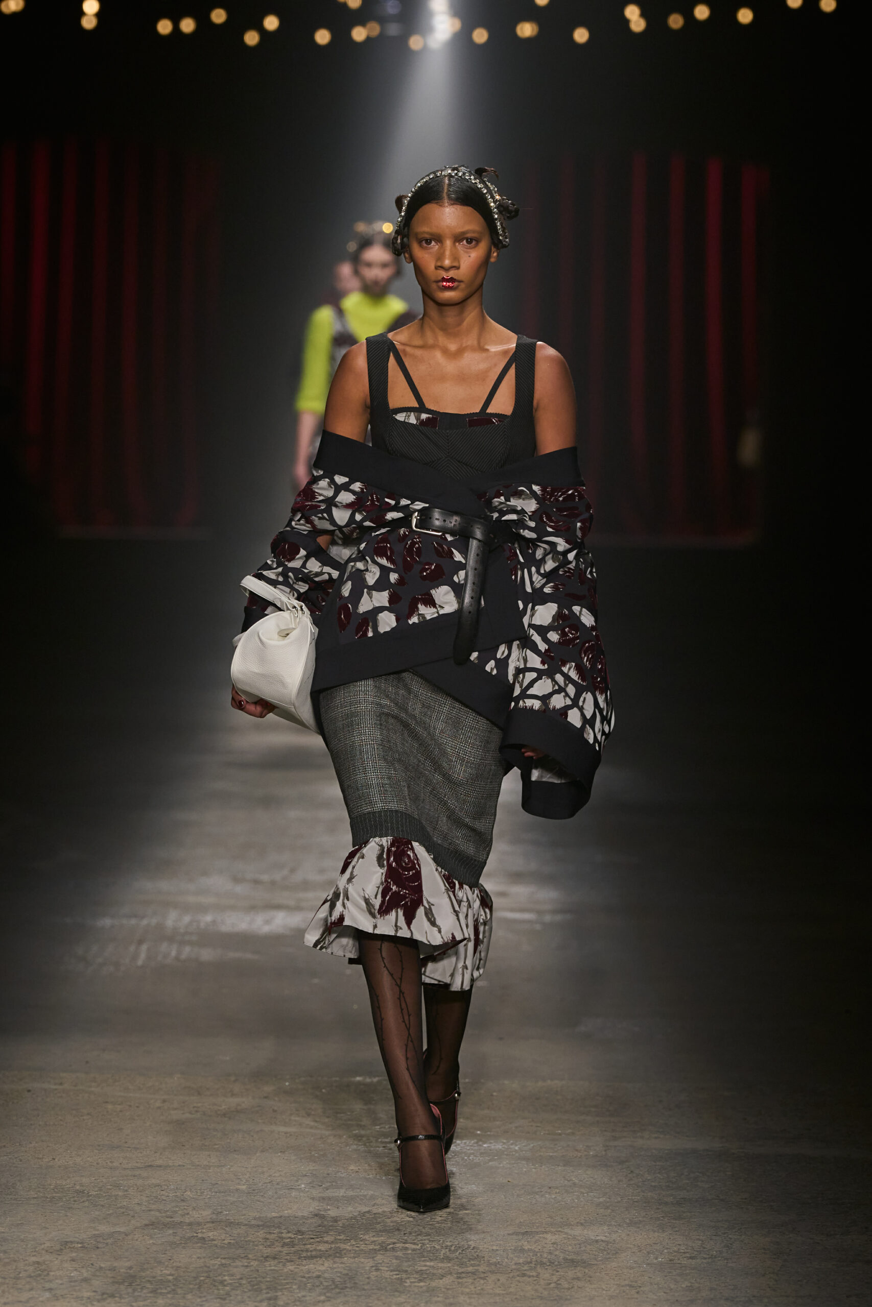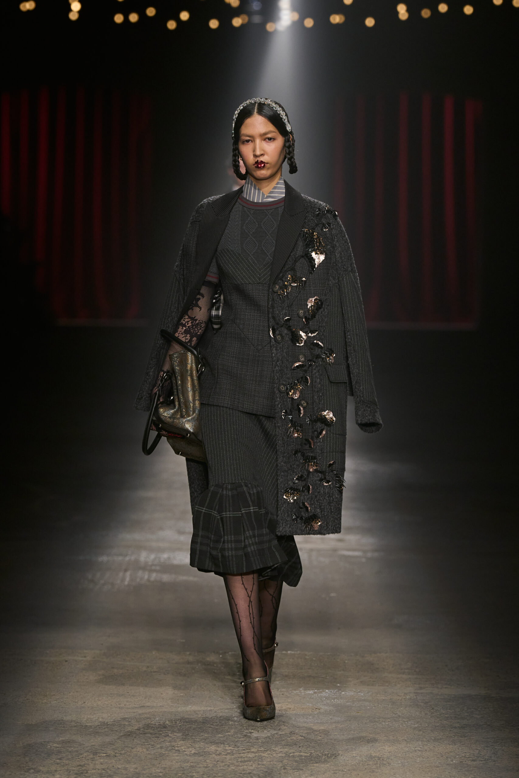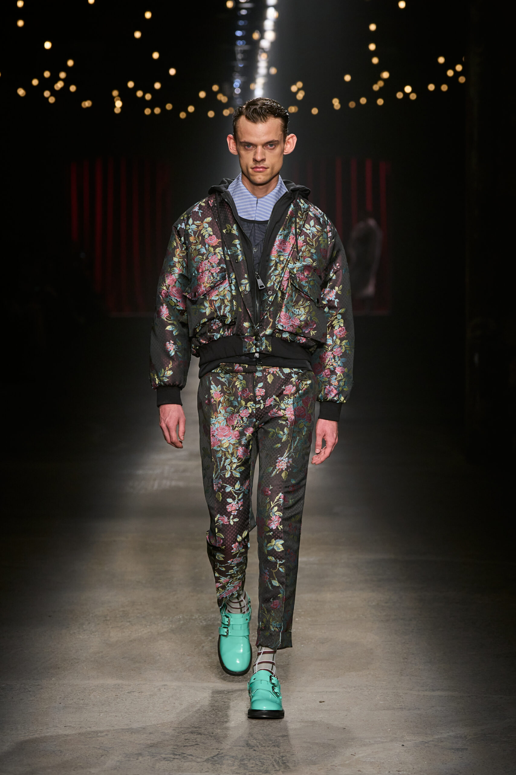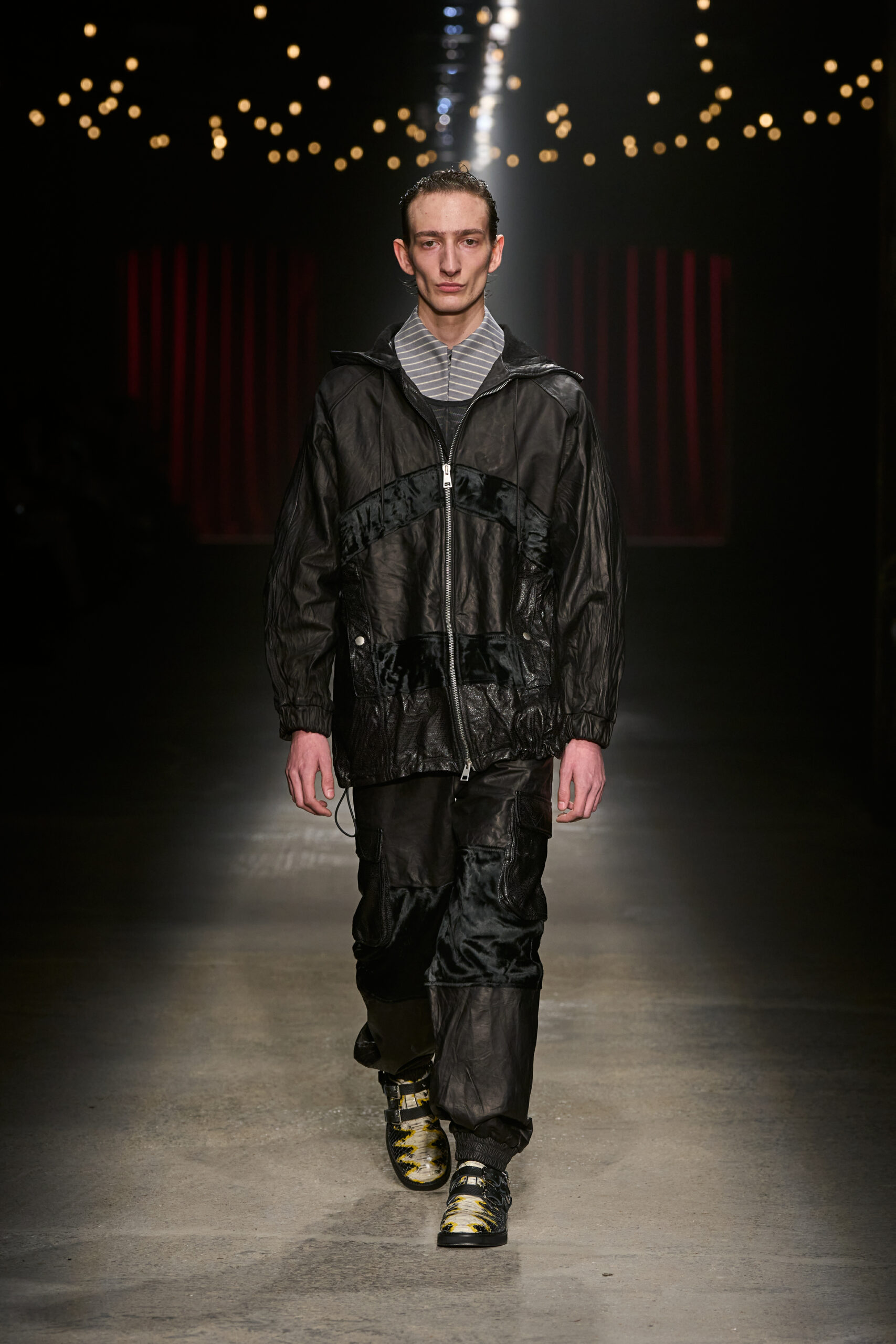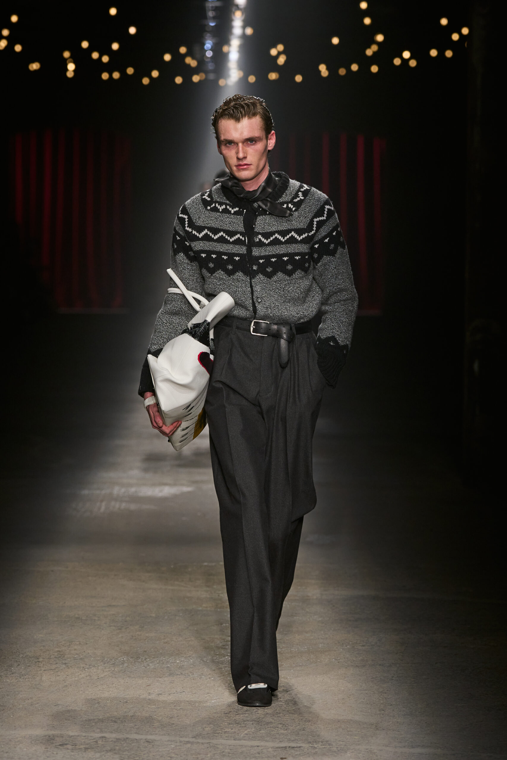 Comme dans un opéra où chaque détail sert la dramaturgie, Antonio Marras soigne les finitions. Des rubans cousus à la main, des broderies géométriques, des patchworks de tissus chinés et réassemblés : chaque geste rappelle la dimension artisanale et la quête d’authenticité au cœur de la maison. Les silhouettes masculines, tantôt minimalistes, tantôt théâtrales, mêlent kilts à carreaux et manteaux structurés, arborant un col rehaussé de broderies. Les accessoires, enfin, prolongent la narration : bottines ajourées, ceintures ornées de motifs végétaux et sacs brodés renouvellent le vocabulaire stylistique de la marque.