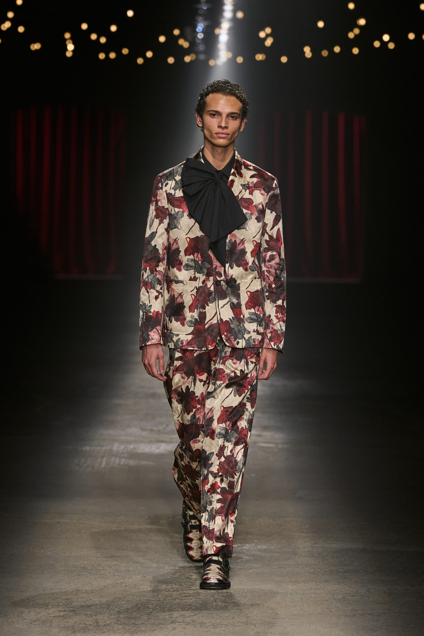 C’est cette même intensité que l’on retrouve dans les créations d’Antonio Marras, où l’hybridation des matières raconte la richesse narrative. Les tweeds, draps de laine, fil-à-fil et satins côtoient des jacquards ottomans et des brocarts damassés. Le créateur emprunte autant à l’esthétique sombre des mélodrames italiens qu’à l’énergie solaire de la culture catalane. De subtils motifs floraux, inspirés par les roses qui émaillent le récit, se déclinent en imprimés photographiques, en broderies délicates ou en flocking audacieux. Cette fusion d’inspirations multiples, magnifiée par des touches artisanales, confère à l’ensemble une aura de mystère et de raffinement.