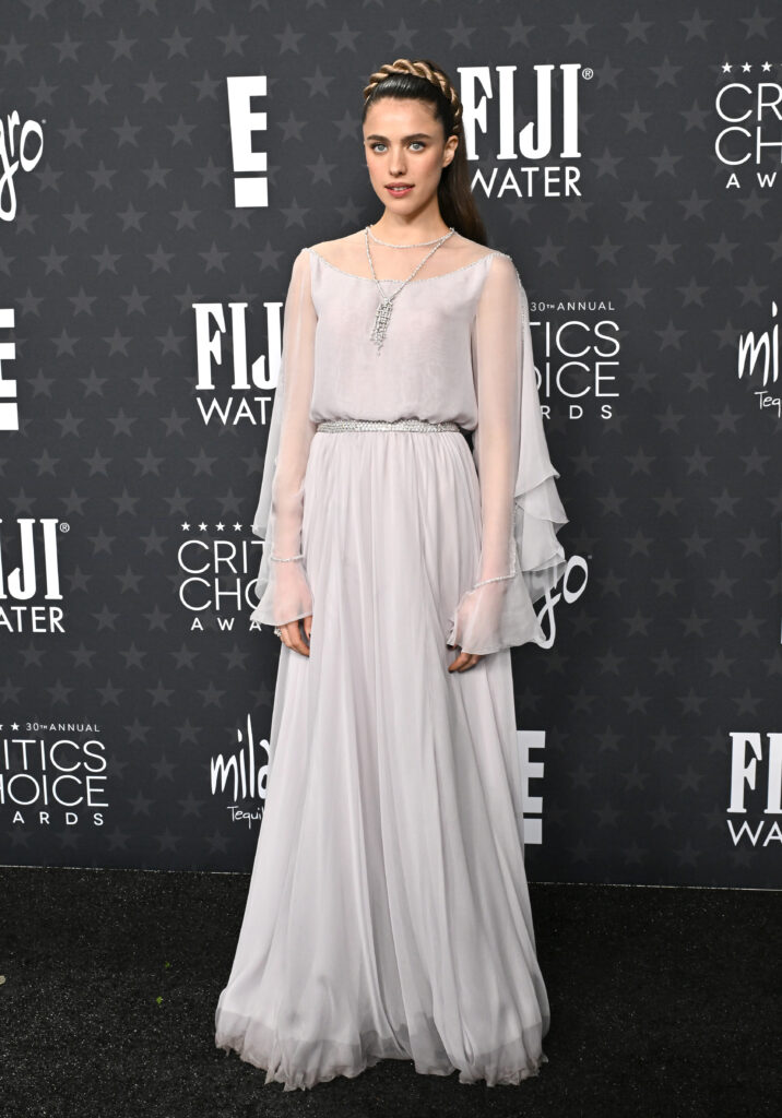 Ambassadrice de CHANEL et étoile montante du cinéma, Margaret Qualley a capté tous les regards en incarnant une féminité à la fois romantique et magnétique. Nommée dans la catégorie de la Meilleure actrice dans un second rôle pour sa performance dans Substance de Coralie Fargeat, l’actrice a choisi une robe longue en mousseline de soie lavande et tulle, où chaque mouvement révélait la fluidité d’un drapé aérien, sublimé par une ceinture et des galons brodés. Ce look 49, issu de la Collection CHANEL Haute Couture Printemps-Été 2025, témoigne de l’excellence du savoir-faire artisanal de la maison, où la délicatesse des textures s’allie à la rigueur des coupes.