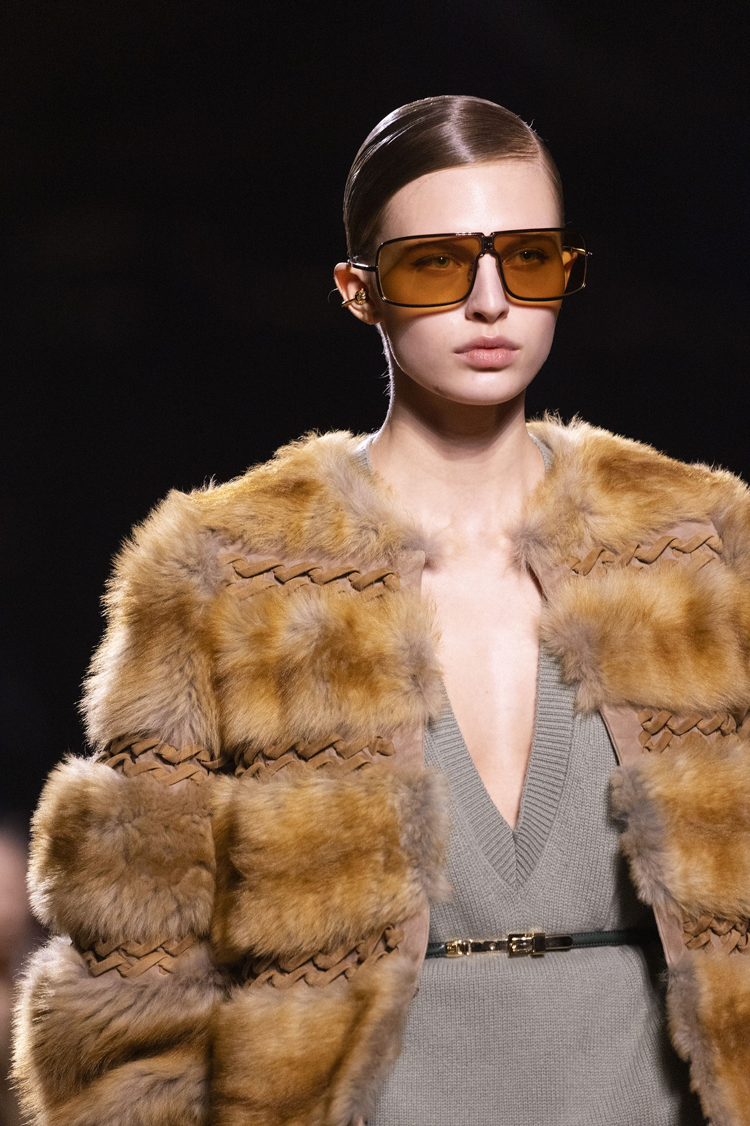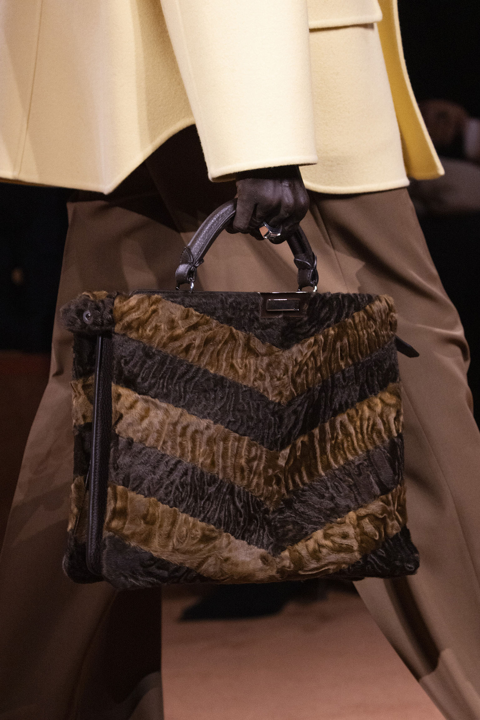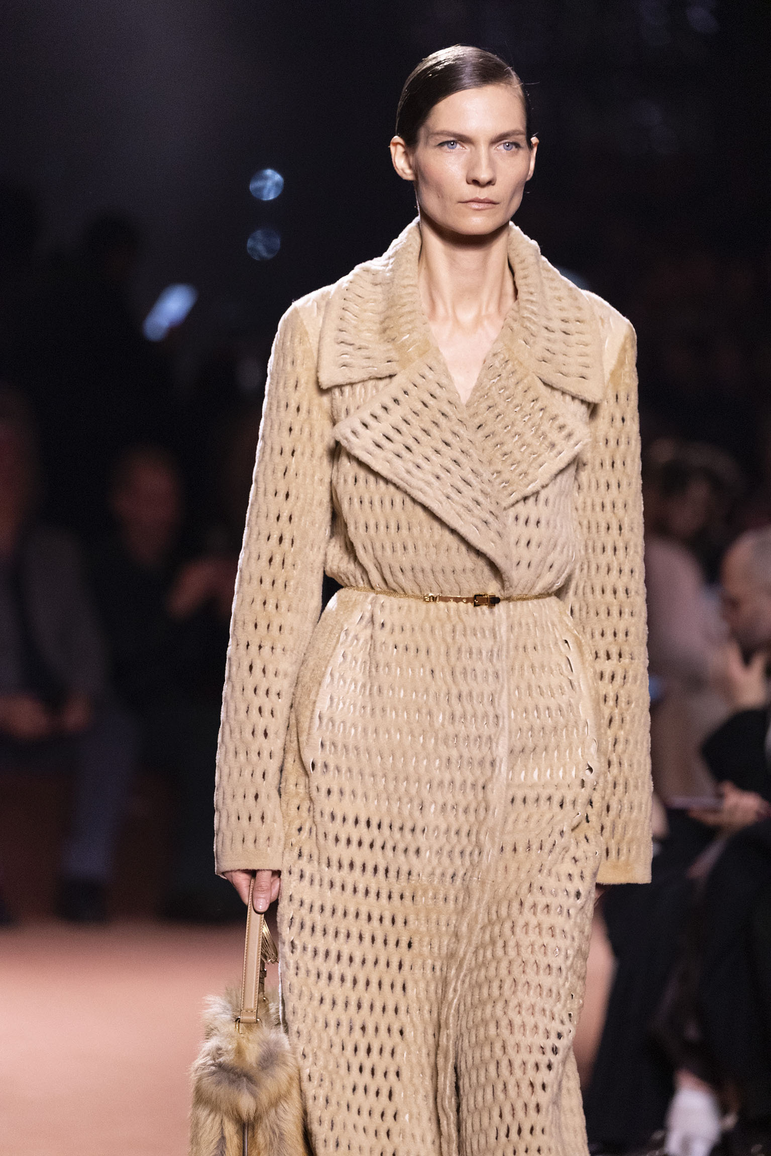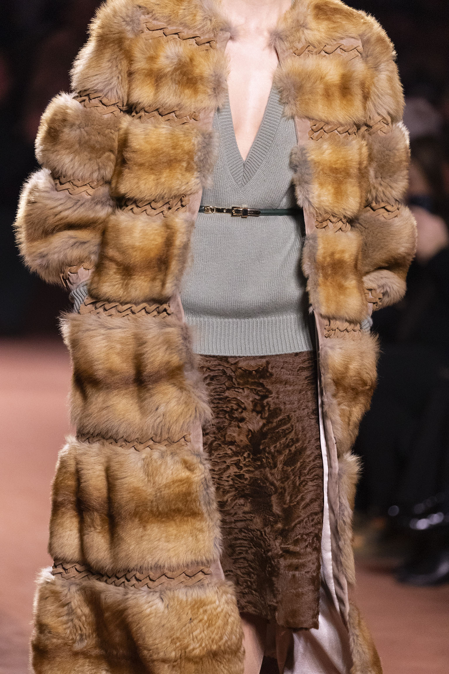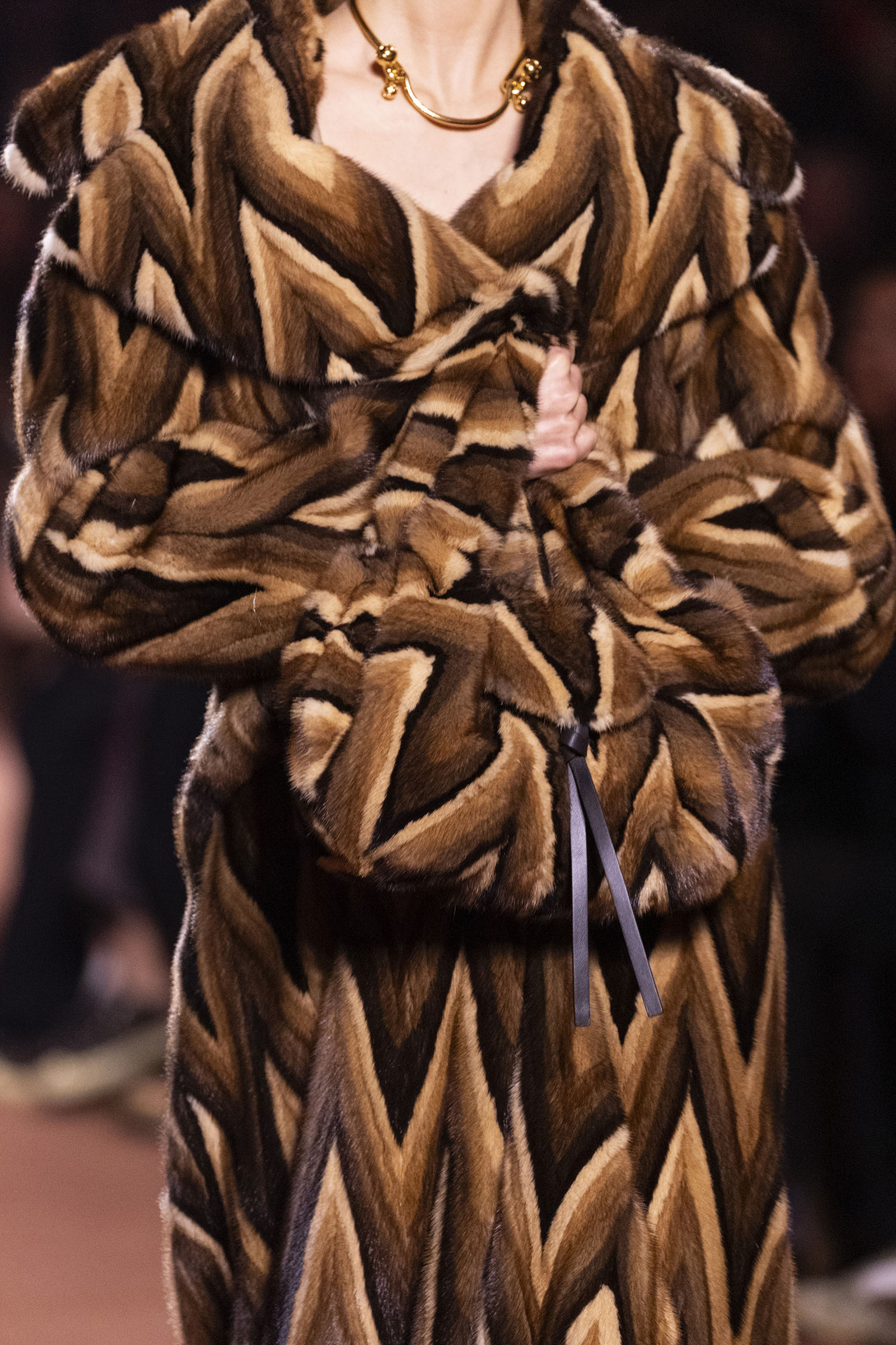 La collection Women’s and Men’s Fall/Winter 2025-26, véritable célébration du centenaire, se révèle être une fresque audacieuse où se mêlent textures, couleurs et techniques ancestrales. Dès le premier regard, les silhouettes dévoilent une symphonie de matières qui évoquent les métamorphoses du temps. Une attention particulière est portée aux textures primordiales qui, à travers des effets tels que le marbre plissé, le rib knit ou encore l’intarsia appliquée sur la shearling, font revivre l’allure des grandes heures de la Maison. Le flacon d’un manteau ample, par exemple, se mue en une robe contemporaine grâce à un col relevé et une taille cintrée par une ceinture en or fin, rappelant ainsi la dualité entre force et délicatesse. Cette dualité, chère à l’ADN de Fendi, se retrouve également dans l’utilisation de techniques ancestrales comme le Gheronato patchwork, appliquées sur des matériaux qui évoquent tour à tour le renard, la vison ou le zibellino, sans pour autant se limiter aux contraintes du réel.