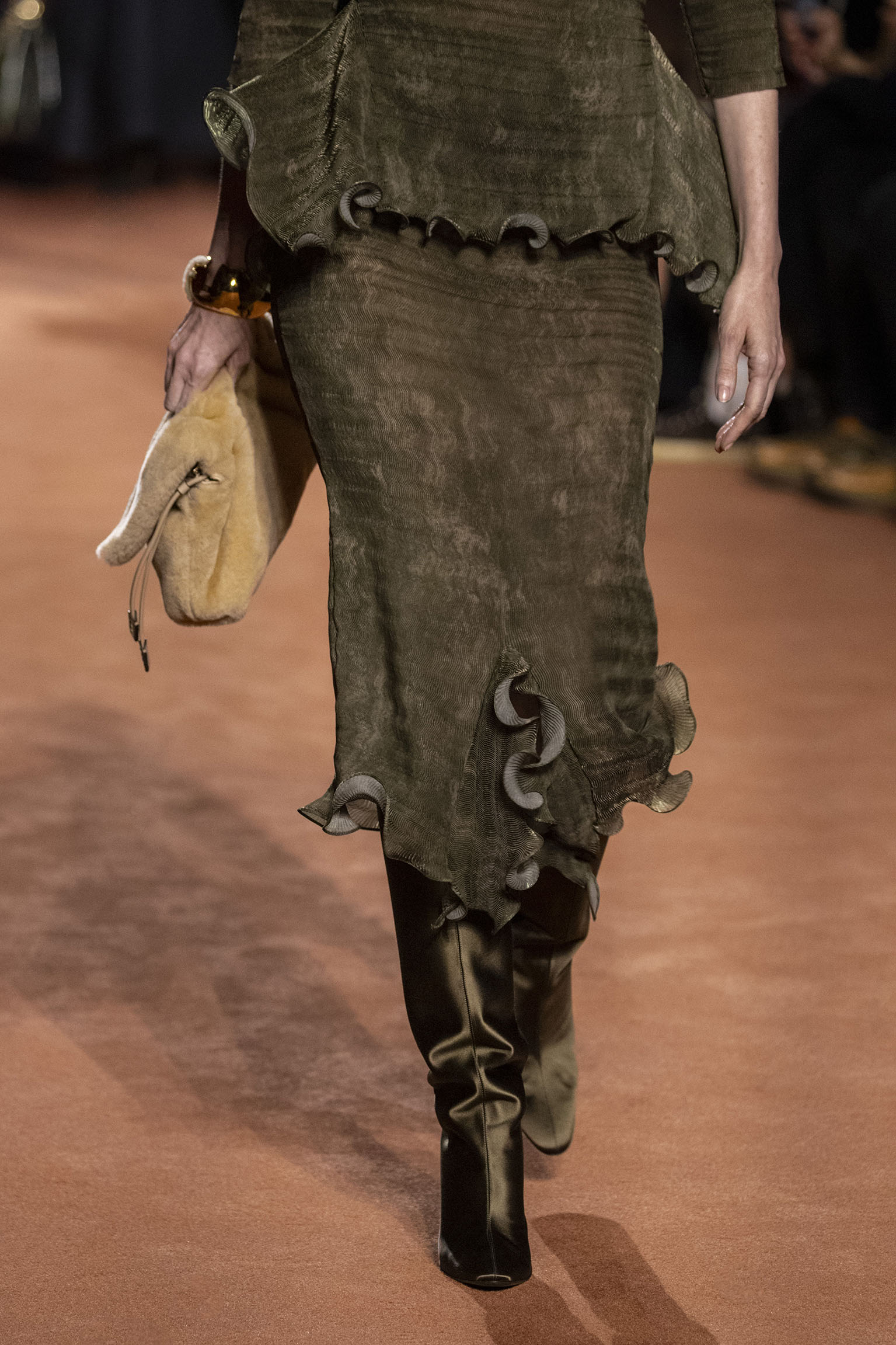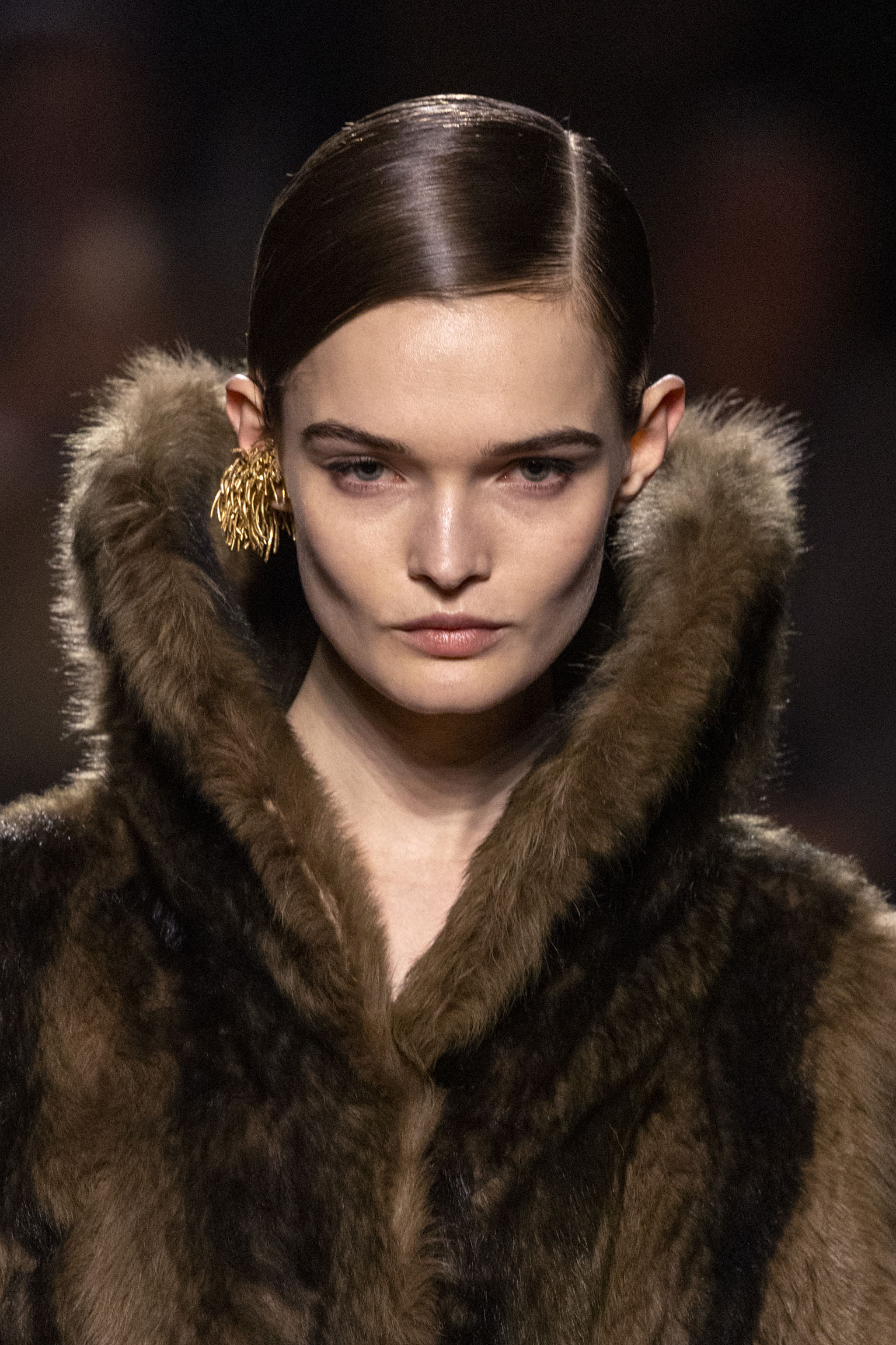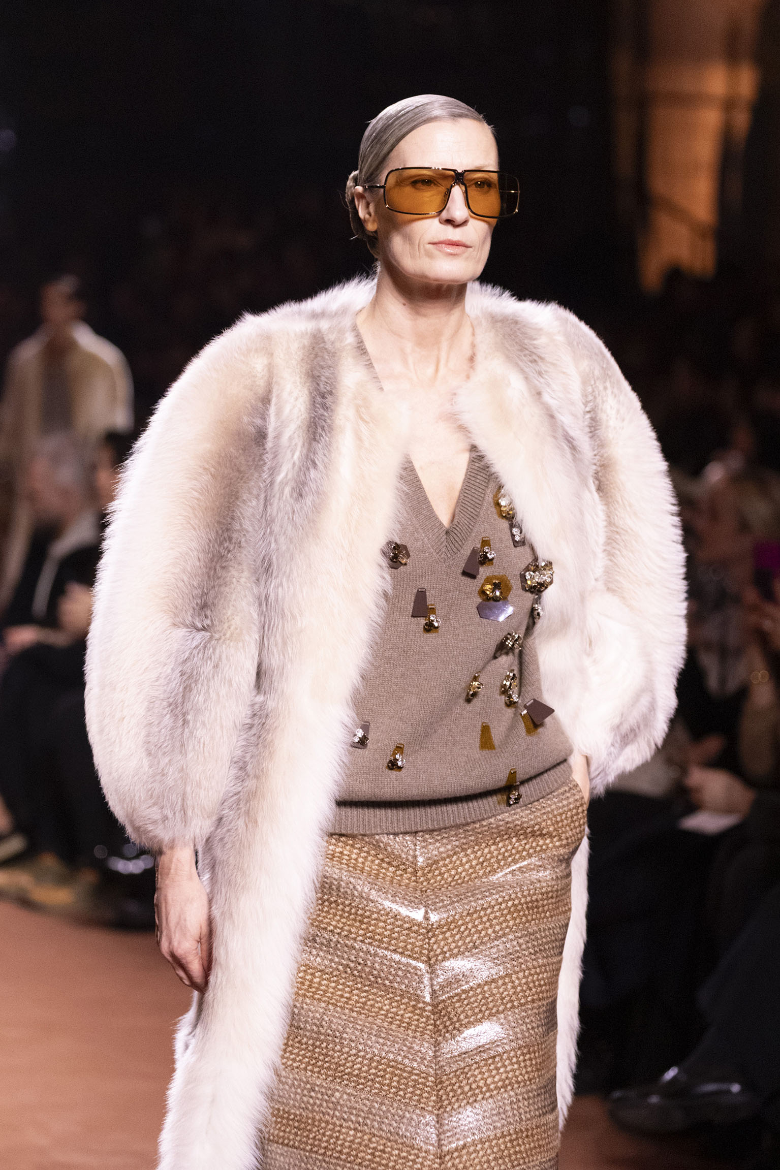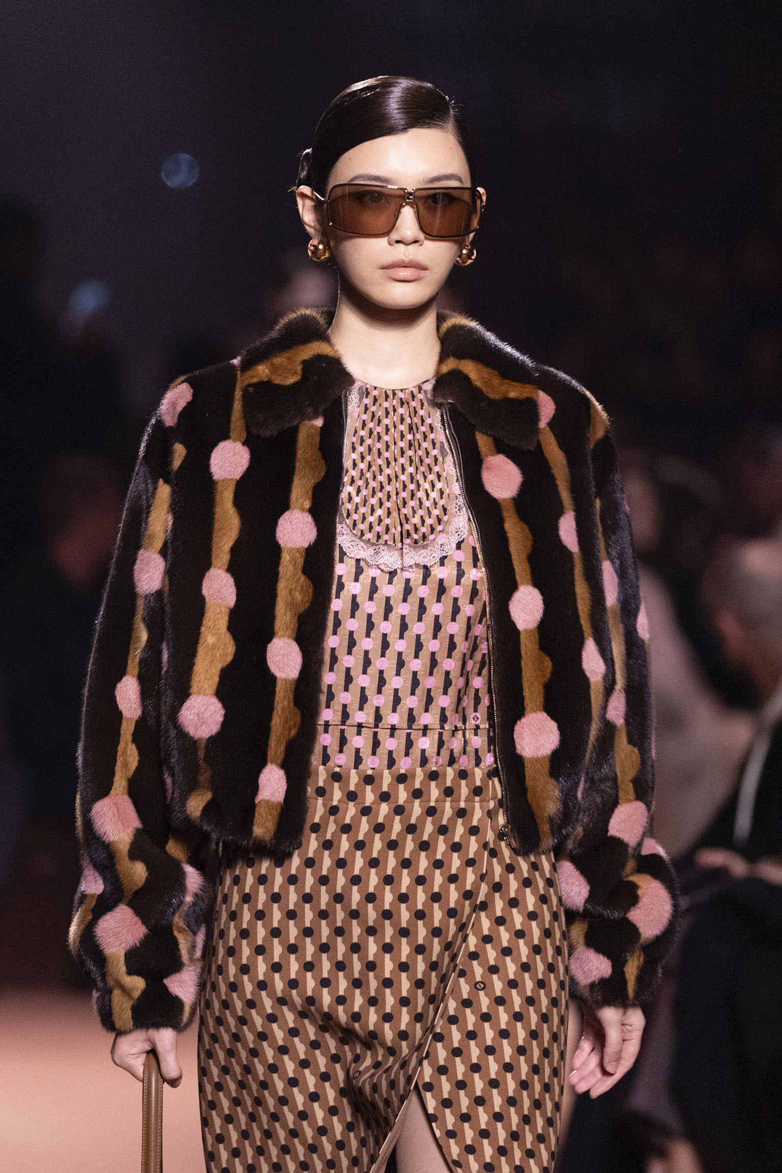 La collection Women’s and Men’s Fall/Winter 2025-26, véritable célébration du centenaire, se révèle être une fresque audacieuse où se mêlent textures, couleurs et techniques ancestrales. Dès le premier regard, les silhouettes dévoilent une symphonie de matières qui évoquent les métamorphoses du temps. Une attention particulière est portée aux textures primordiales qui, à travers des effets tels que le marbre plissé, le rib knit ou encore l’intarsia appliquée sur la shearling, font revivre l’allure des grandes heures de la Maison. Le flacon d’un manteau ample, par exemple, se mue en une robe contemporaine grâce à un col relevé et une taille cintrée par une ceinture en or fin, rappelant ainsi la dualité entre force et délicatesse. Cette dualité, chère à l’ADN de Fendi, se retrouve également dans l’utilisation de techniques ancestrales comme le Gheronato patchwork, appliquées sur des matériaux qui évoquent tour à tour le renard, la vison ou le zibellino, sans pour autant se limiter aux contraintes du réel.
