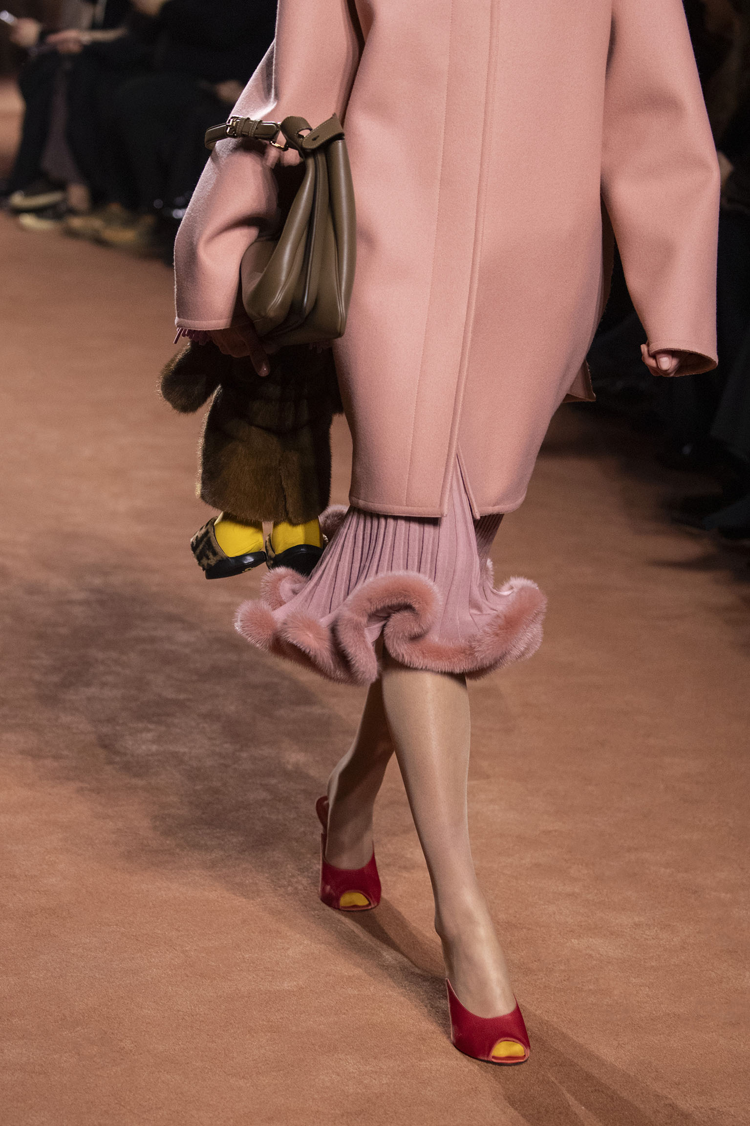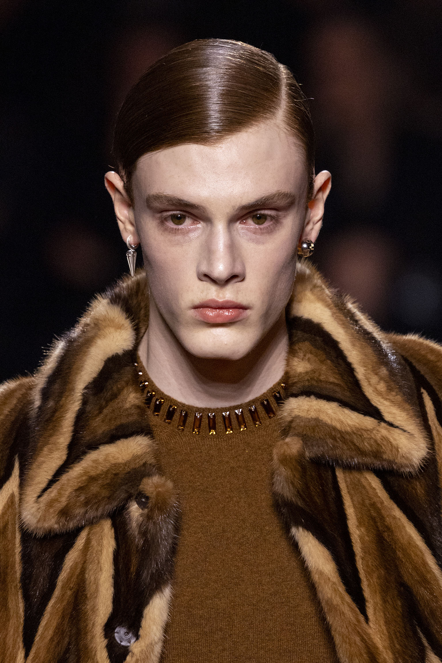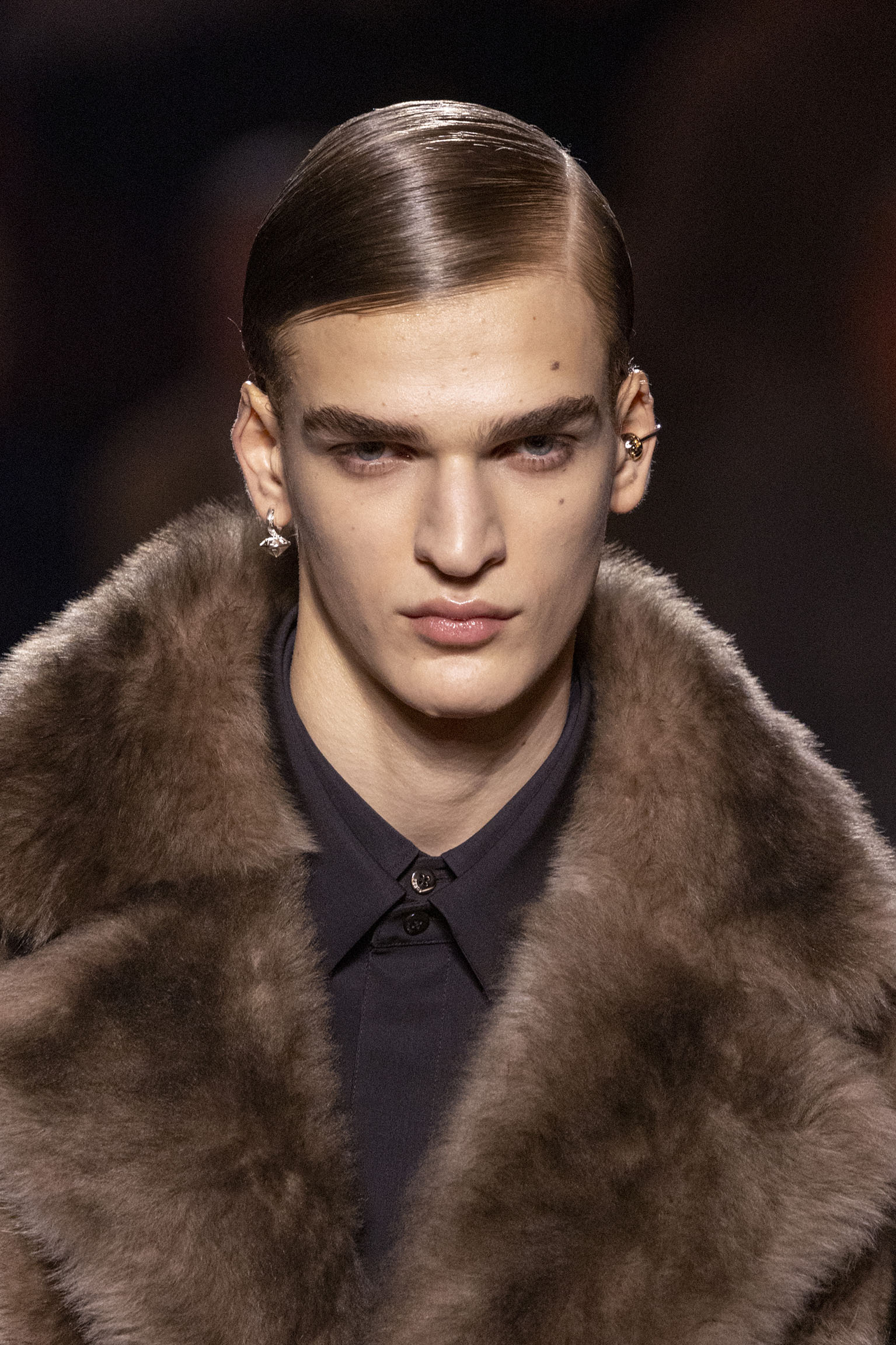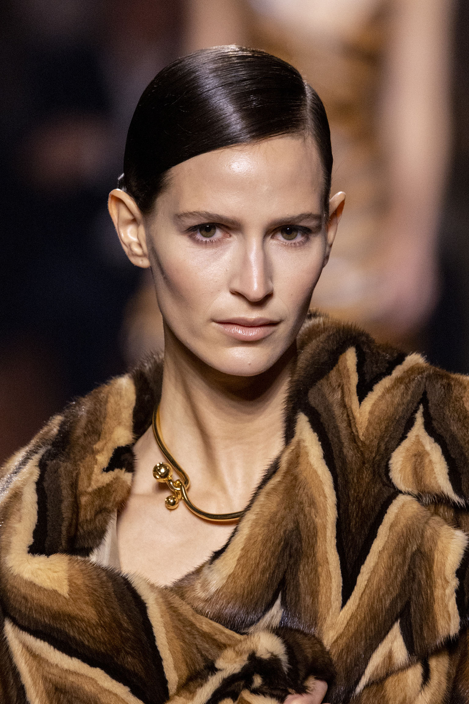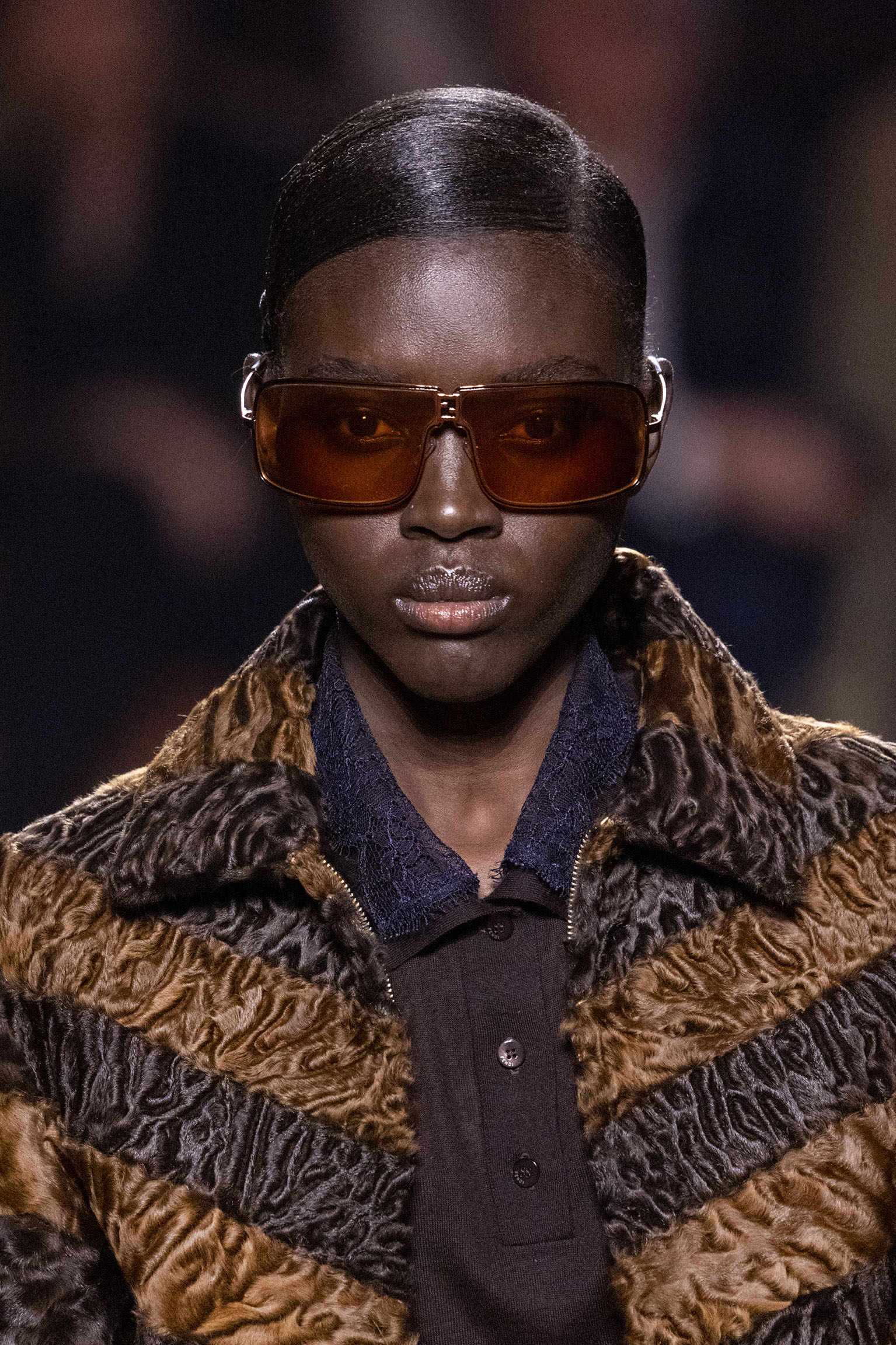 La collection Women’s and Men’s Fall/Winter 2025-26, véritable célébration du centenaire, se révèle être une fresque audacieuse où se mêlent textures, couleurs et techniques ancestrales. Dès le premier regard, les silhouettes dévoilent une symphonie de matières qui évoquent les métamorphoses du temps. Une attention particulière est portée aux textures primordiales qui, à travers des effets tels que le marbre plissé, le rib knit ou encore l’intarsia appliquée sur la shearling, font revivre l’allure des grandes heures de la Maison. Le flacon d’un manteau ample, par exemple, se mue en une robe contemporaine grâce à un col relevé et une taille cintrée par une ceinture en or fin, rappelant ainsi la dualité entre force et délicatesse. Cette dualité, chère à l’ADN de Fendi, se retrouve également dans l’utilisation de techniques ancestrales comme le Gheronato patchwork, appliquées sur des matériaux qui évoquent tour à tour le renard, la vison ou le zibellino, sans pour autant se limiter aux contraintes du réel.