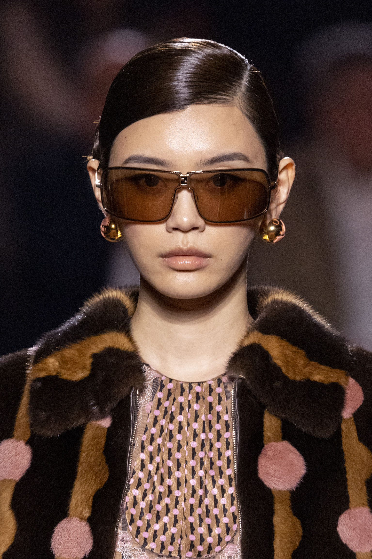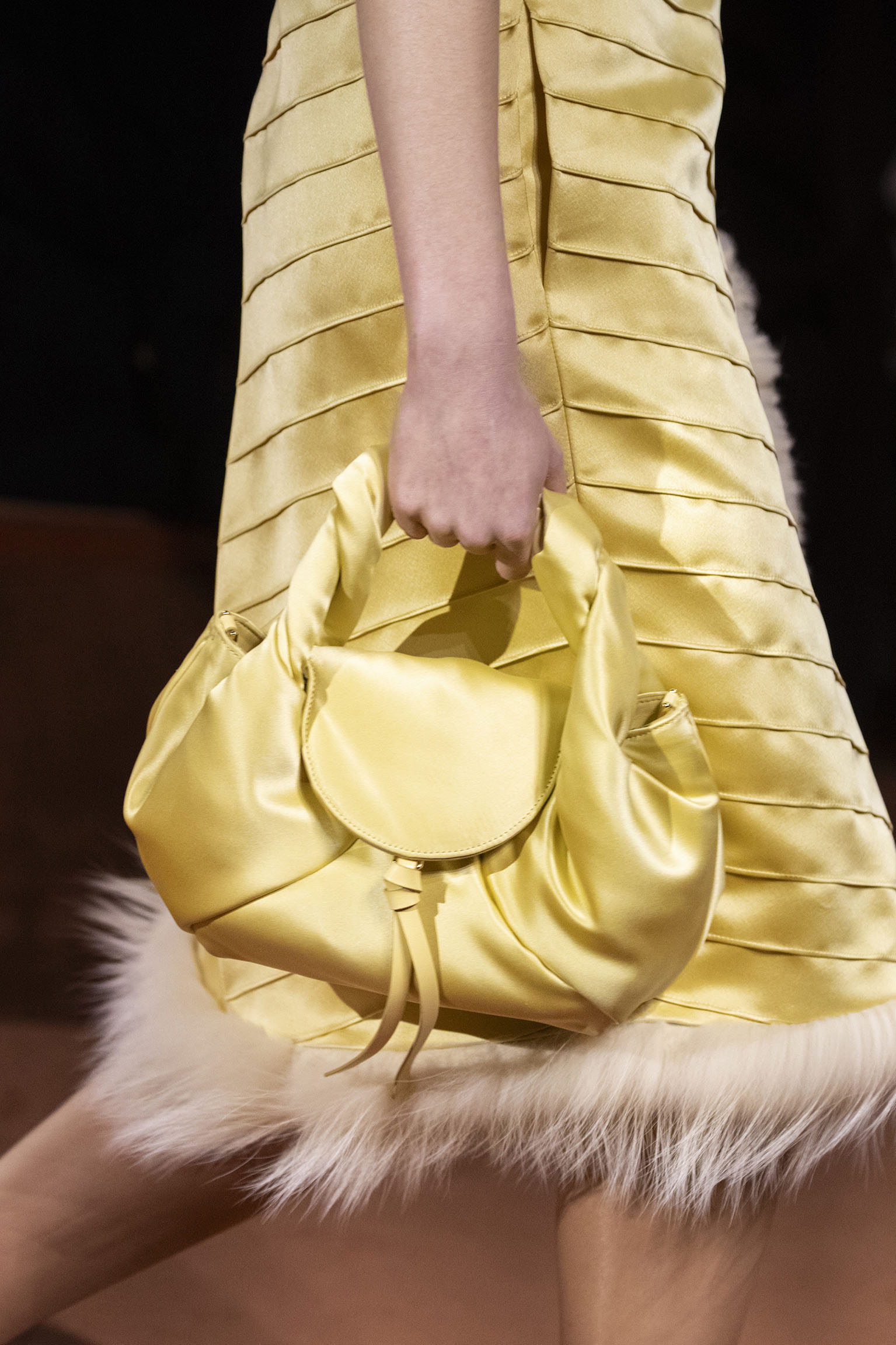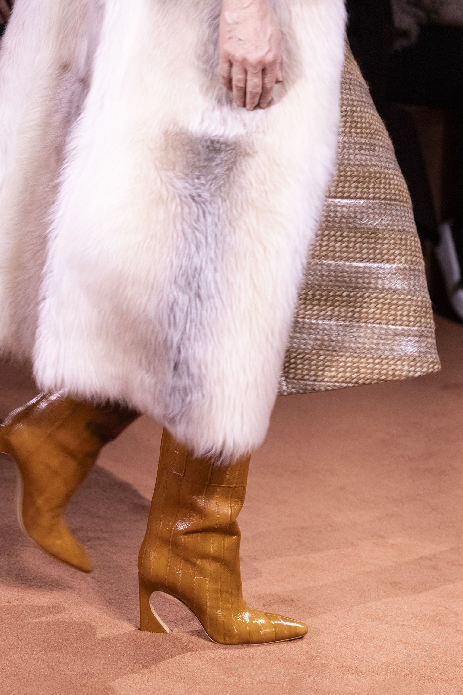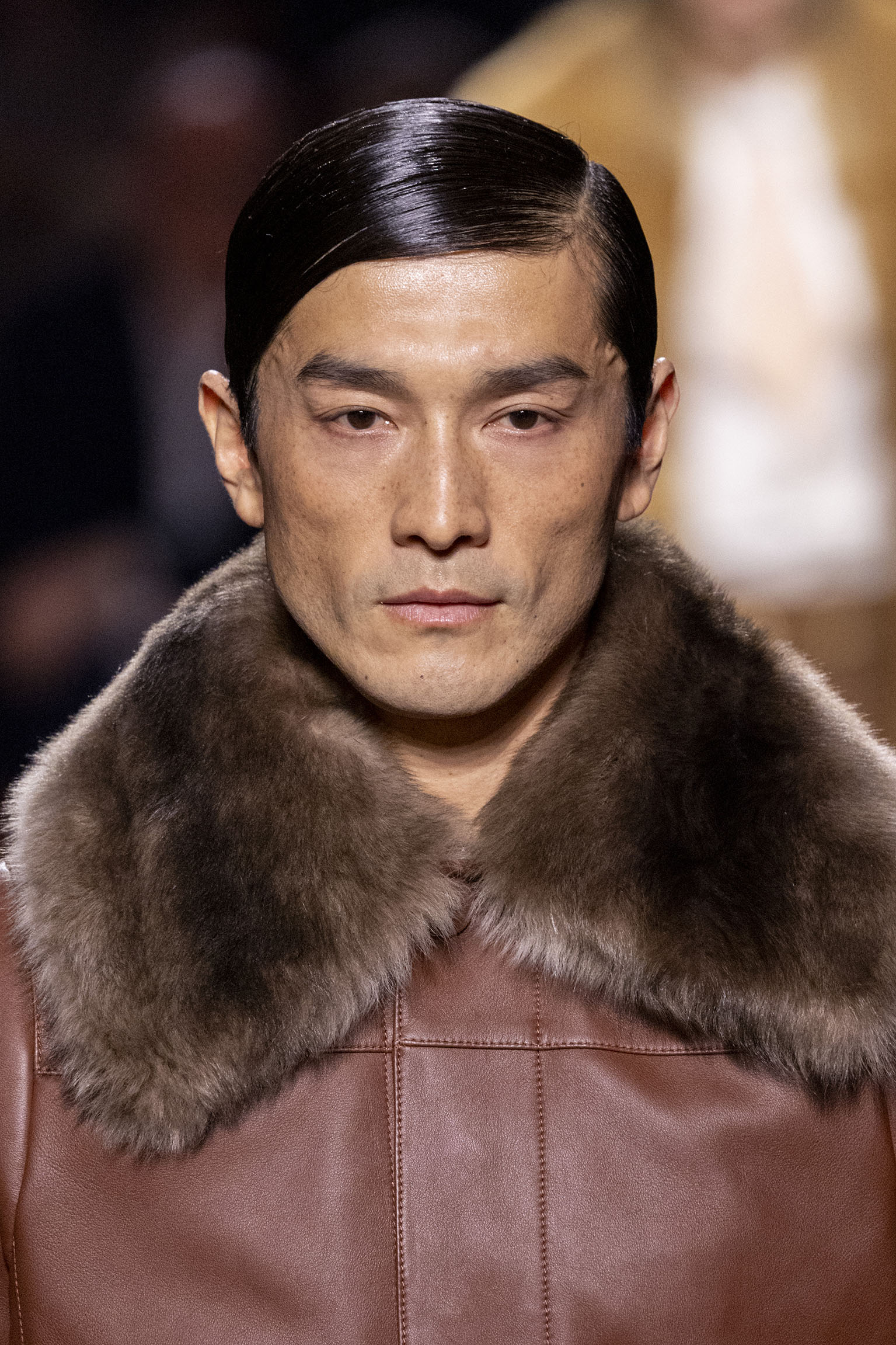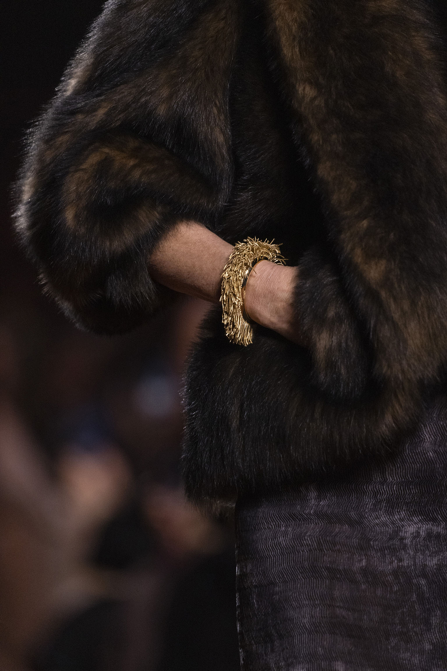 La collection Women’s and Men’s Fall/Winter 2025-26, véritable célébration du centenaire, se révèle être une fresque audacieuse où se mêlent textures, couleurs et techniques ancestrales. Dès le premier regard, les silhouettes dévoilent une symphonie de matières qui évoquent les métamorphoses du temps. Une attention particulière est portée aux textures primordiales qui, à travers des effets tels que le marbre plissé, le rib knit ou encore l’intarsia appliquée sur la shearling, font revivre l’allure des grandes heures de la Maison. Le flacon d’un manteau ample, par exemple, se mue en une robe contemporaine grâce à un col relevé et une taille cintrée par une ceinture en or fin, rappelant ainsi la dualité entre force et délicatesse. Cette dualité, chère à l’ADN de Fendi, se retrouve également dans l’utilisation de techniques ancestrales comme le Gheronato patchwork, appliquées sur des matériaux qui évoquent tour à tour le renard, la vison ou le zibellino, sans pour autant se limiter aux contraintes du réel.
