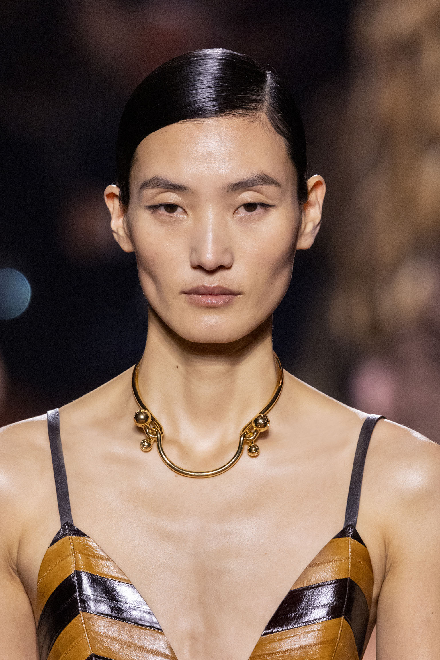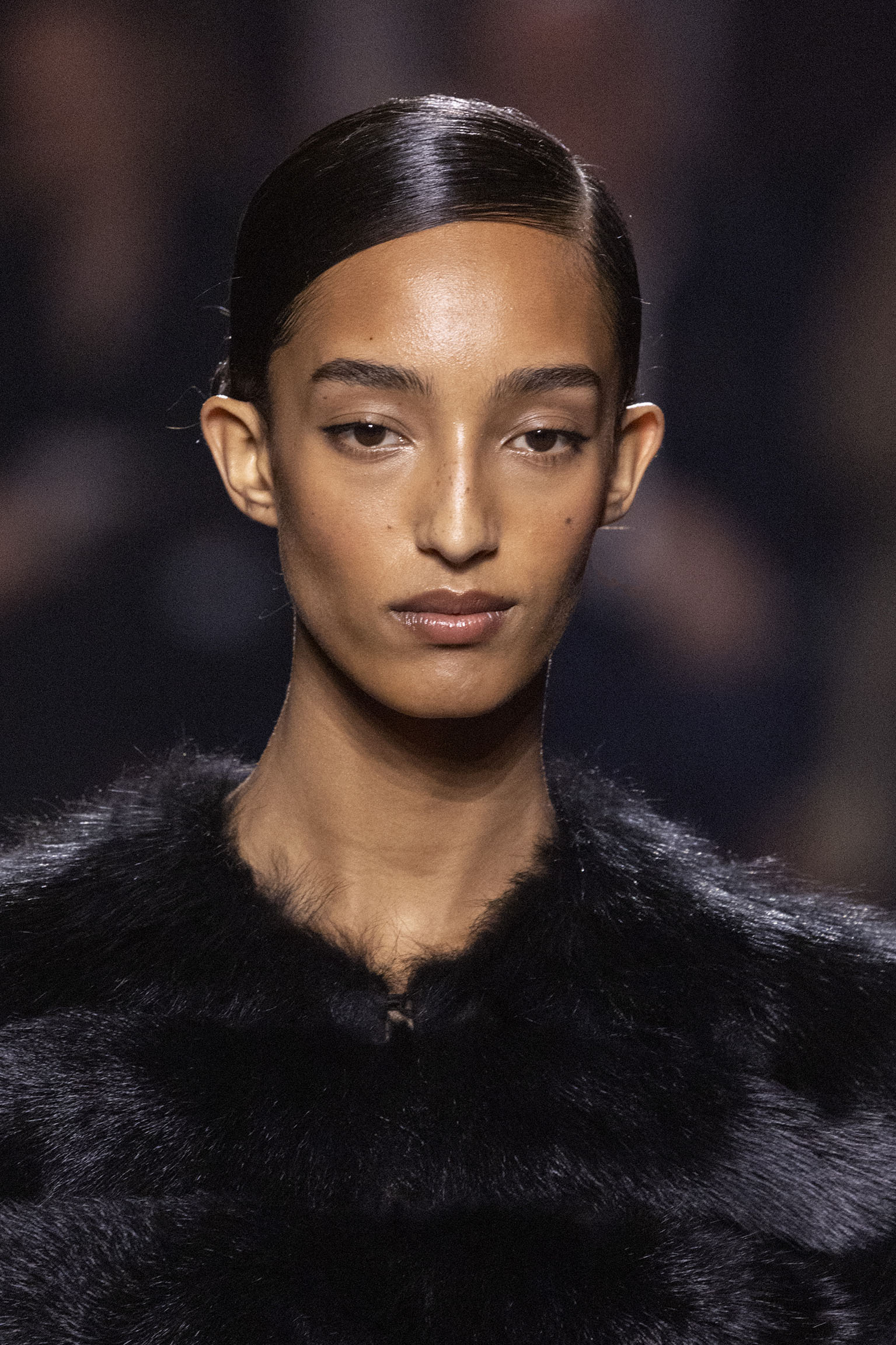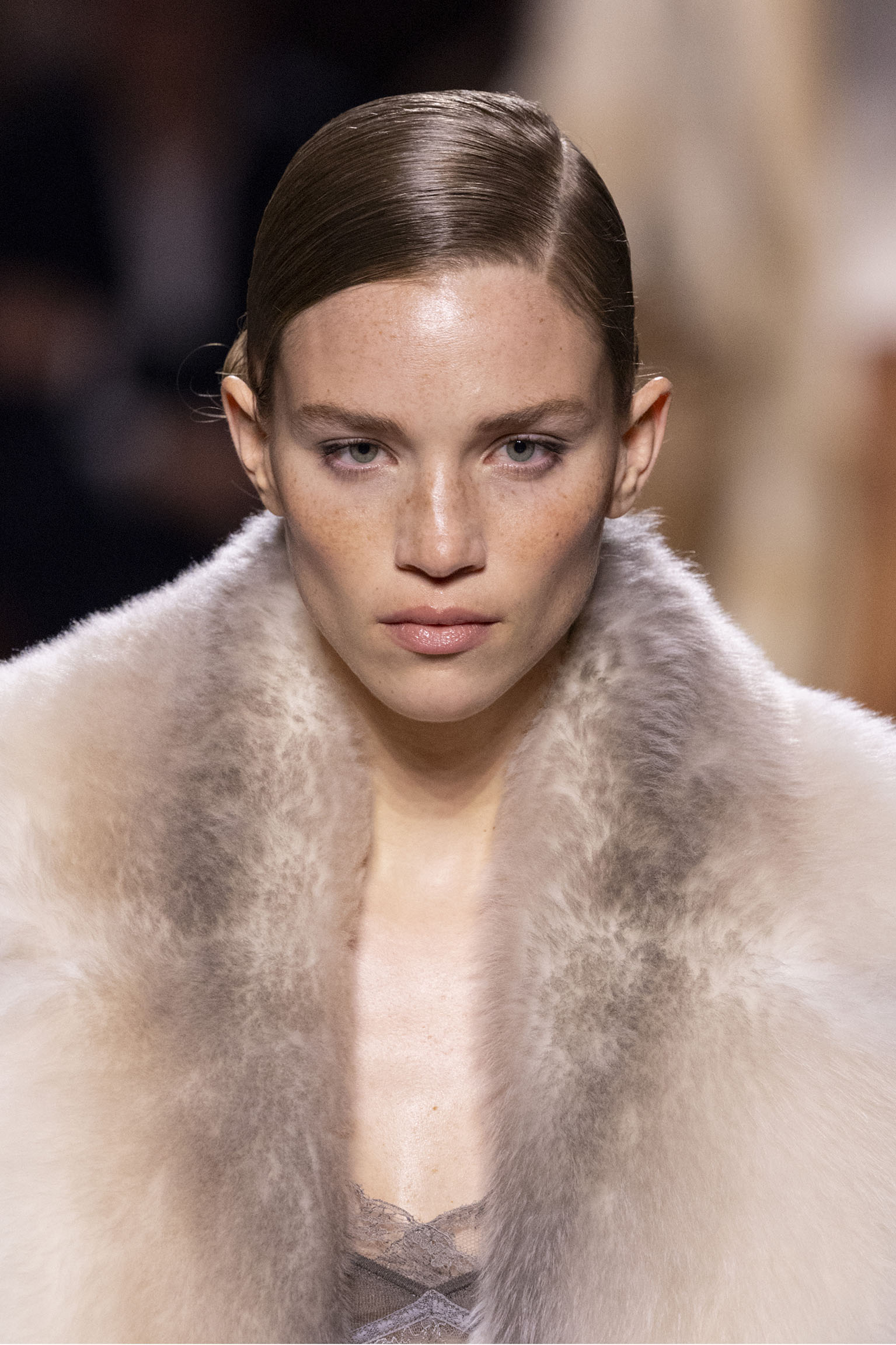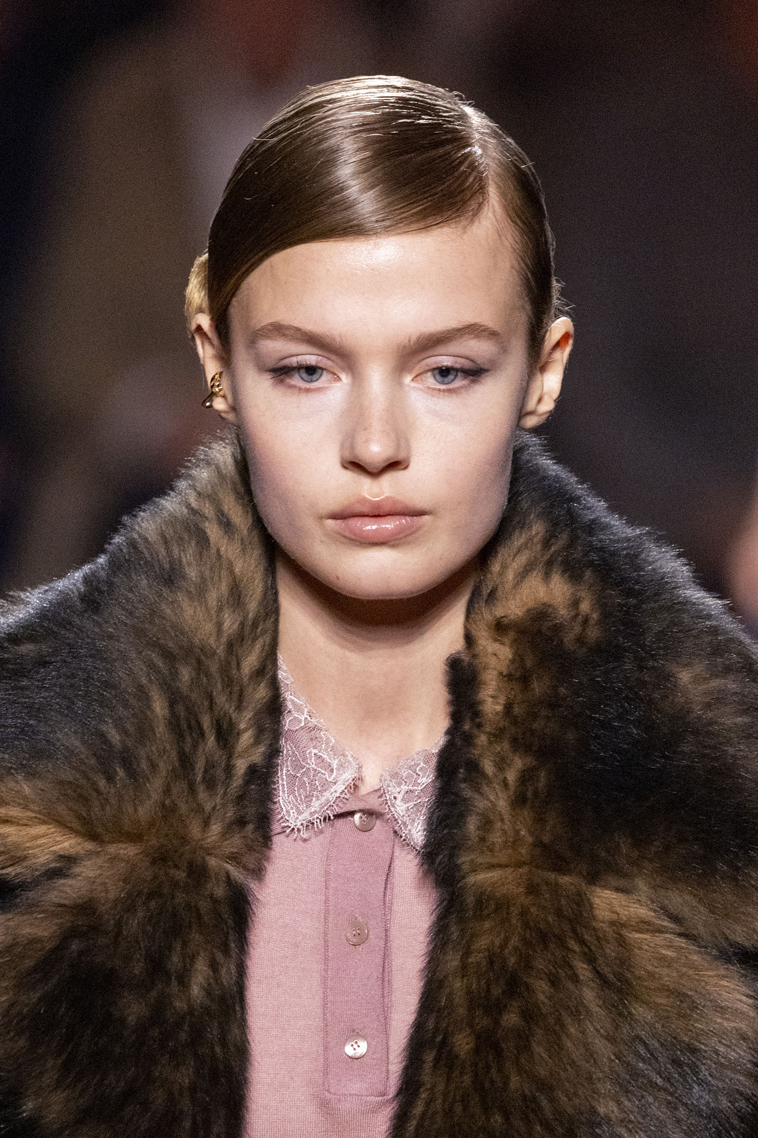La collection Women’s and Men’s Fall/Winter 2025-26, véritable célébration du centenaire, se révèle être une fresque audacieuse où se mêlent textures, couleurs et techniques ancestrales. Dès le premier regard, les silhouettes dévoilent une symphonie de matières qui évoquent les métamorphoses du temps. Une attention particulière est portée aux textures primordiales qui, à travers des effets tels que le marbre plissé, le rib knit ou encore l’intarsia appliquée sur la shearling, font revivre l’allure des grandes heures de la Maison. Le flacon d’un manteau ample, par exemple, se mue en une robe contemporaine grâce à un col relevé et une taille cintrée par une ceinture en or fin, rappelant ainsi la dualité entre force et délicatesse. Cette dualité, chère à l’ADN de Fendi, se retrouve également dans l’utilisation de techniques ancestrales comme le Gheronato patchwork, appliquées sur des matériaux qui évoquent tour à tour le renard, la vison ou le zibellino, sans pour autant se limiter aux contraintes du réel.